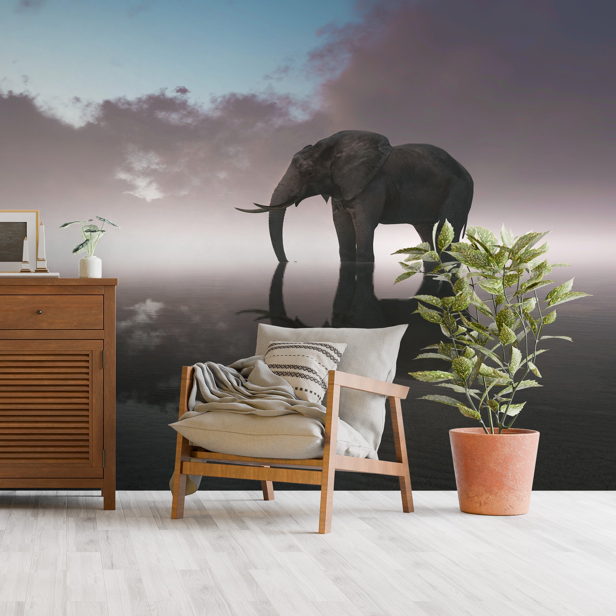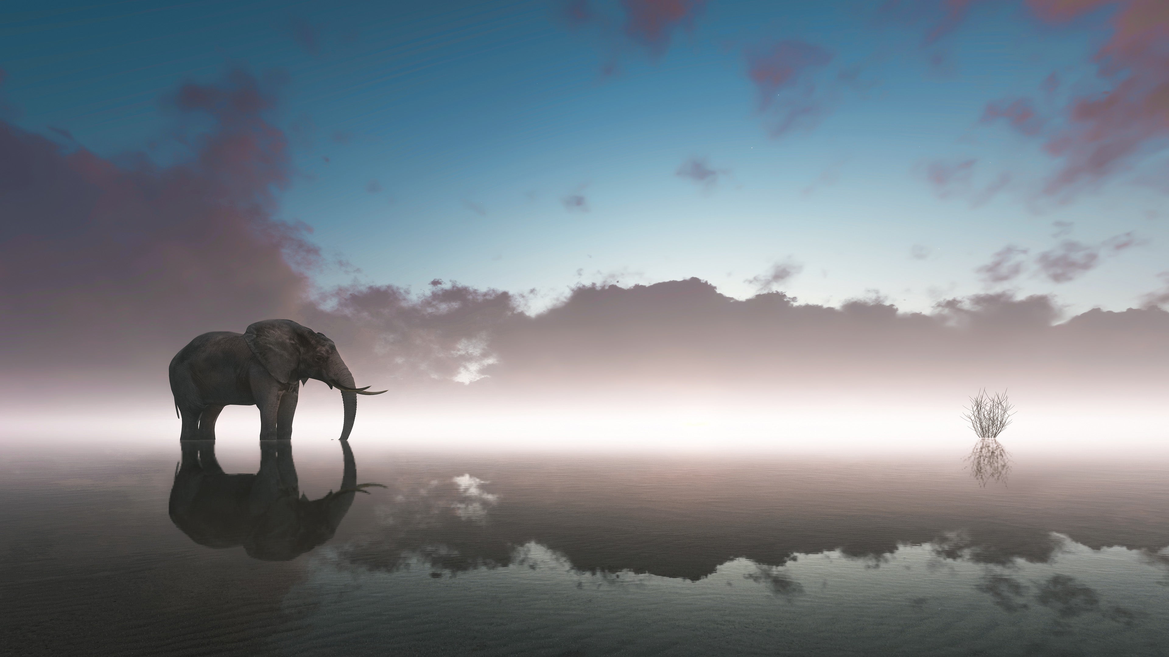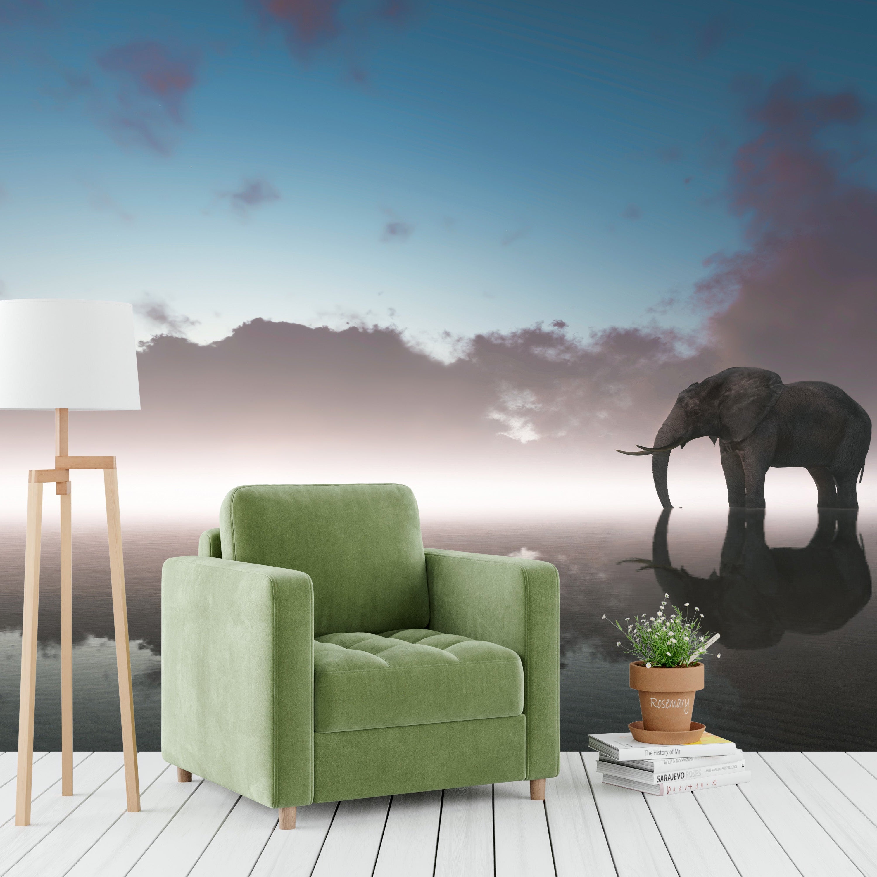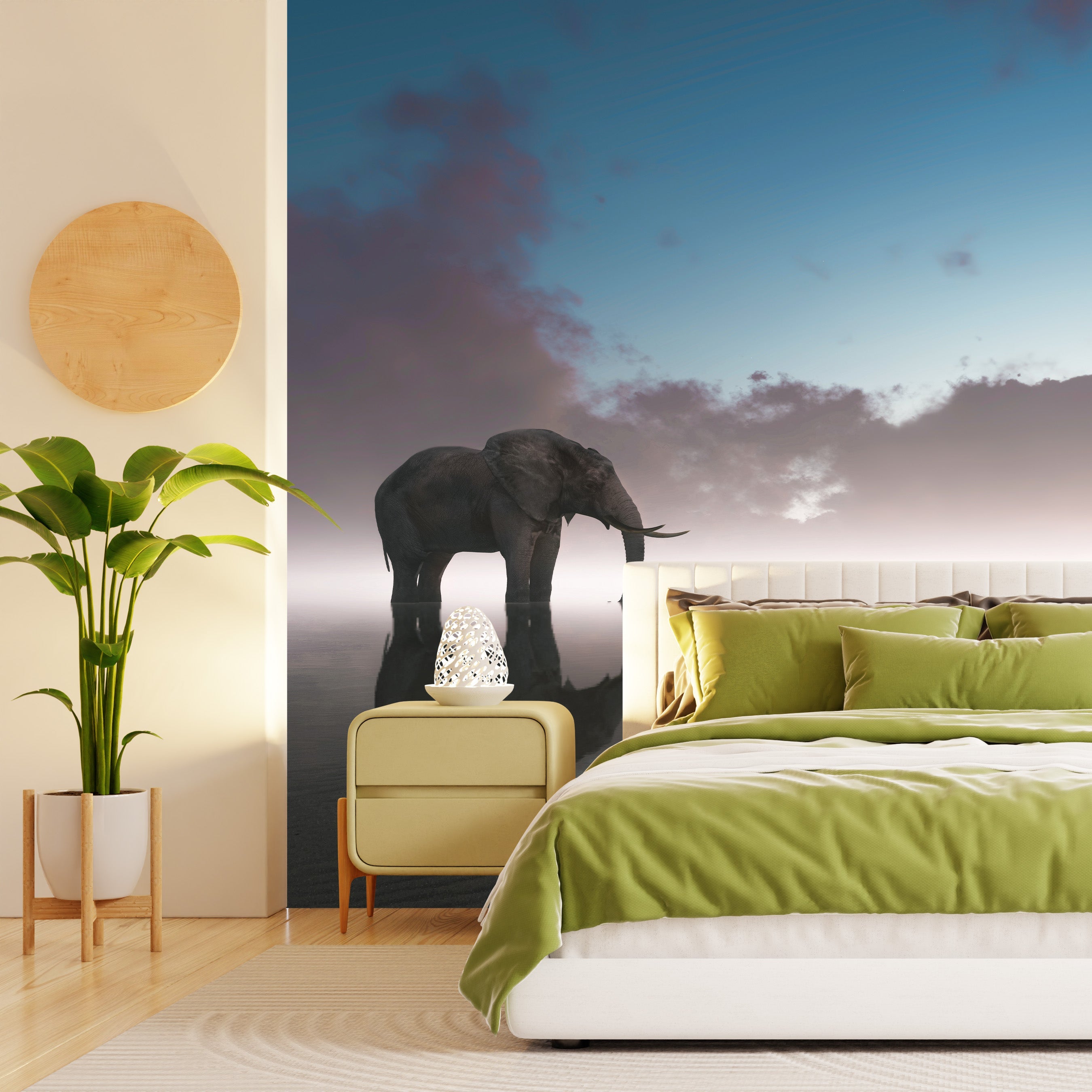 An elephant stands in shallow water, its reflection mirroring a misty, dreamlike sky, evoking a sense of serenity and solitude