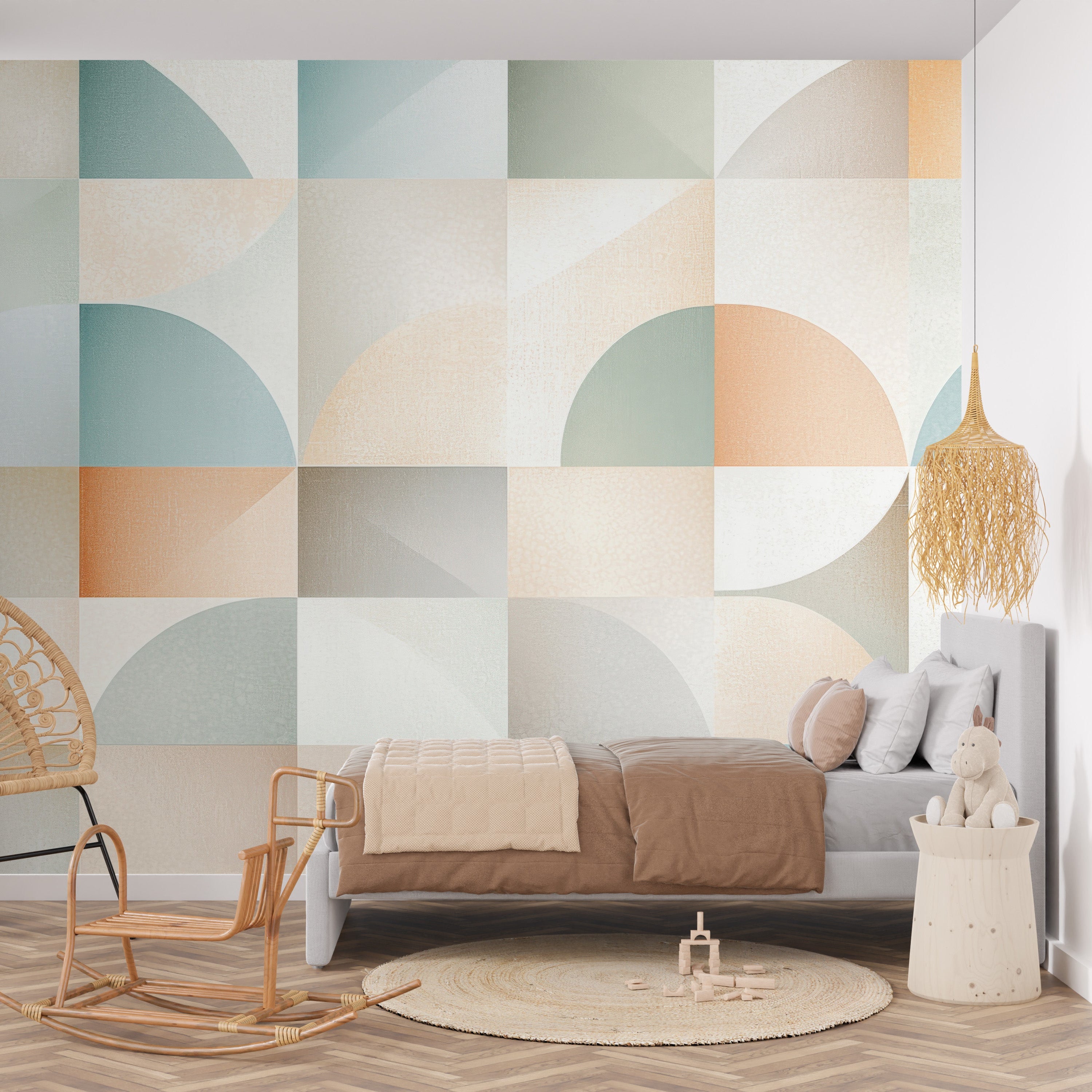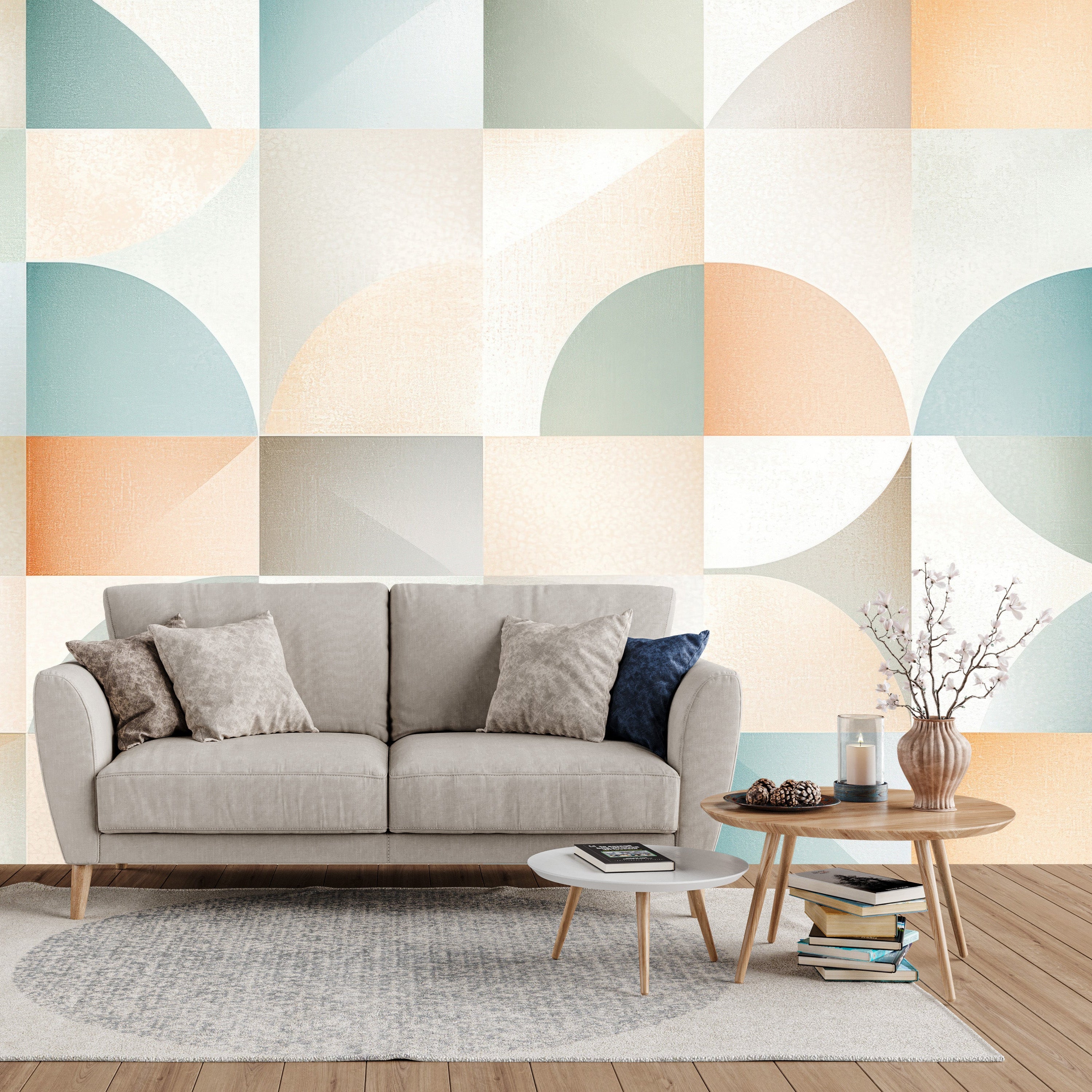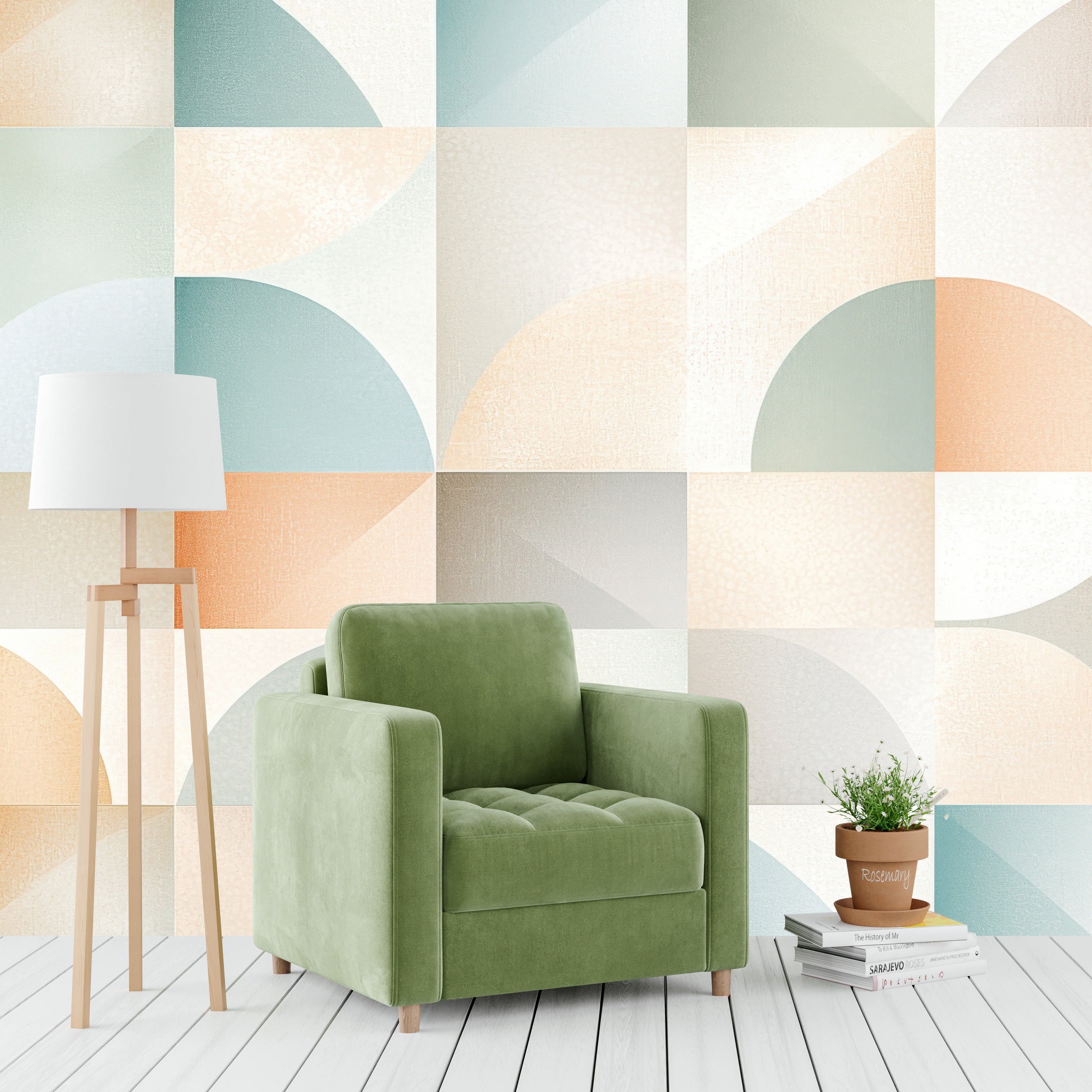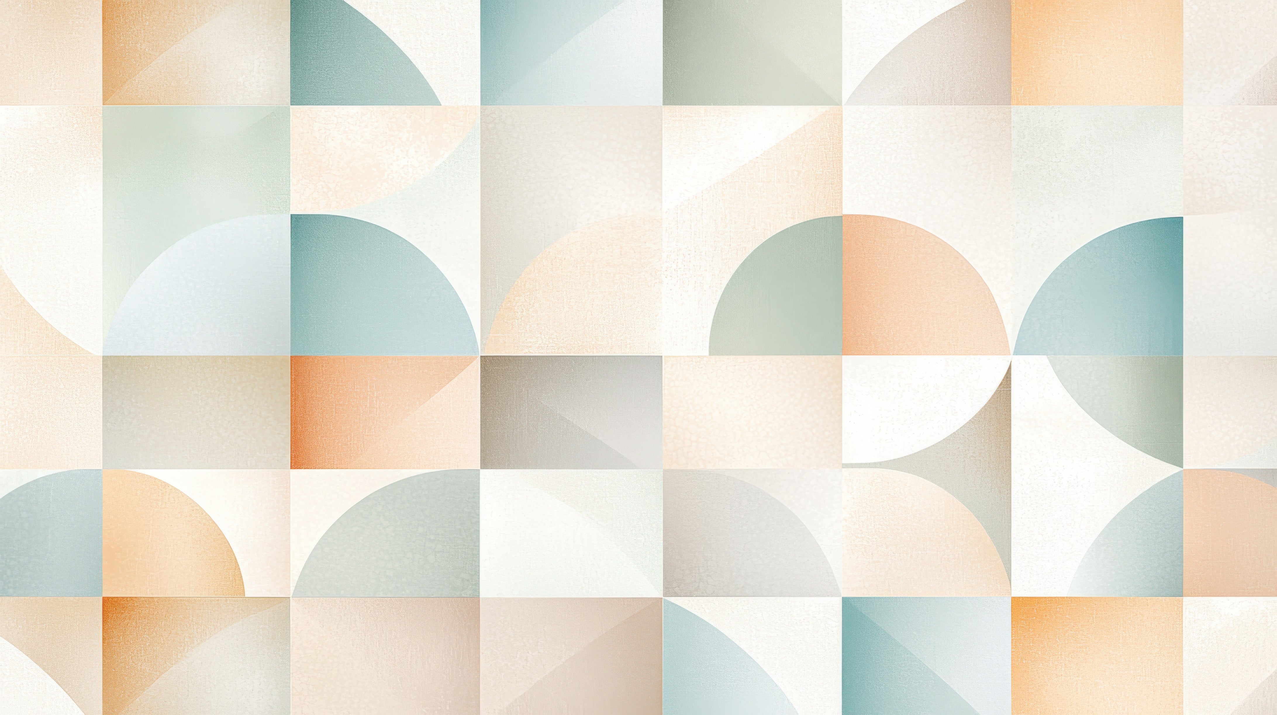 A structured grid of soft pastel squares and semi-circles, crafting a harmonious interplay of shape, color, and gentle texture in a serene, geometric pattern