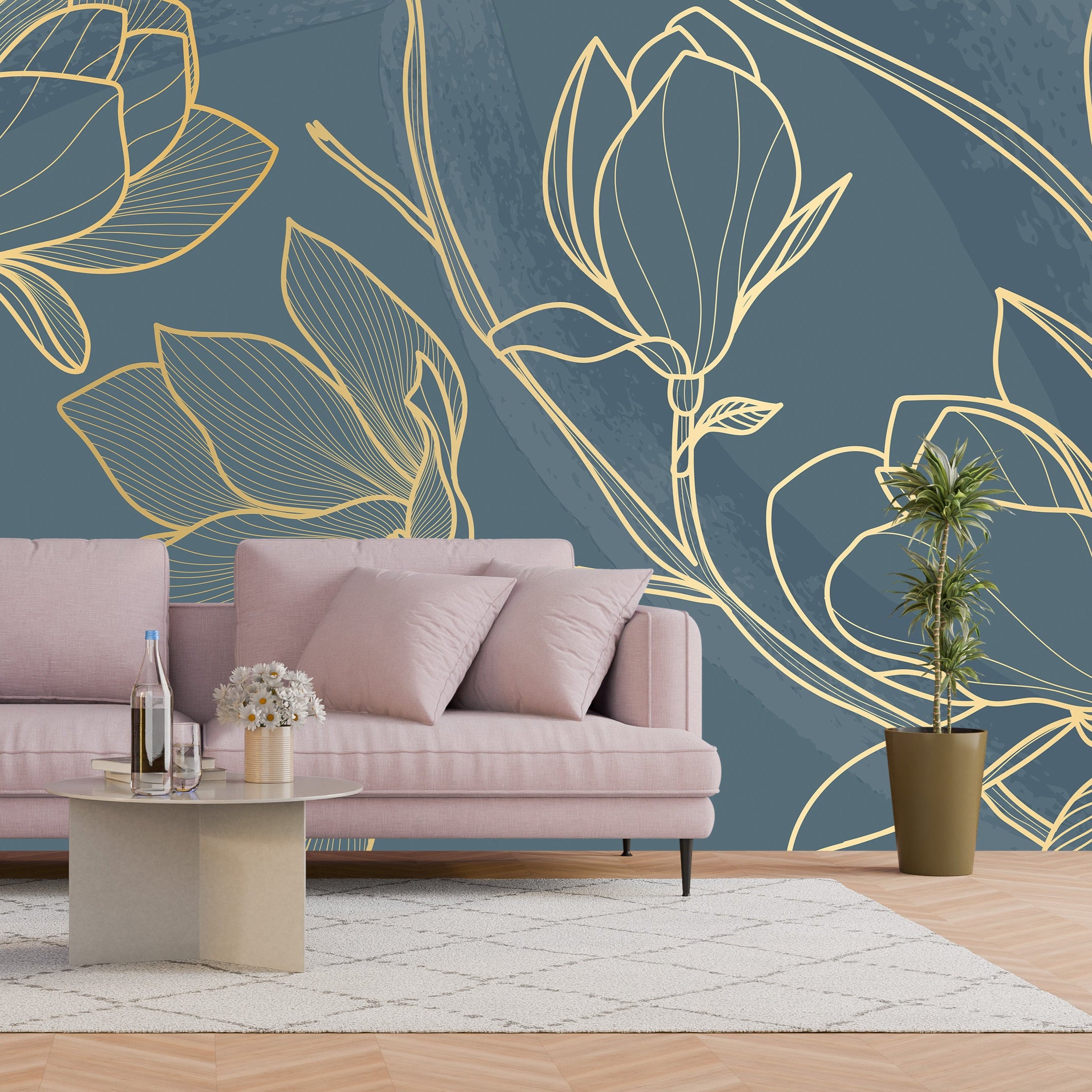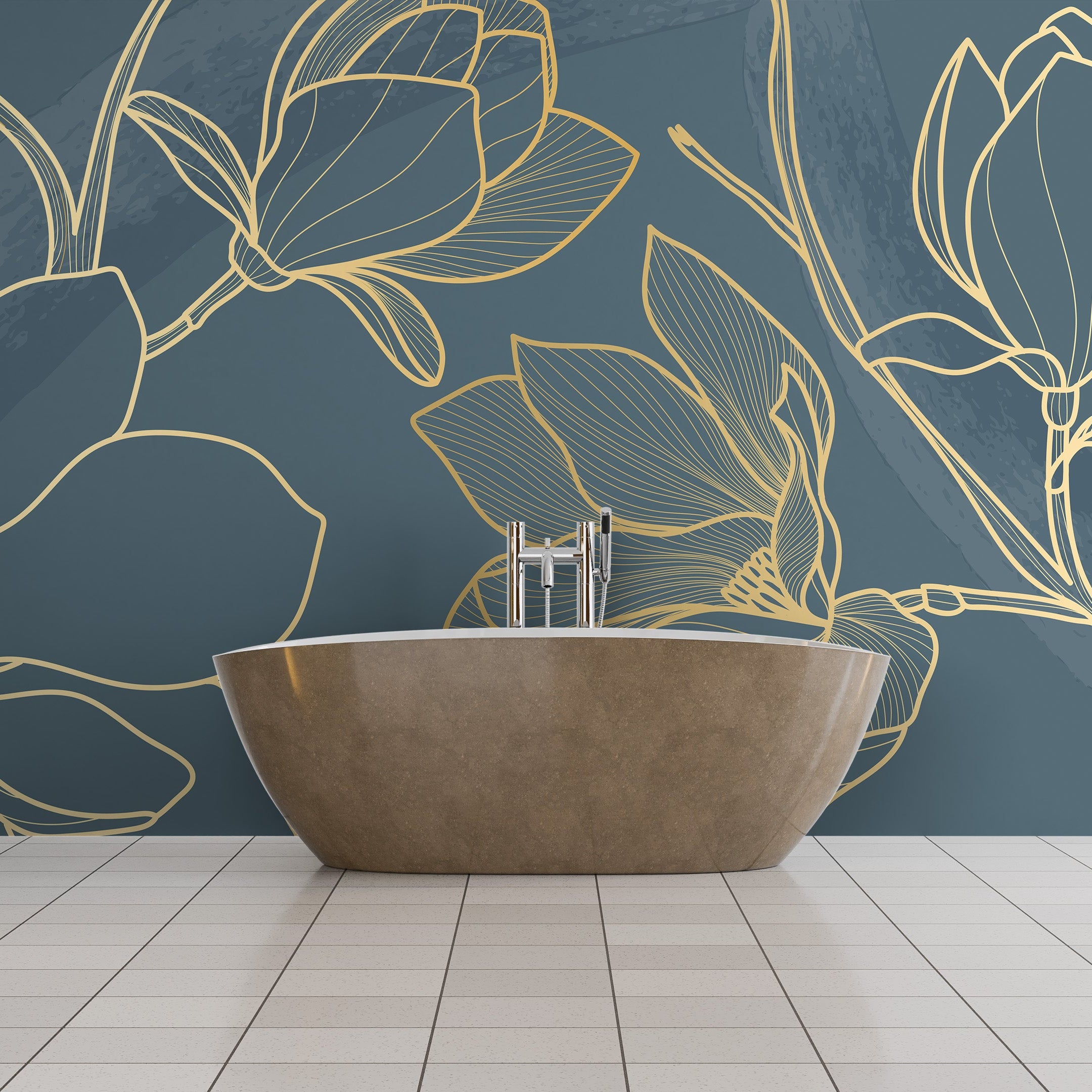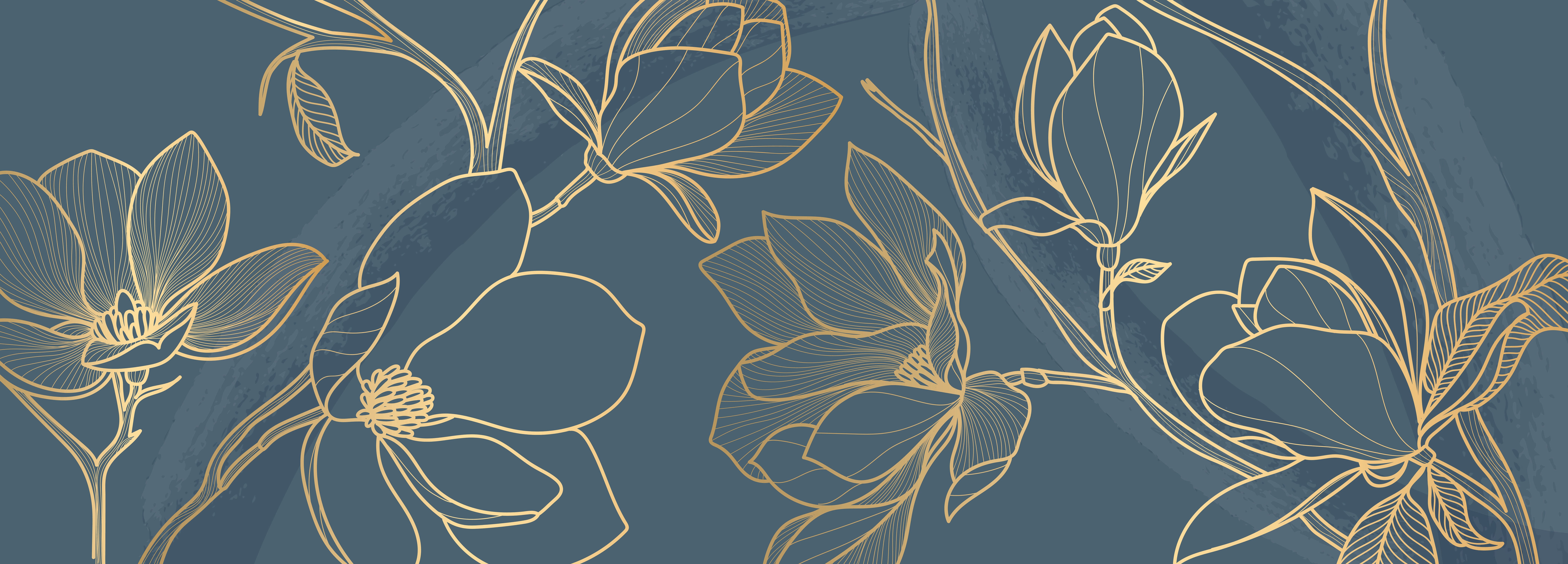A delicate golden line art magnolias intertwine gracefully on a deep teal background, creating a sophisticated and modern botanical design