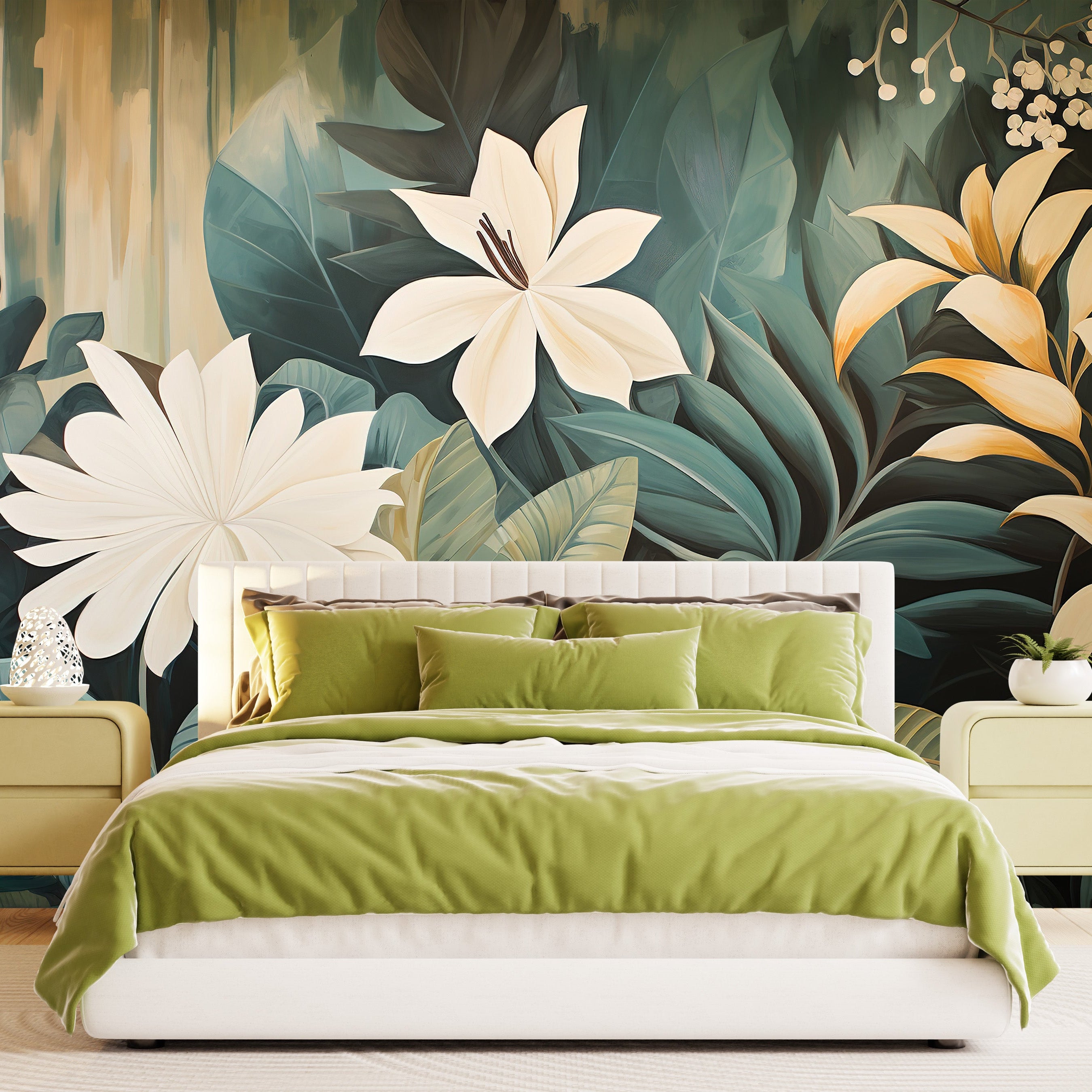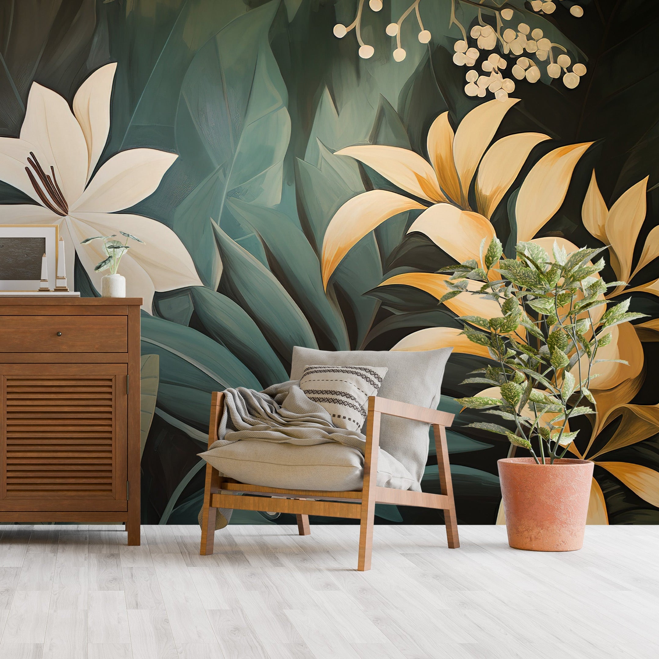 A lush botanical scene with elegant white and golden blooms set against rich green foliage, evoking a tranquil and sophisticated natural beauty