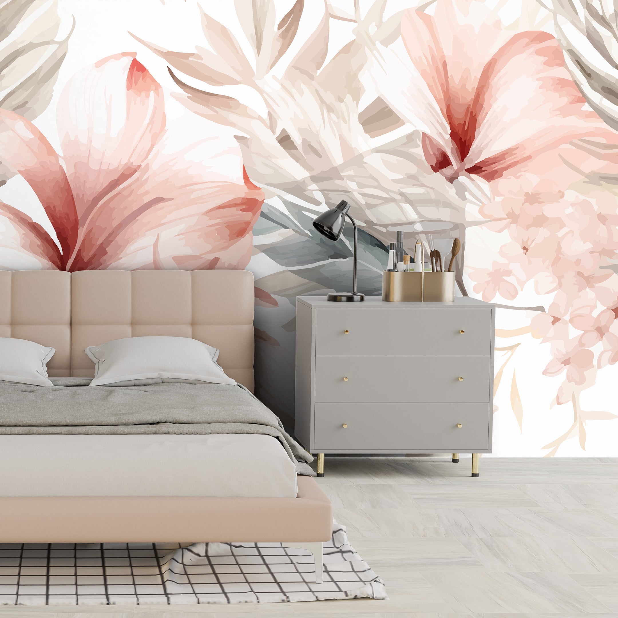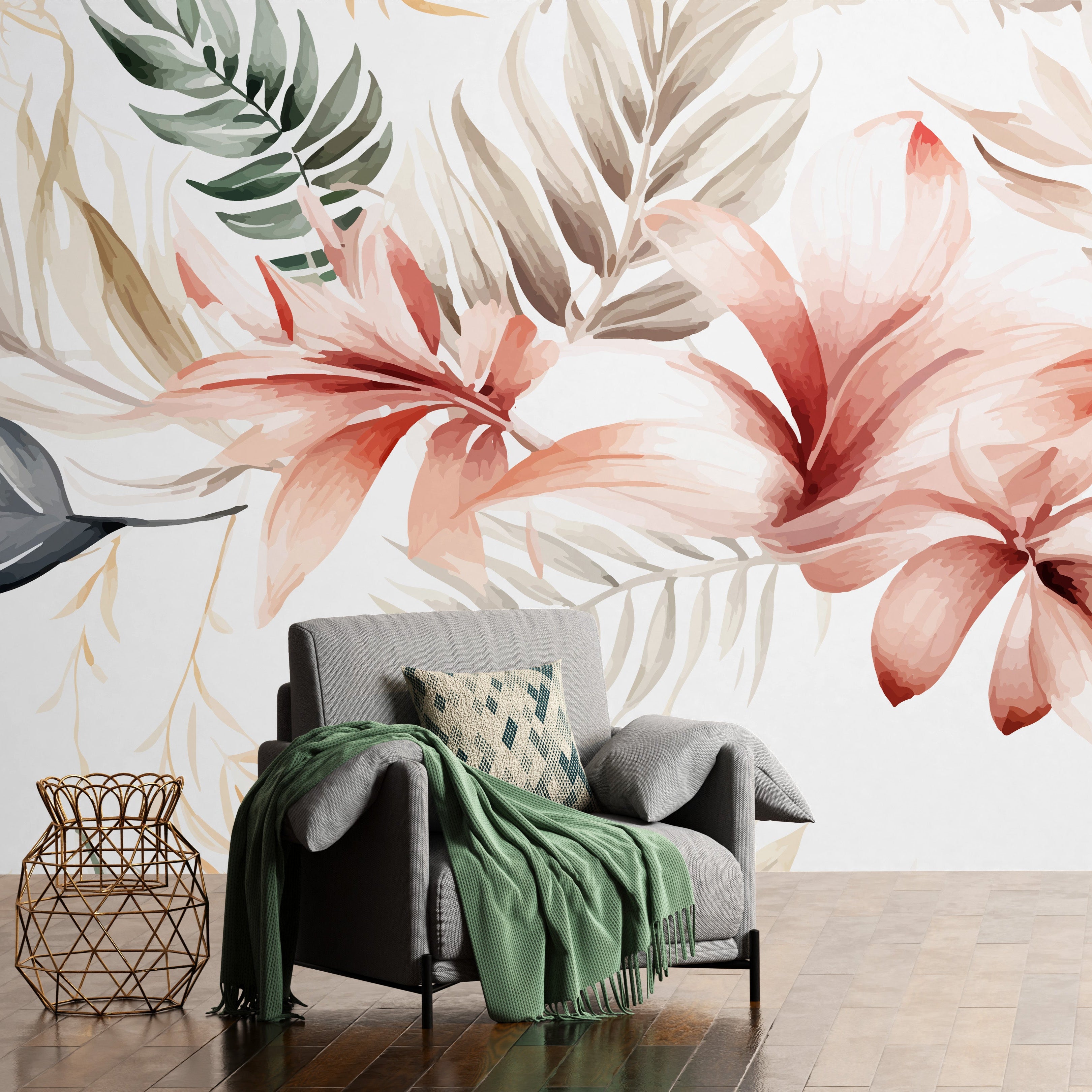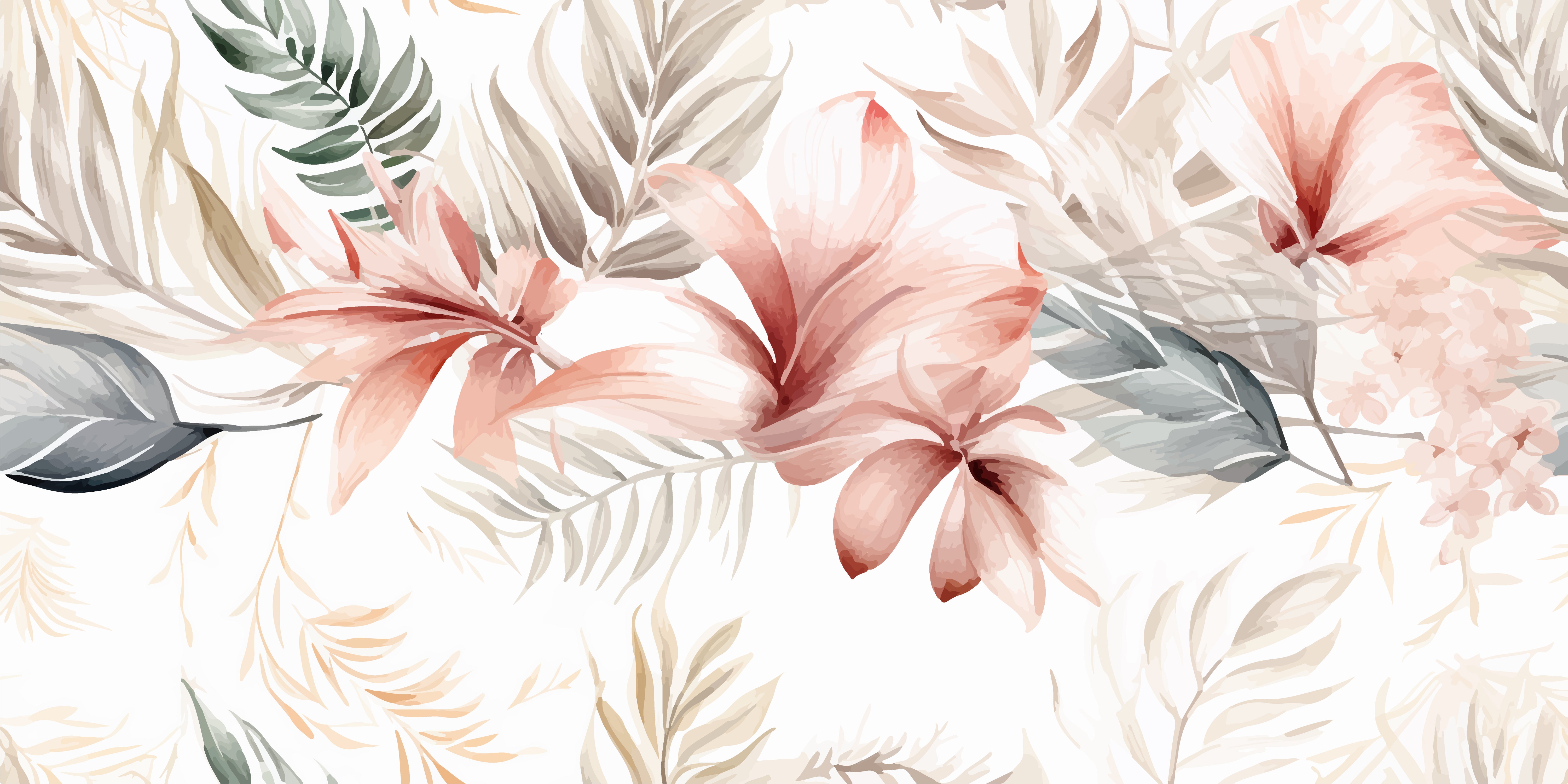 A delicate watercolor floral pattern featuring soft pink lilies and muted green foliage, creating a serene and elegant nature-inspired aesthetic