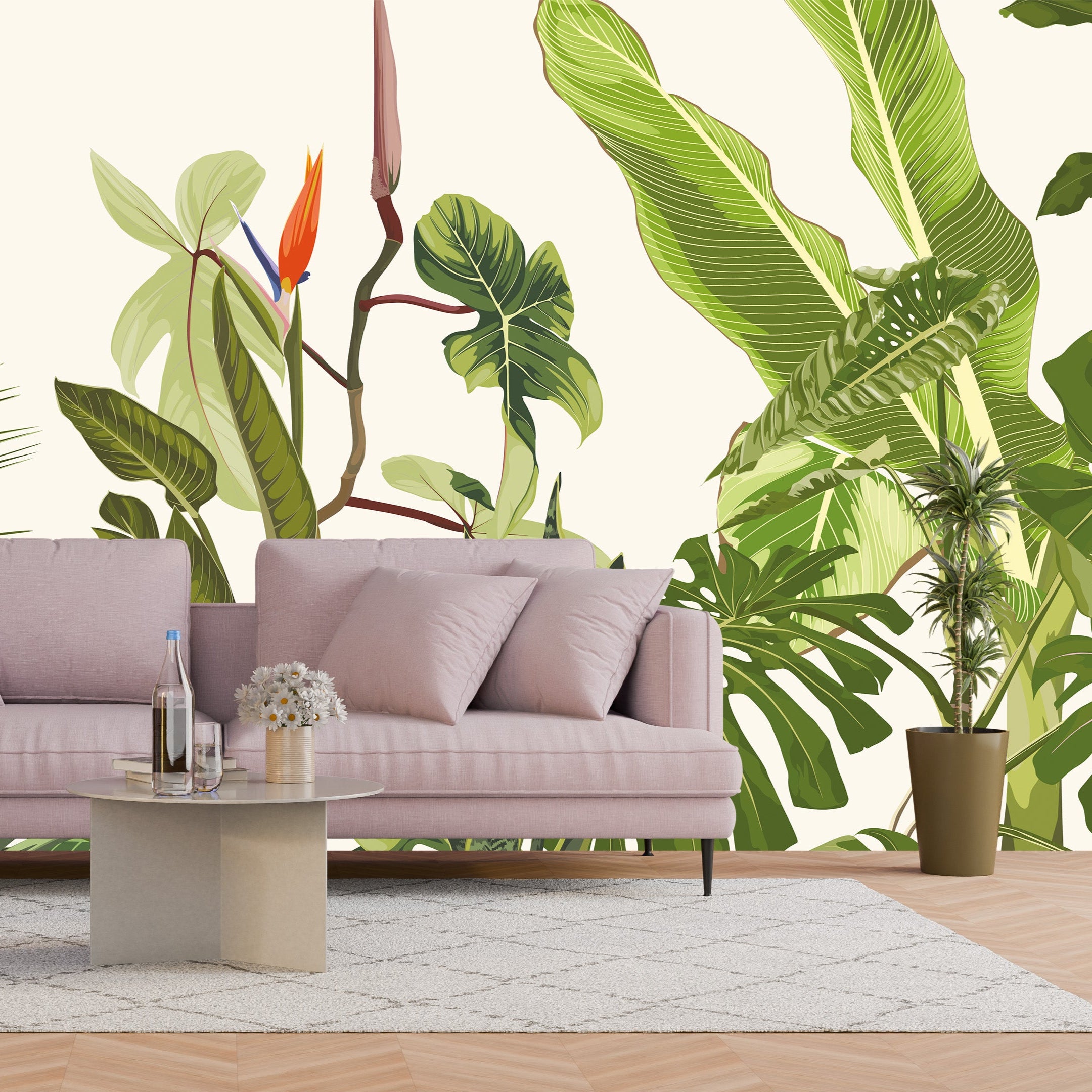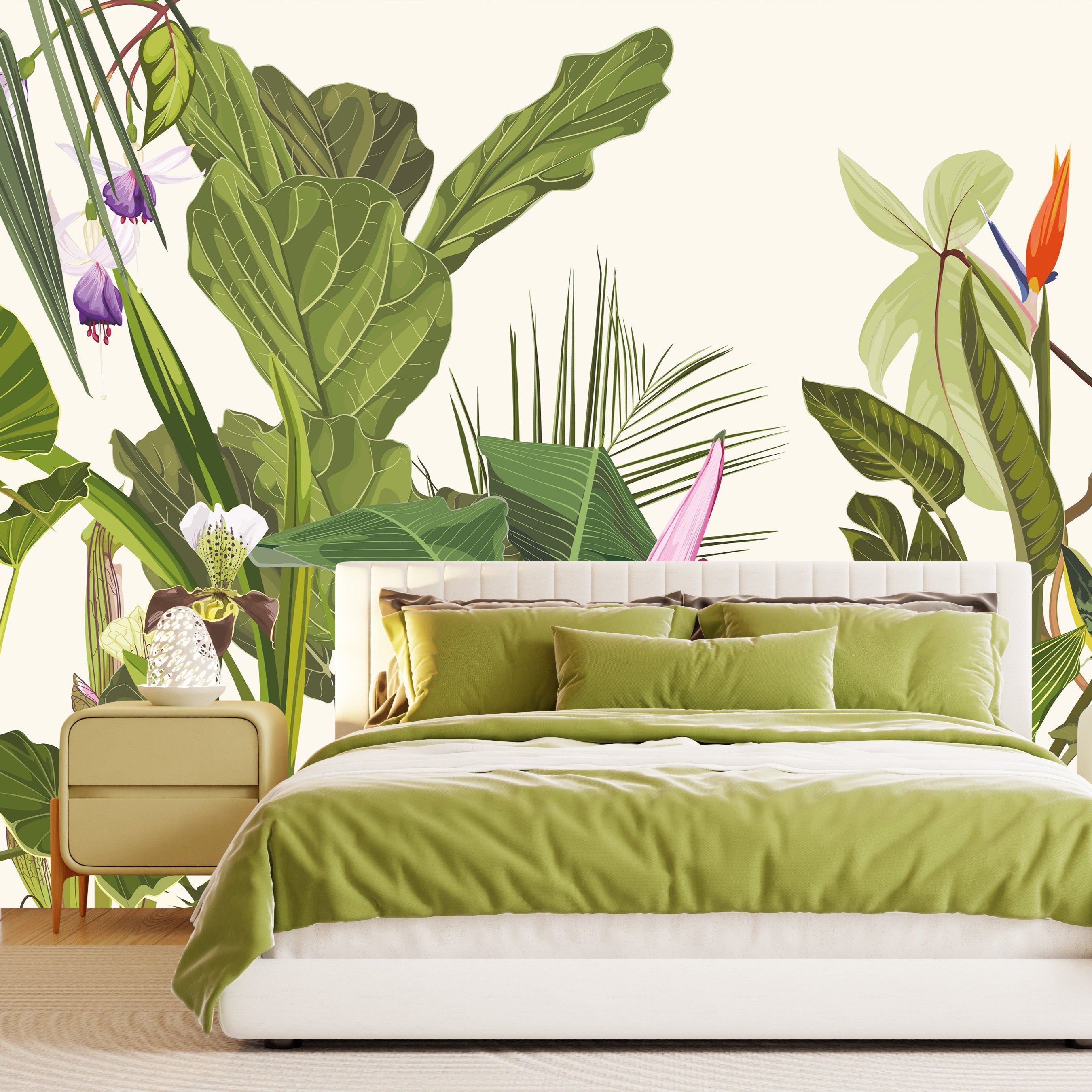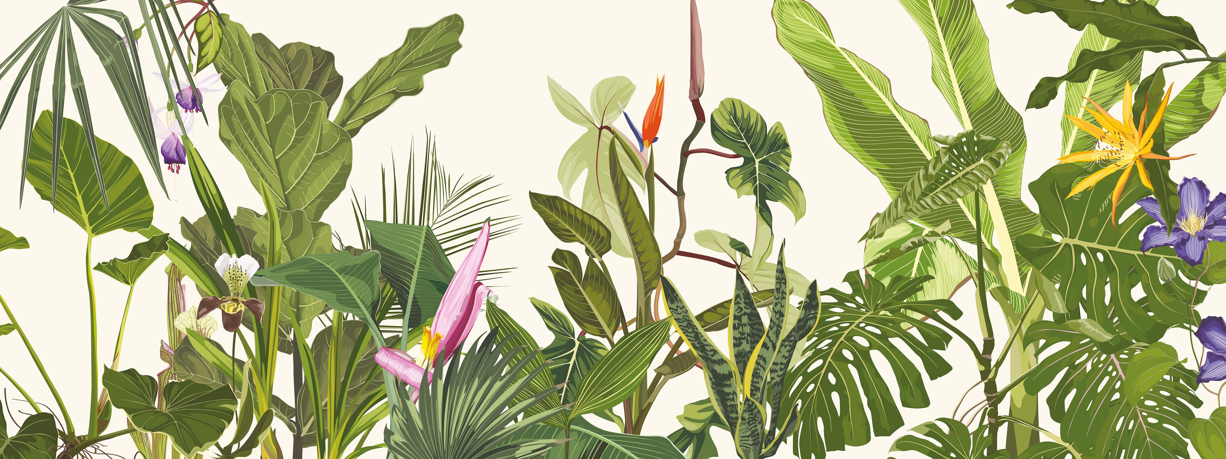 A lush botanical illustration filled with vibrant tropical leaves and exotic flowers, evoking the beauty and richness of a jungle oasis