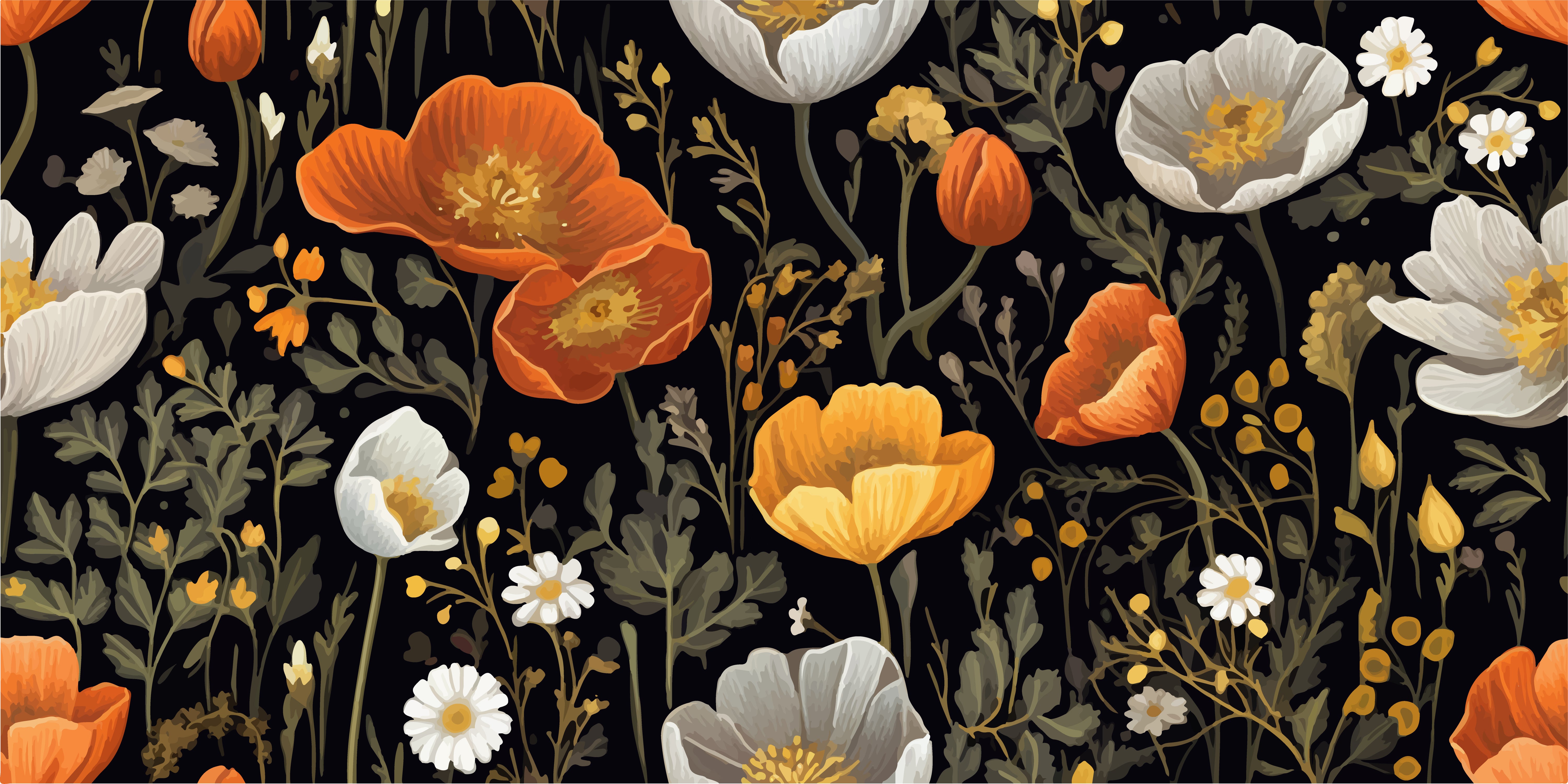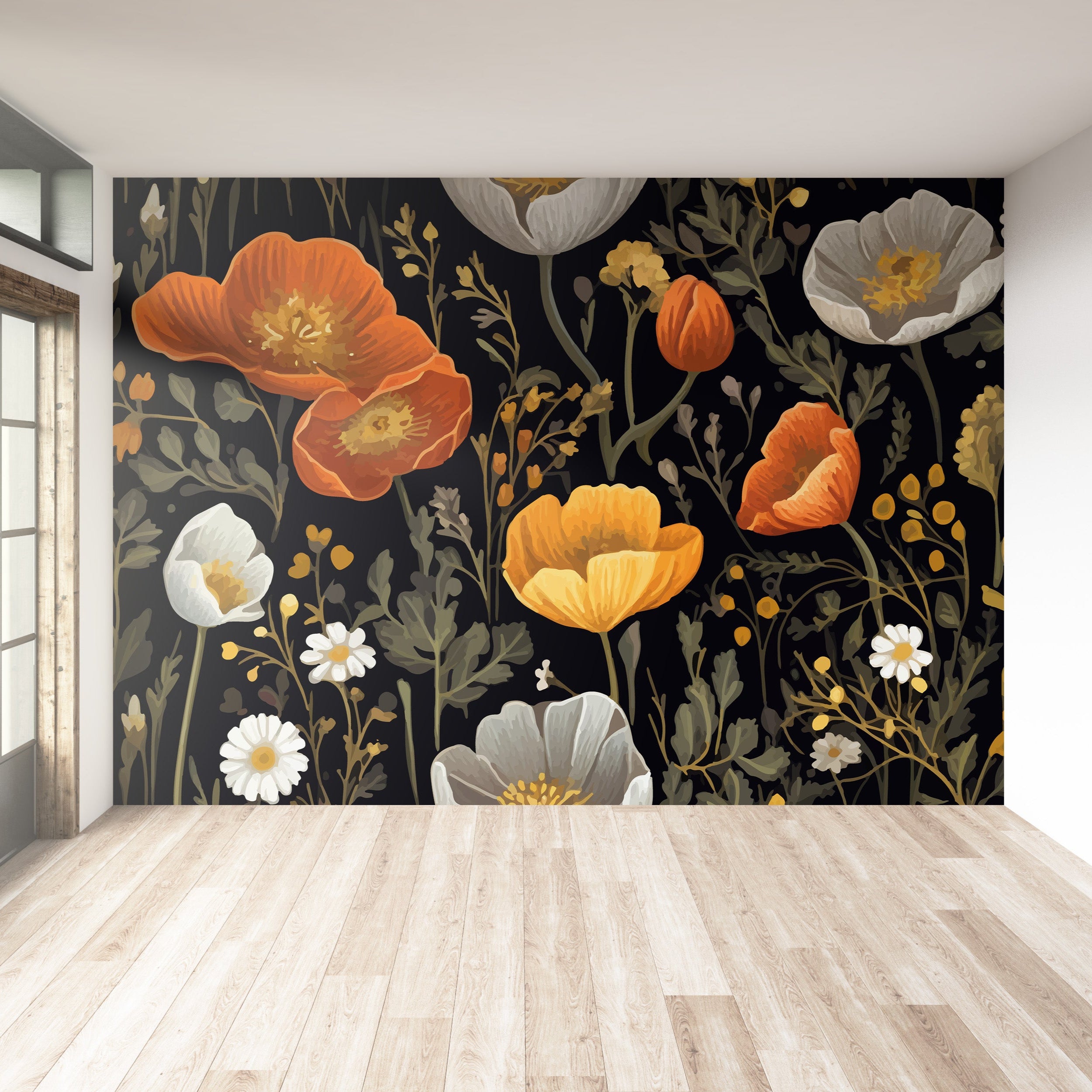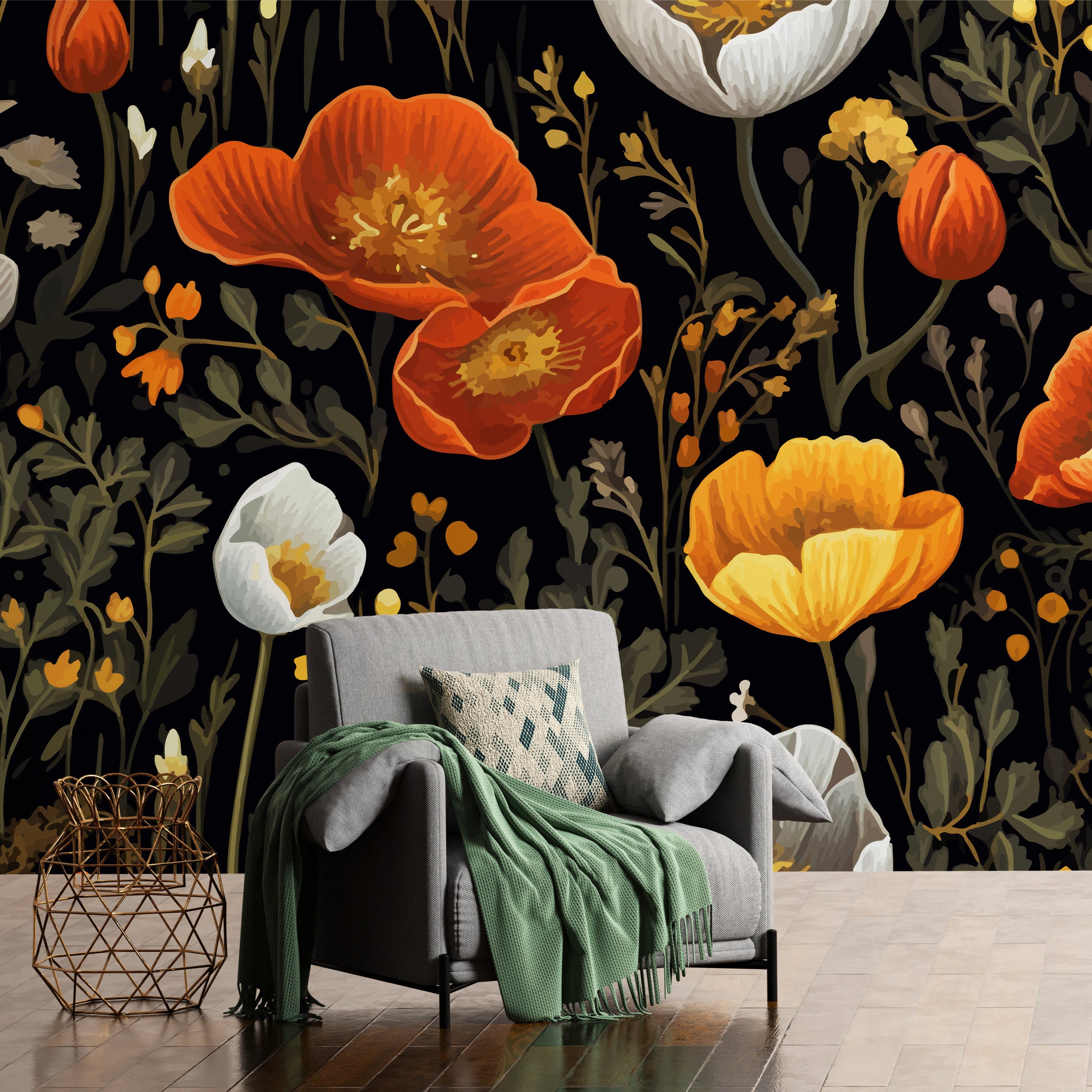 A vibrant floral pattern featuring bold orange and white poppies and delicate daisies against a deep black backdrop