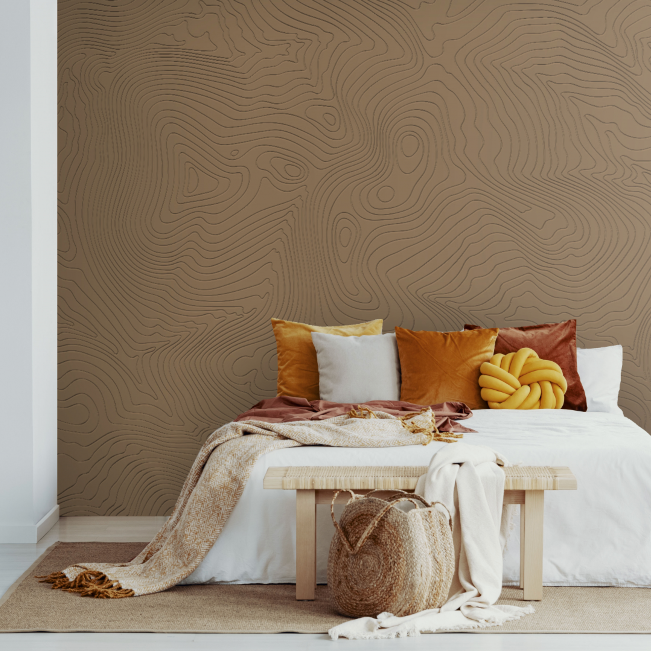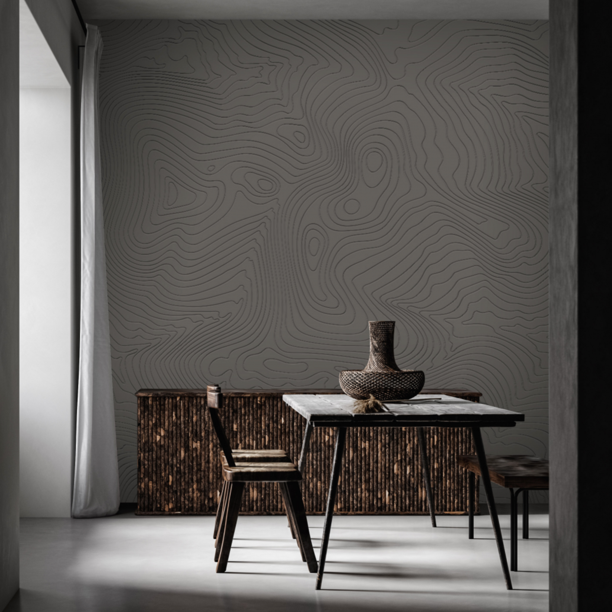 A wall adorned with subtle, embossed contour line patterns, evoking the beauty of natural landscapes and adding a calming depth in a 3D paintable texture.