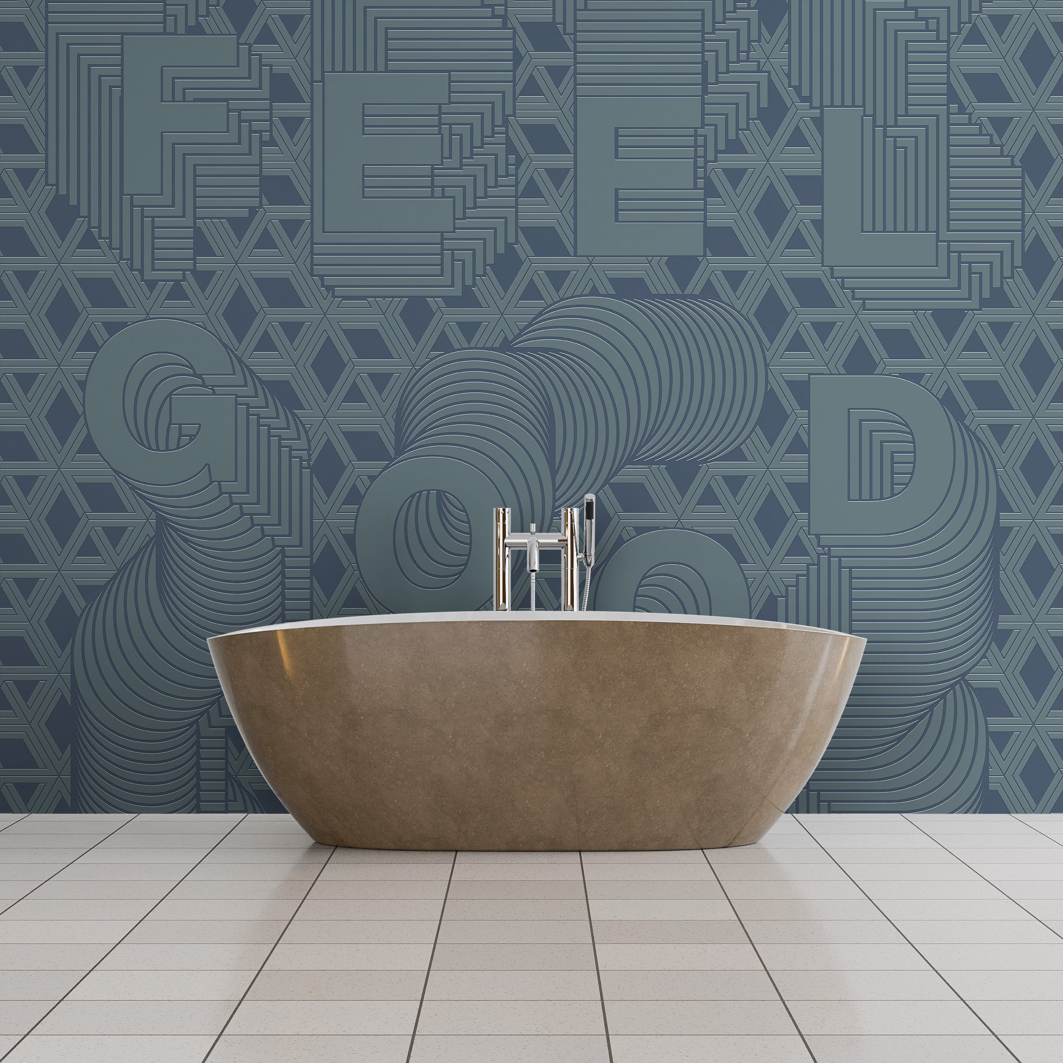 A bold wall design with geometric patterns and uplifting typography that spells "FEEL GOOD," adding a modern and positive touch to the space in a 3D paintable texture.