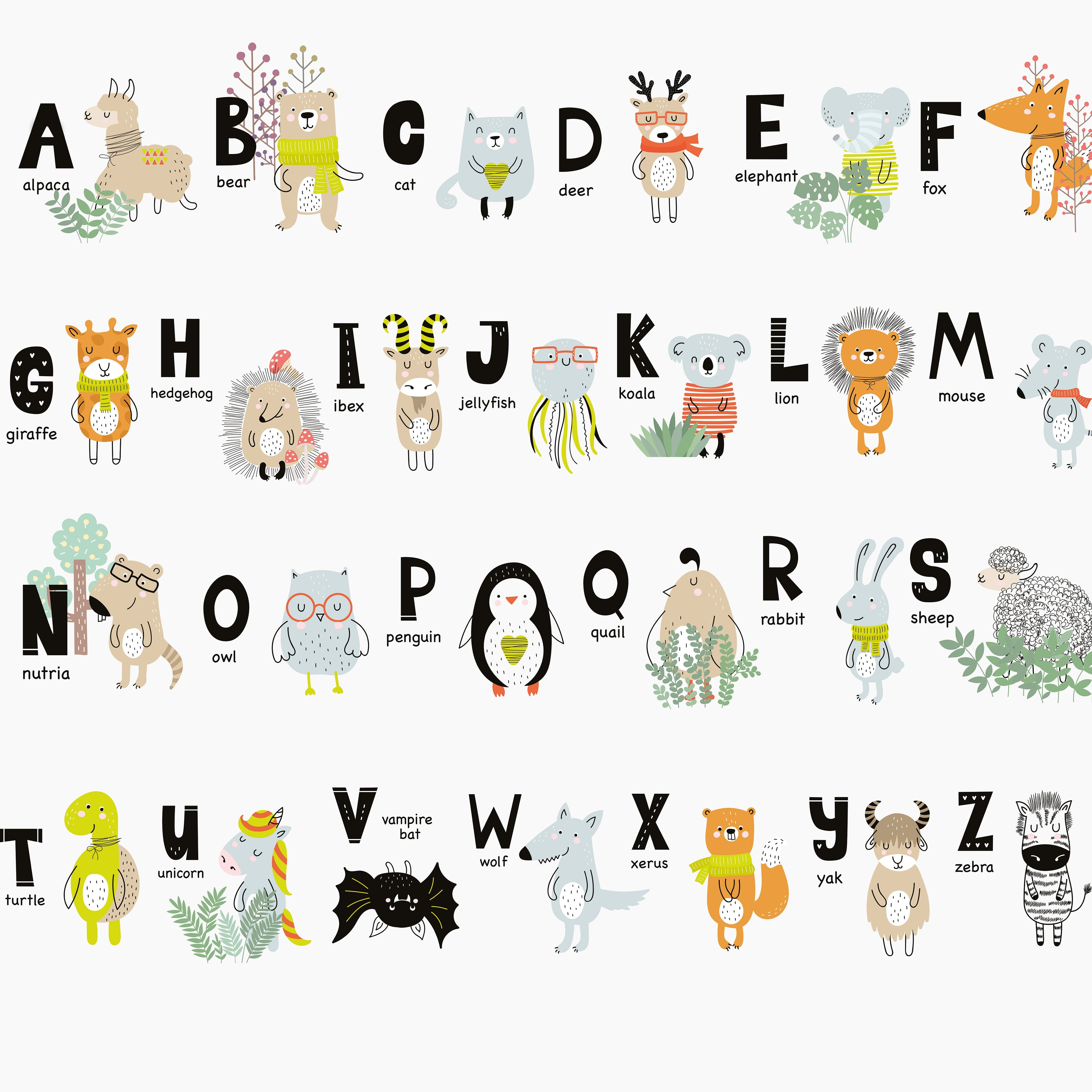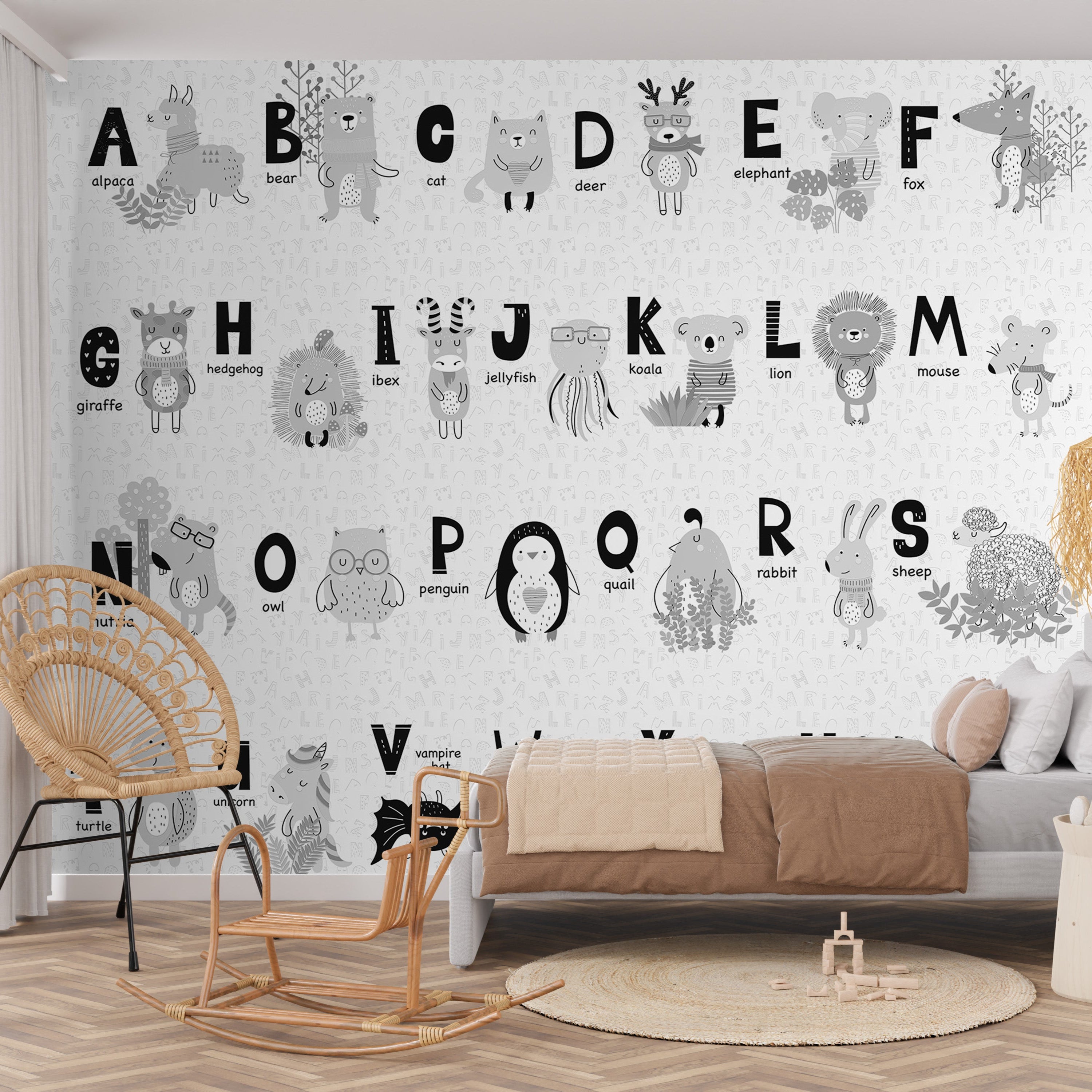 A playful mural showcasing the alphabet with whimsical animal illustrations, creating a cheerful and engaging learning environment with 3D texture throughout.