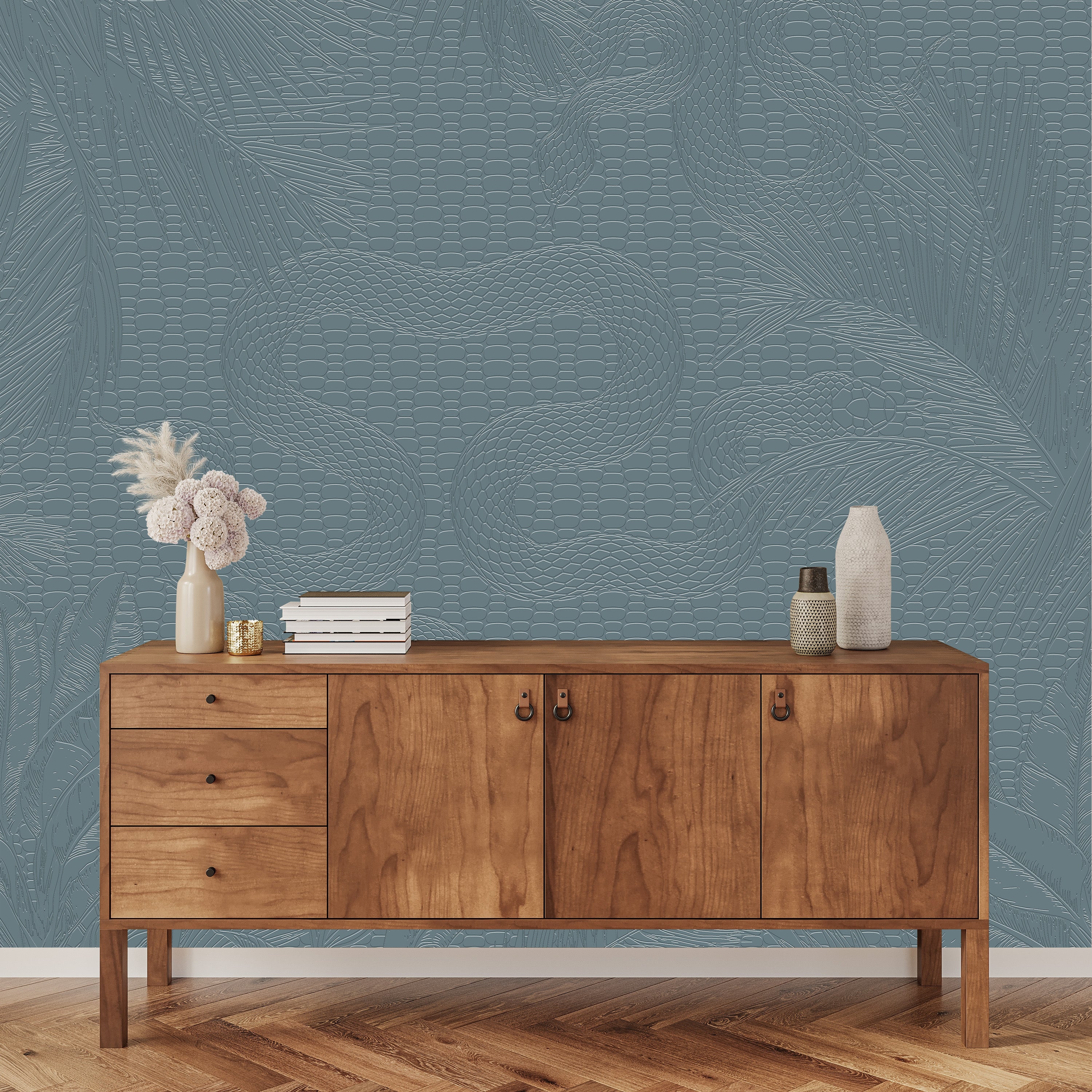A bold, complex relief pattern featuring intertwined snakes hidden among dense, stylized palm fronds. Paint any color to emphasize the mythological drama or mute the effect for sophisticated 3D texture.