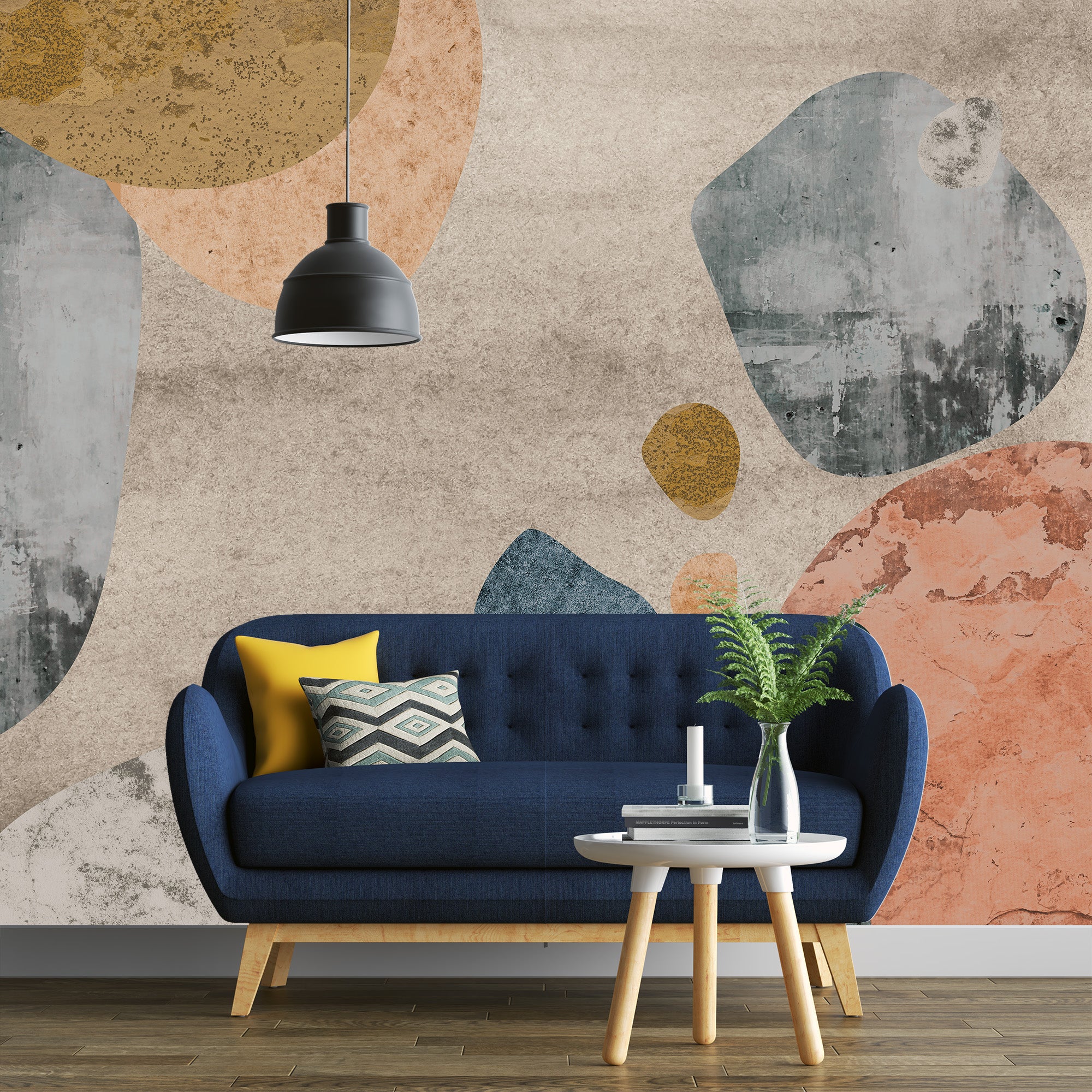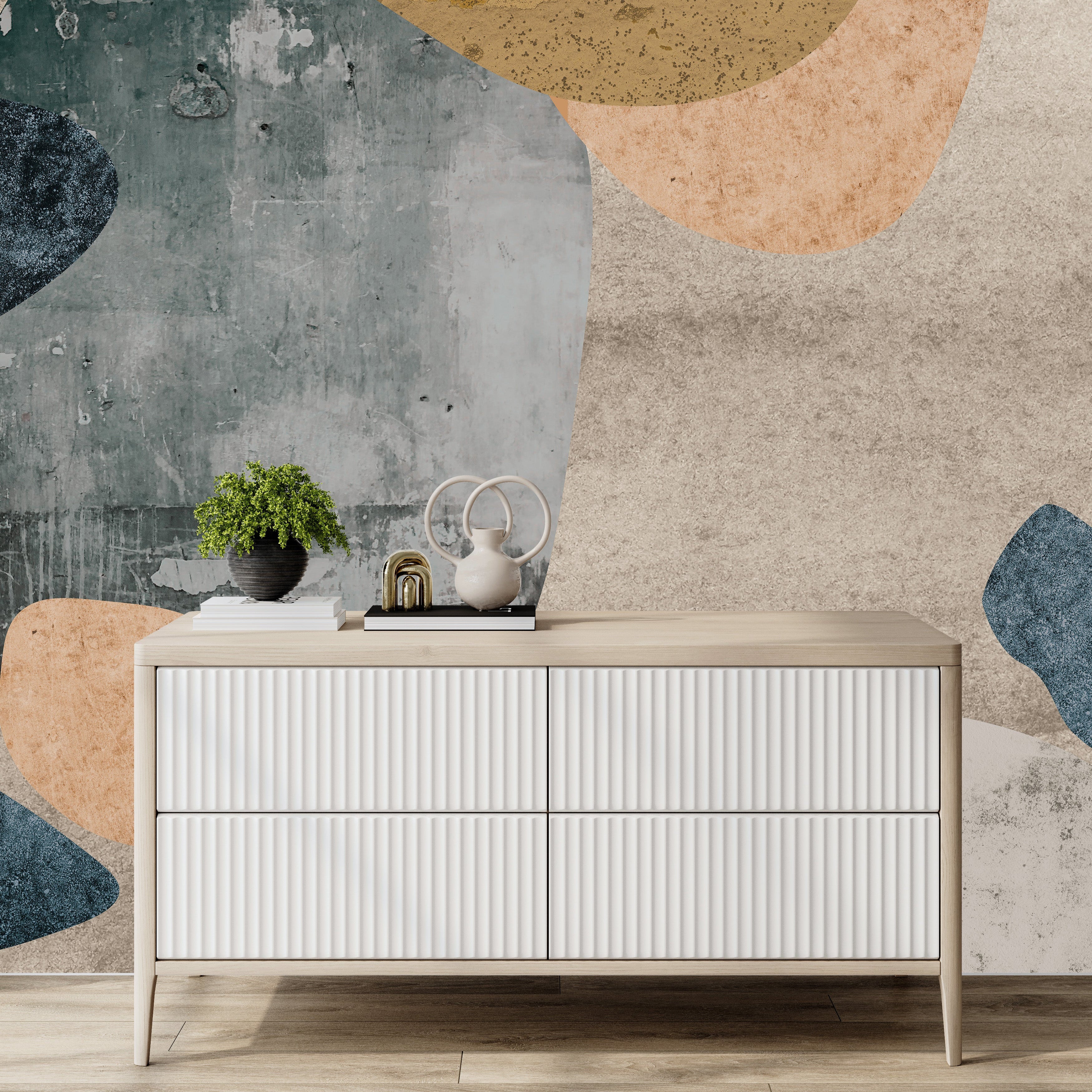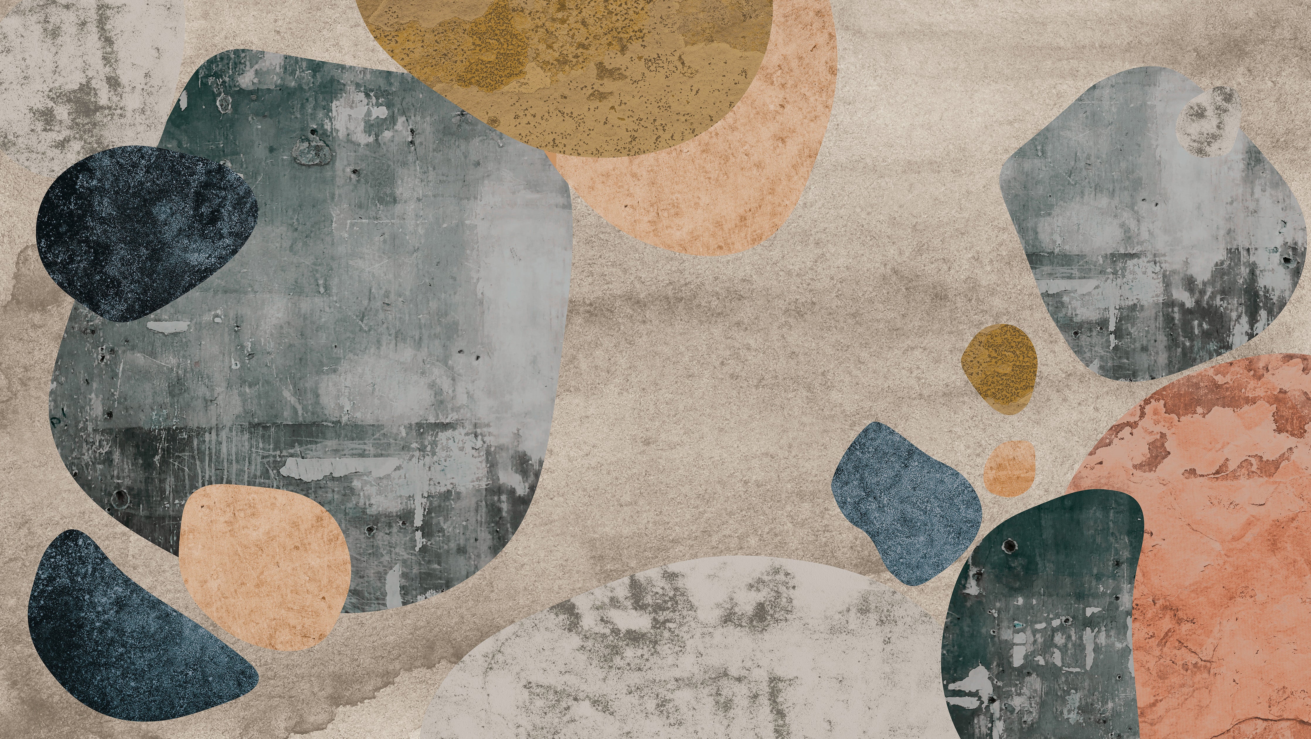 An organic scatter of textured shapes and muted tones, crafting a layered interplay of form, depth, and weathered hues in a contemporary, abstract style