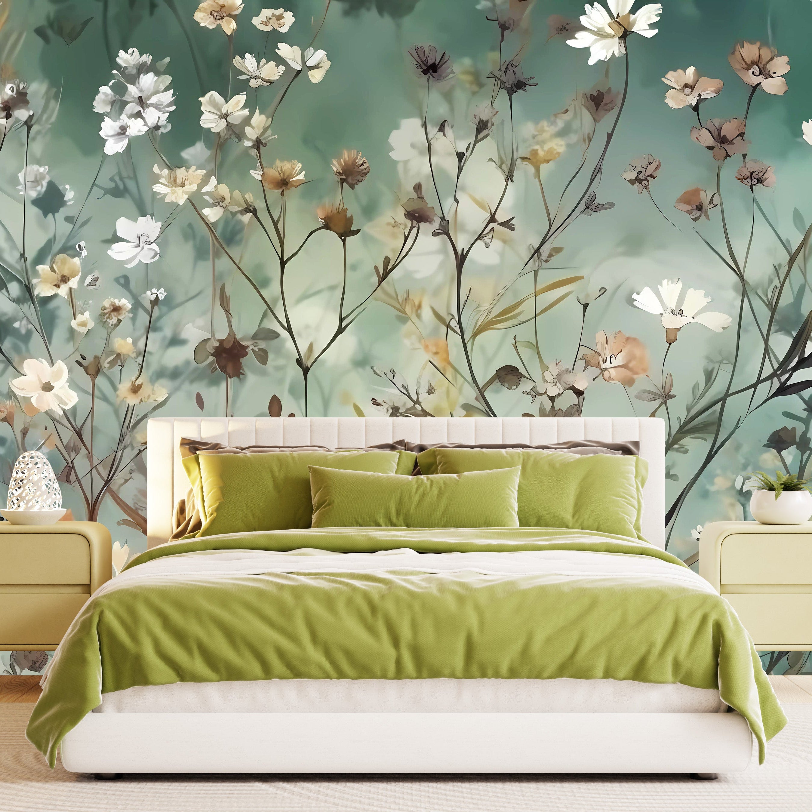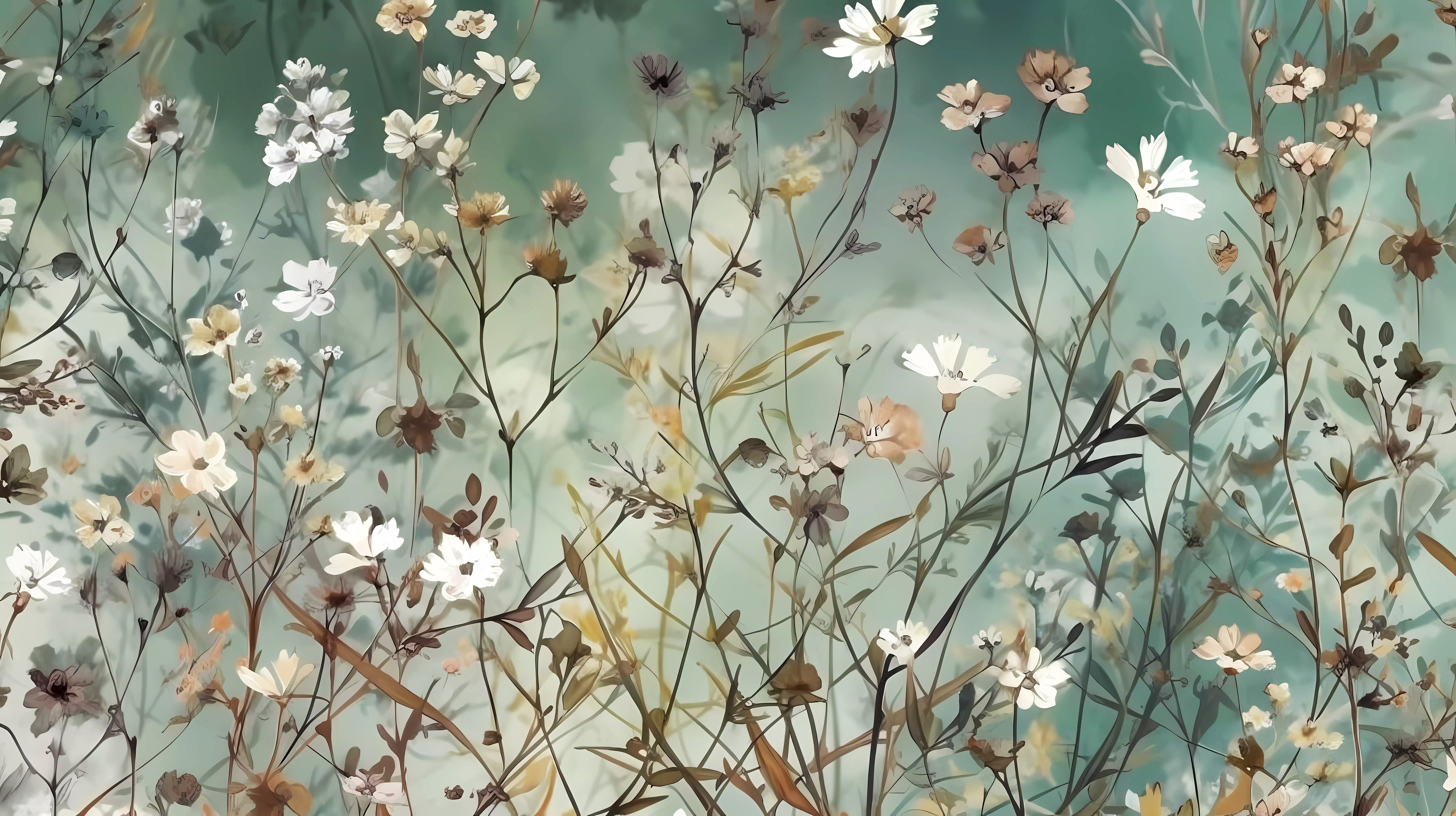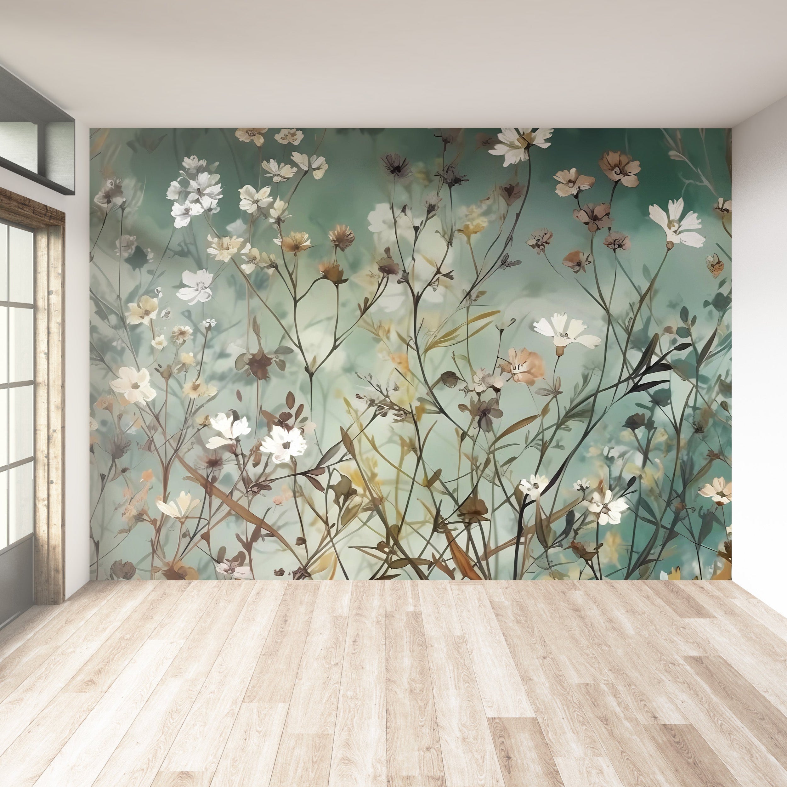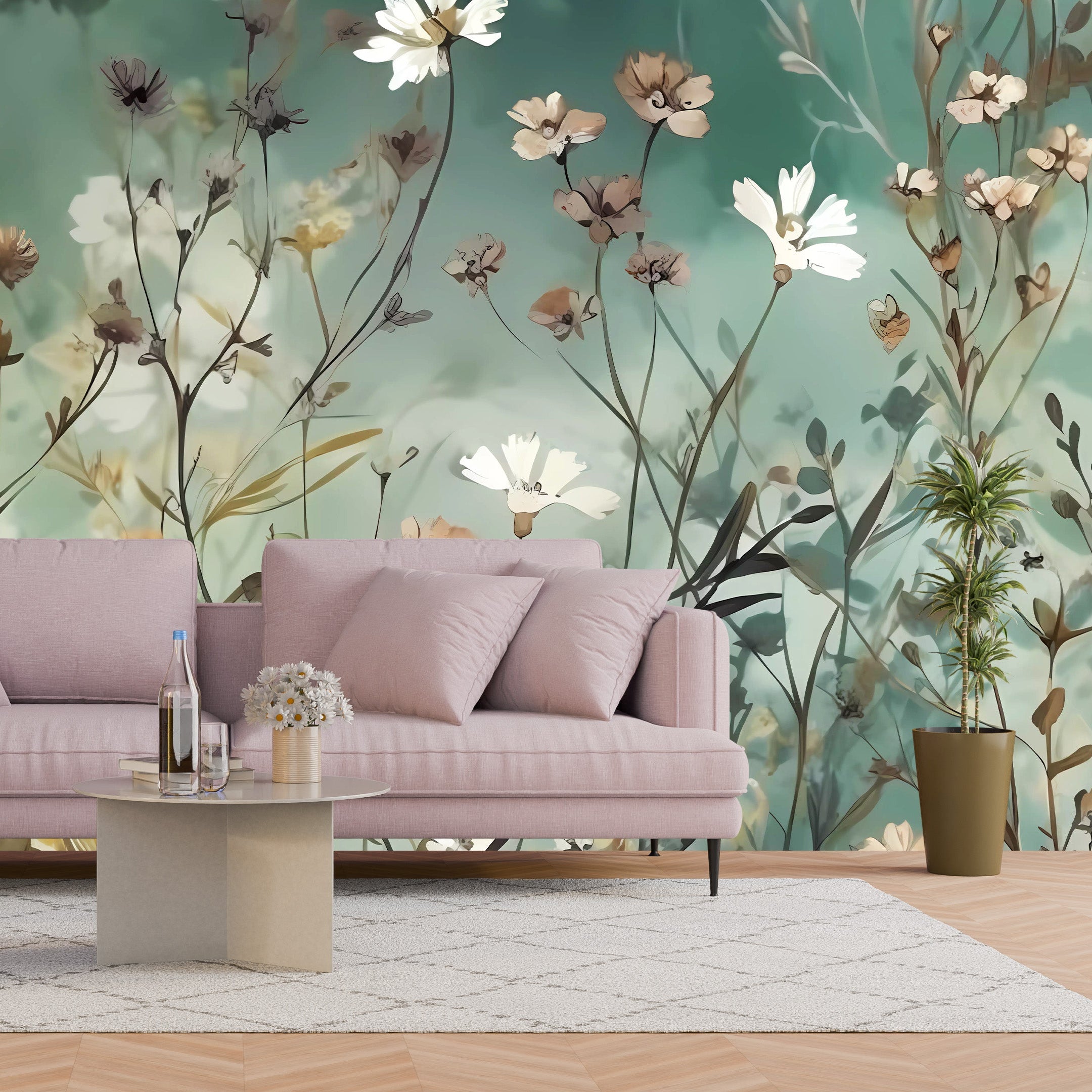 A dreamy watercolor mural of delicate wildflowers in earthy tones, set against a soft teal background, evoking serenity and natural beauty