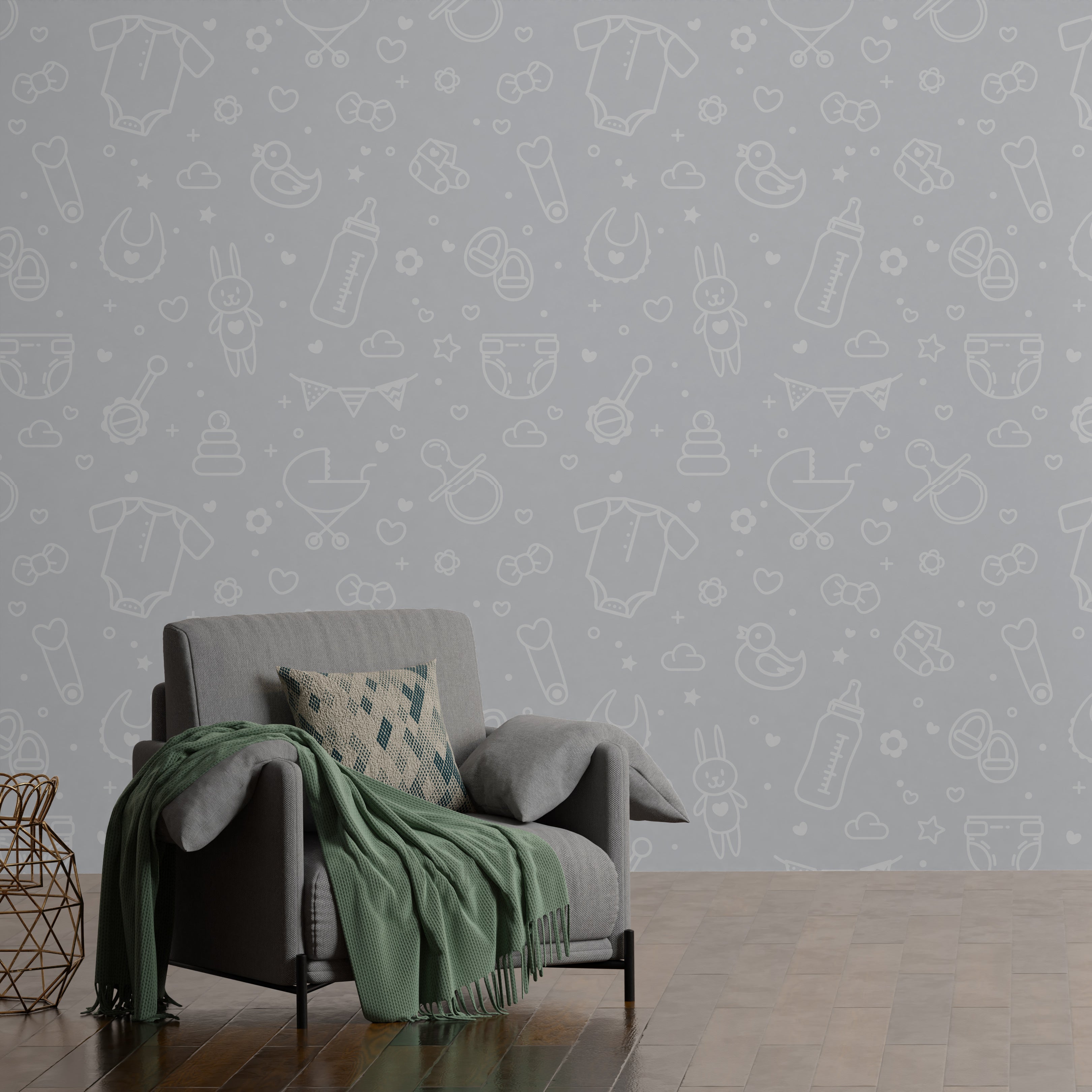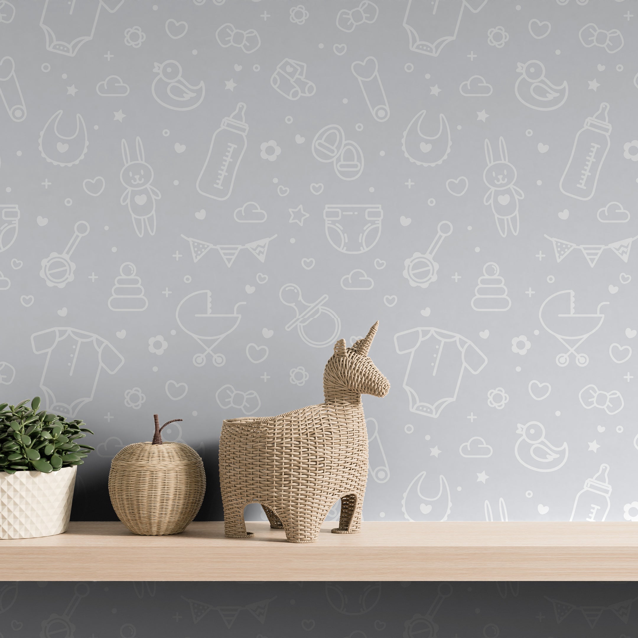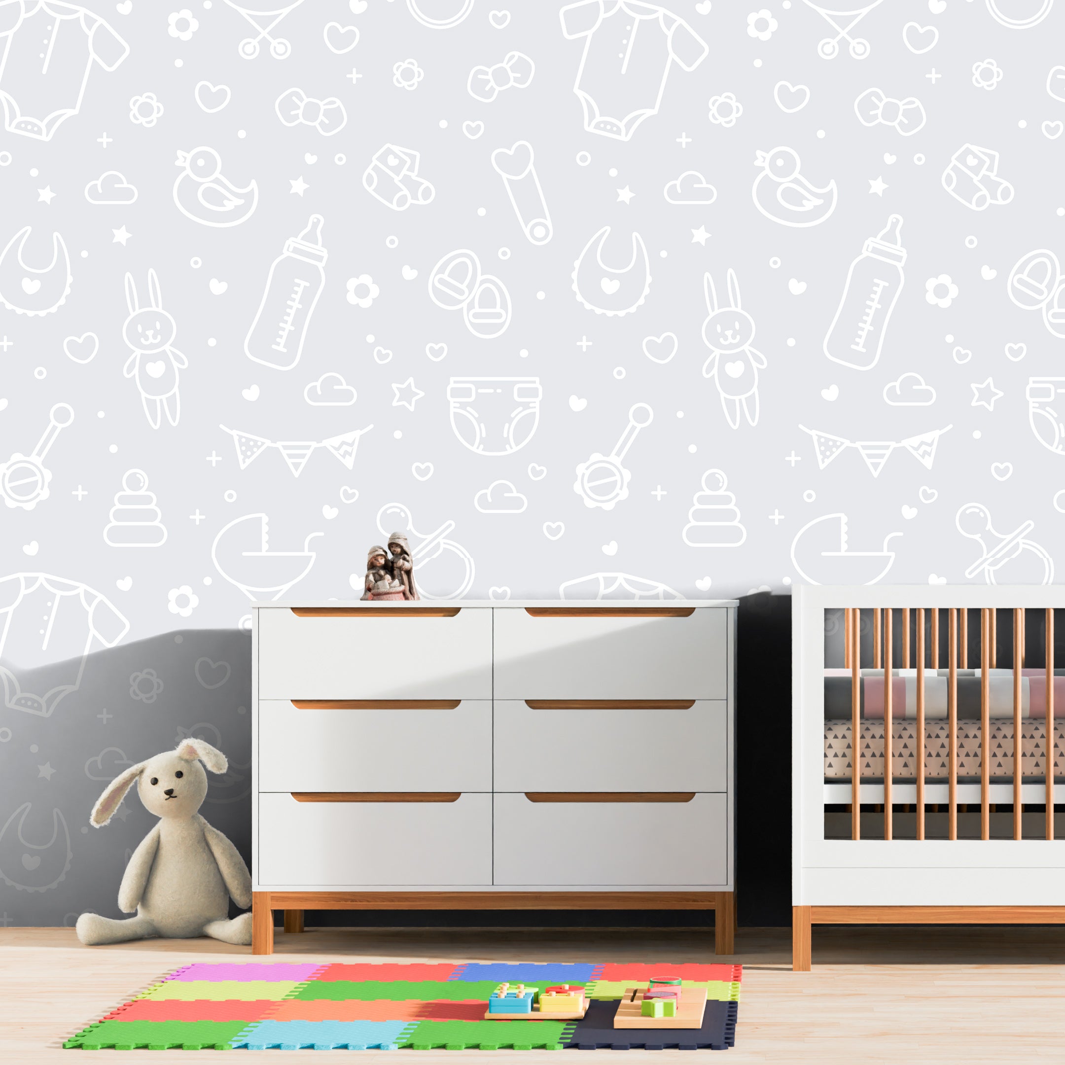 Drift off to dreamland with this sweet and gentle wallpaper, perfect for nurseries and playrooms. Featuring adorable baby clothes, bottles, and toys in a soft, calming palette.