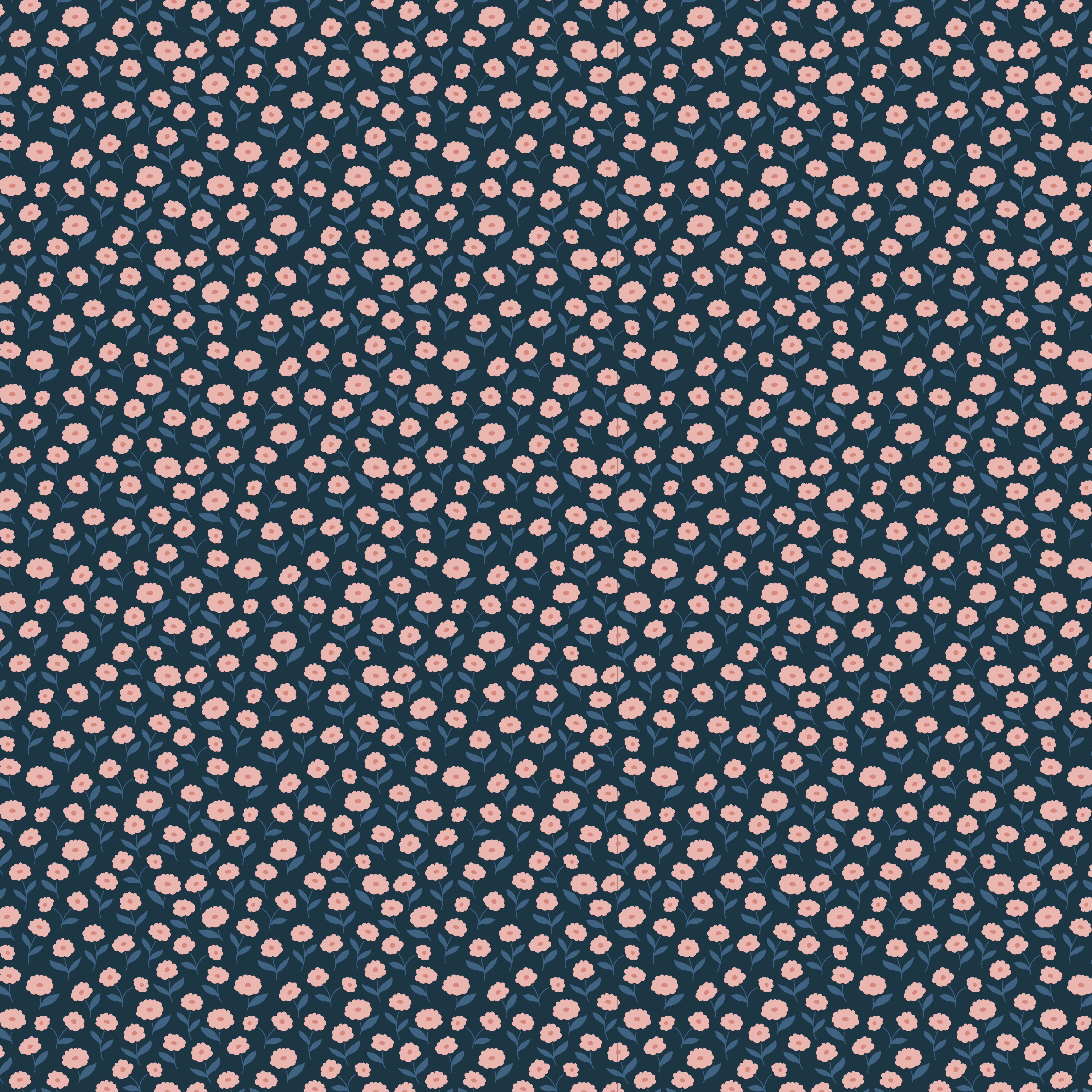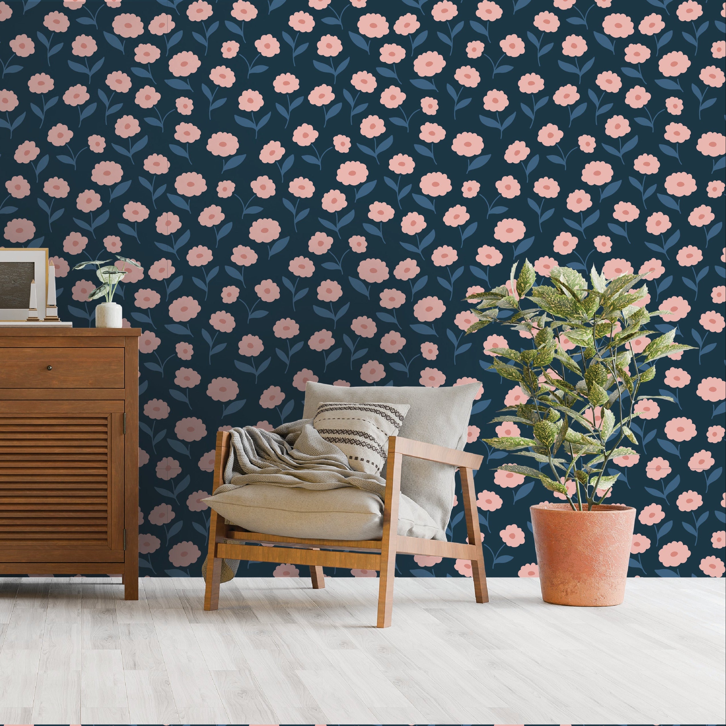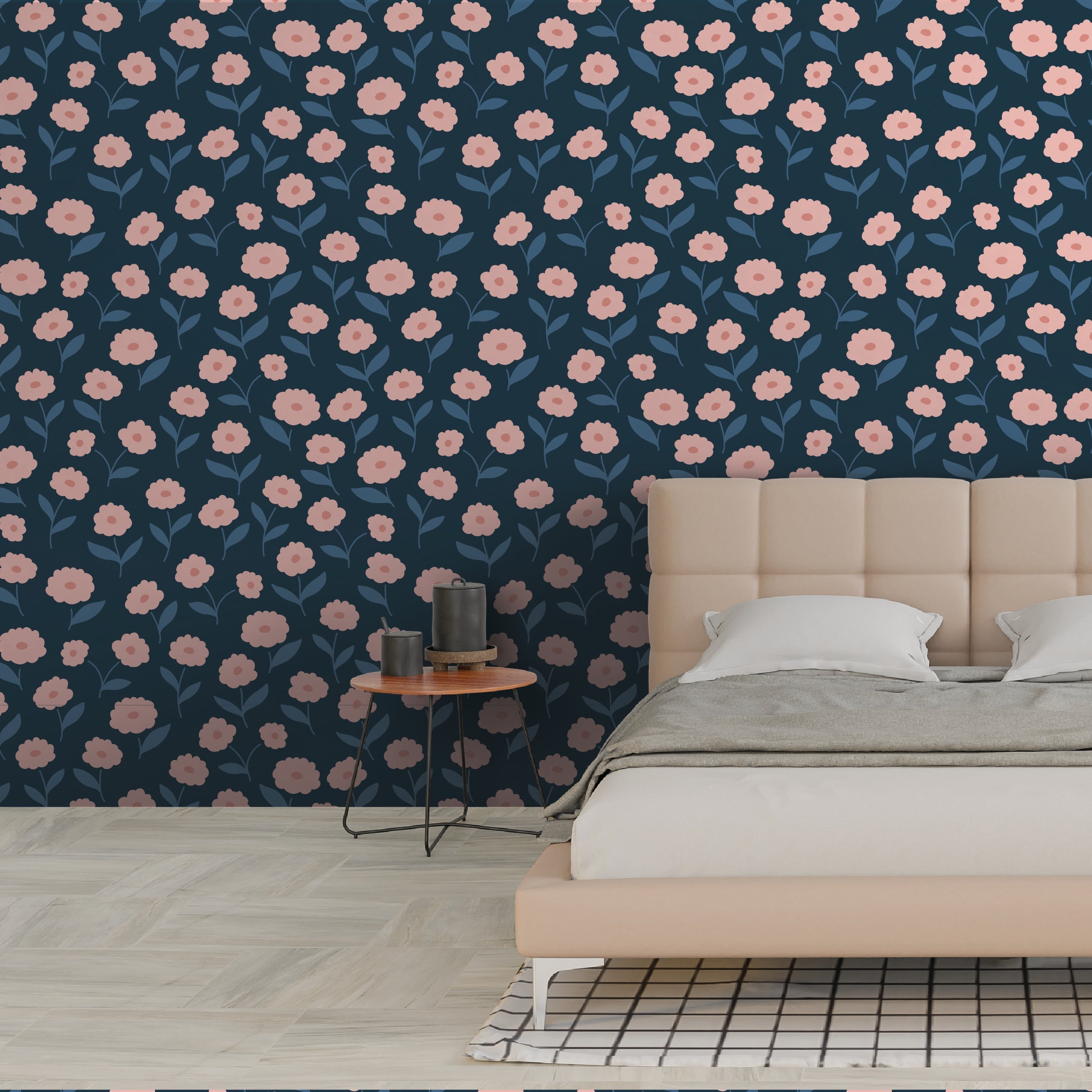A dreamy field of soft pink flowers against a deep indigo backdrop, adding warmth and contrast to your decor.