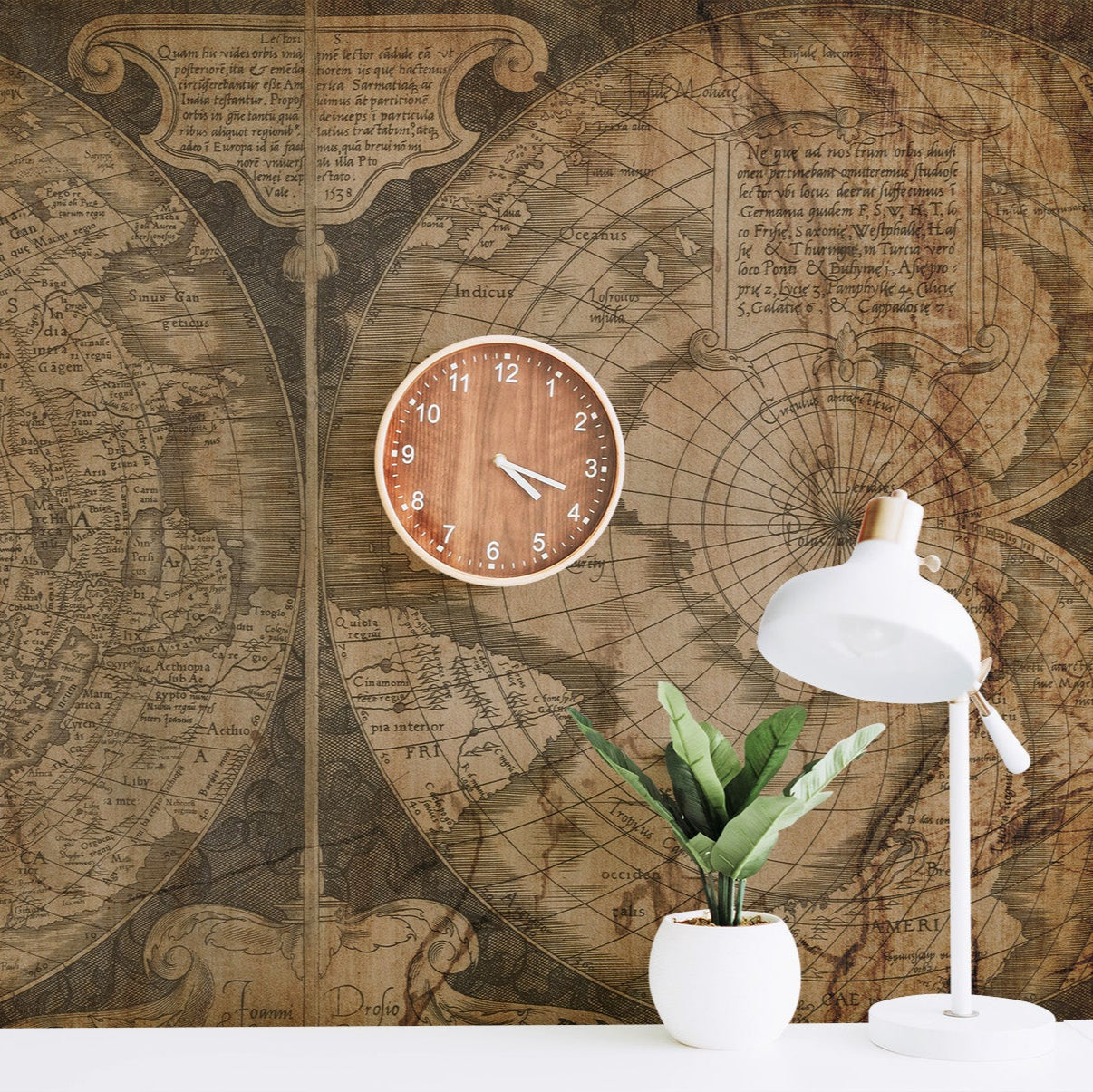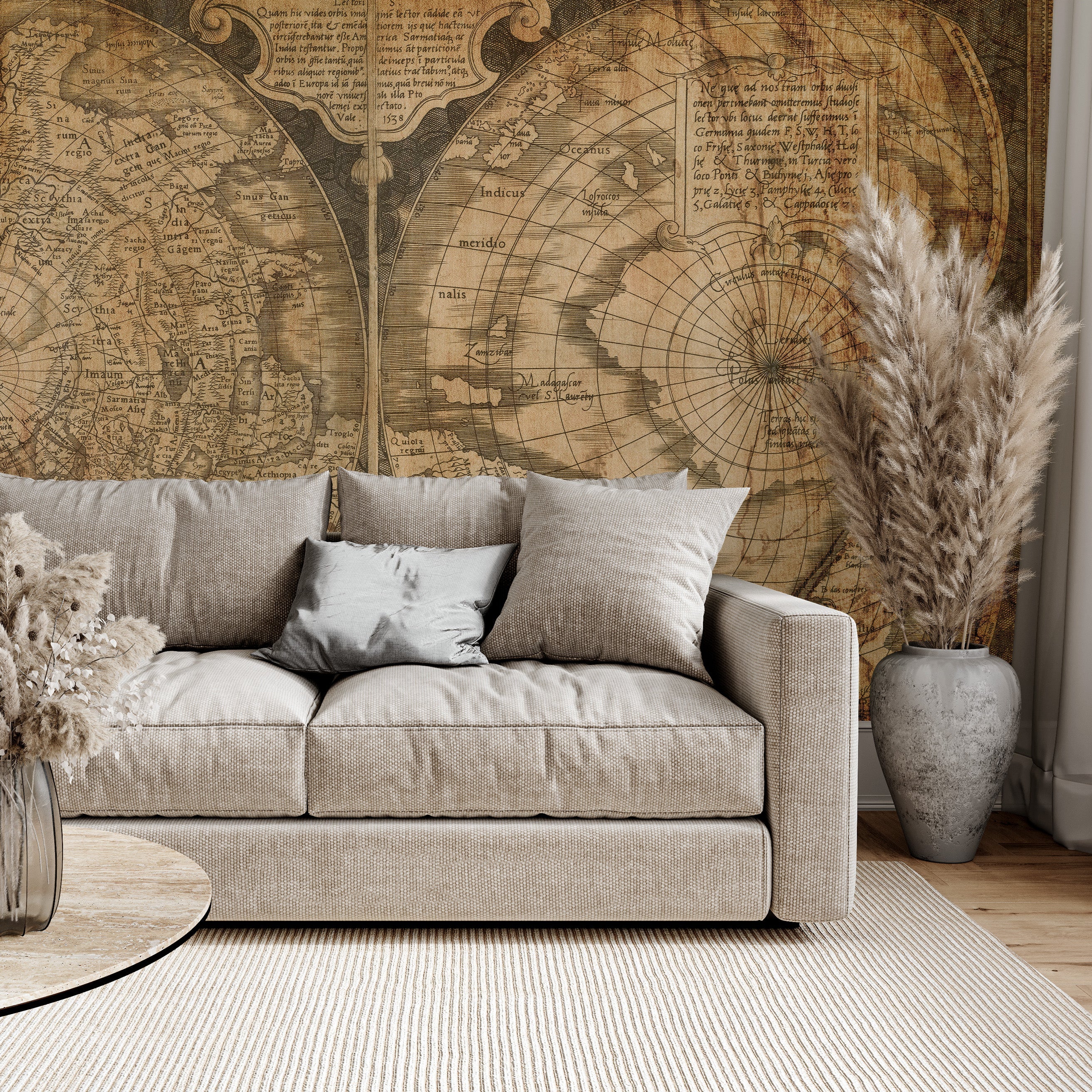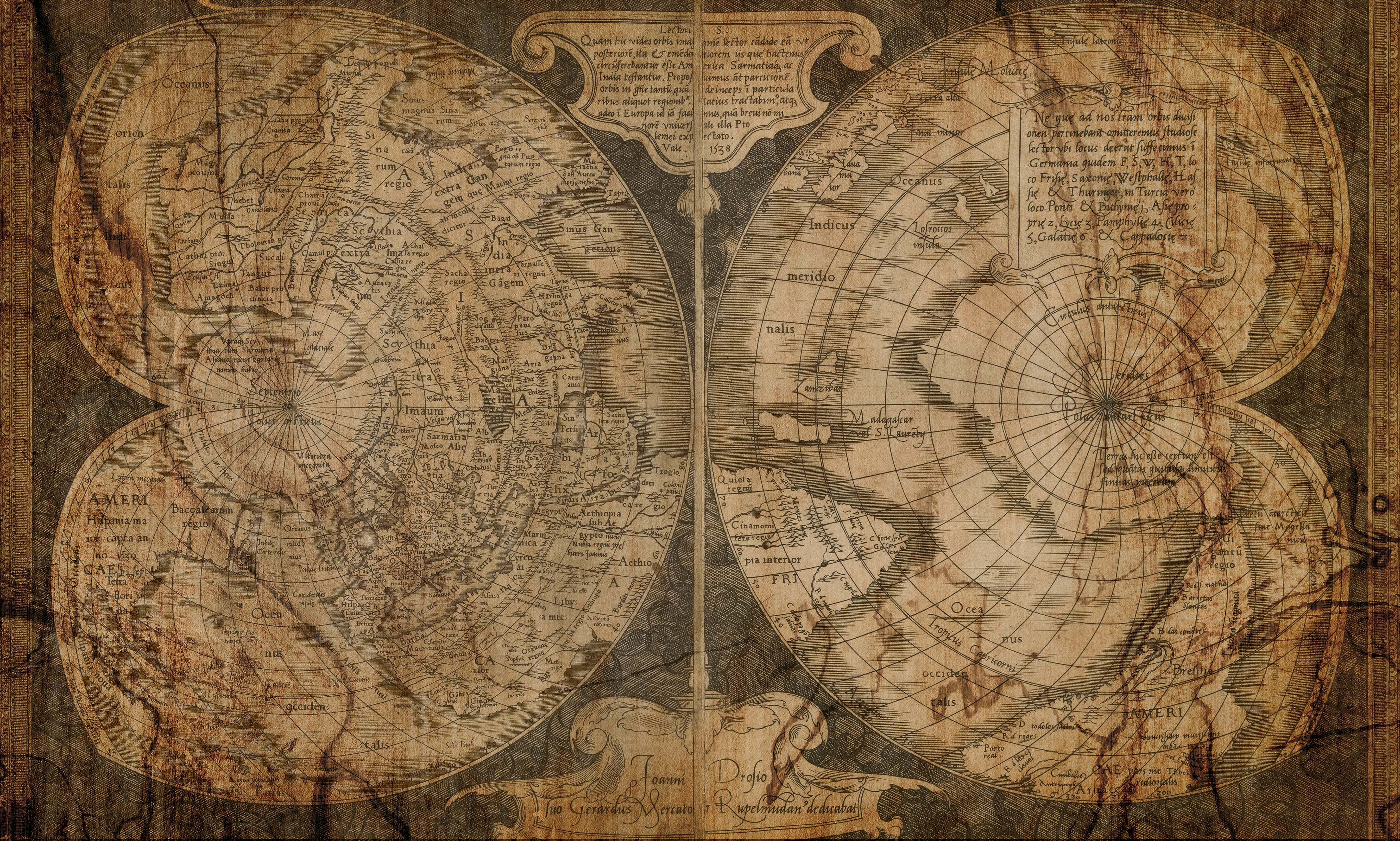 An aged, double heart-shaped world map with intricate details and faded sepia tones, revealing a historical interplay of cartography, artistry, and vintage charm