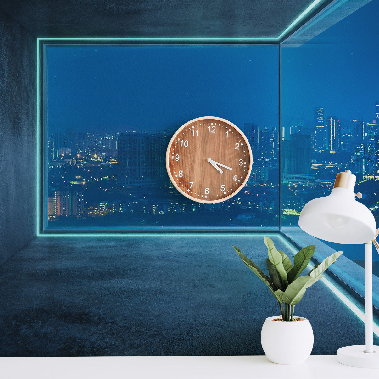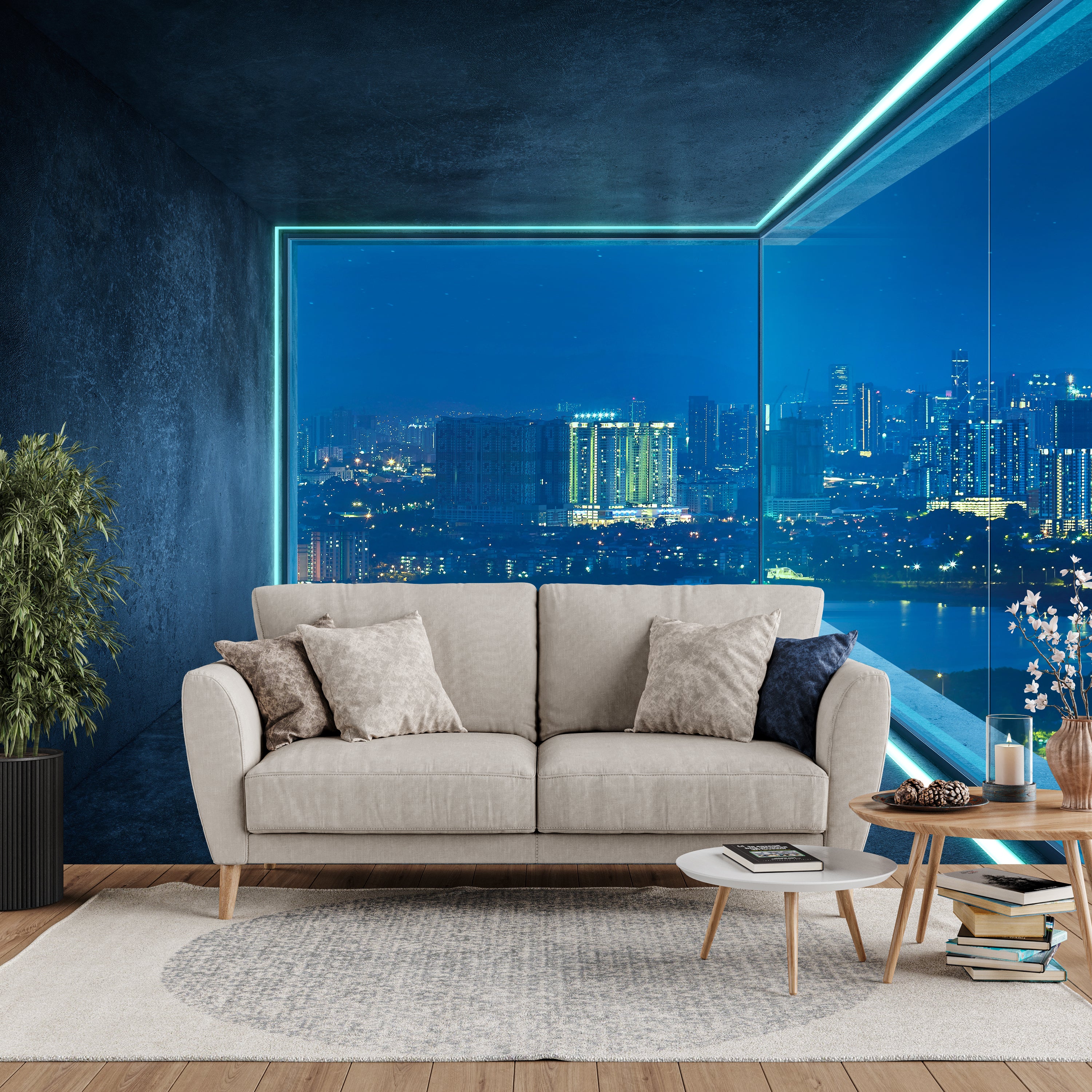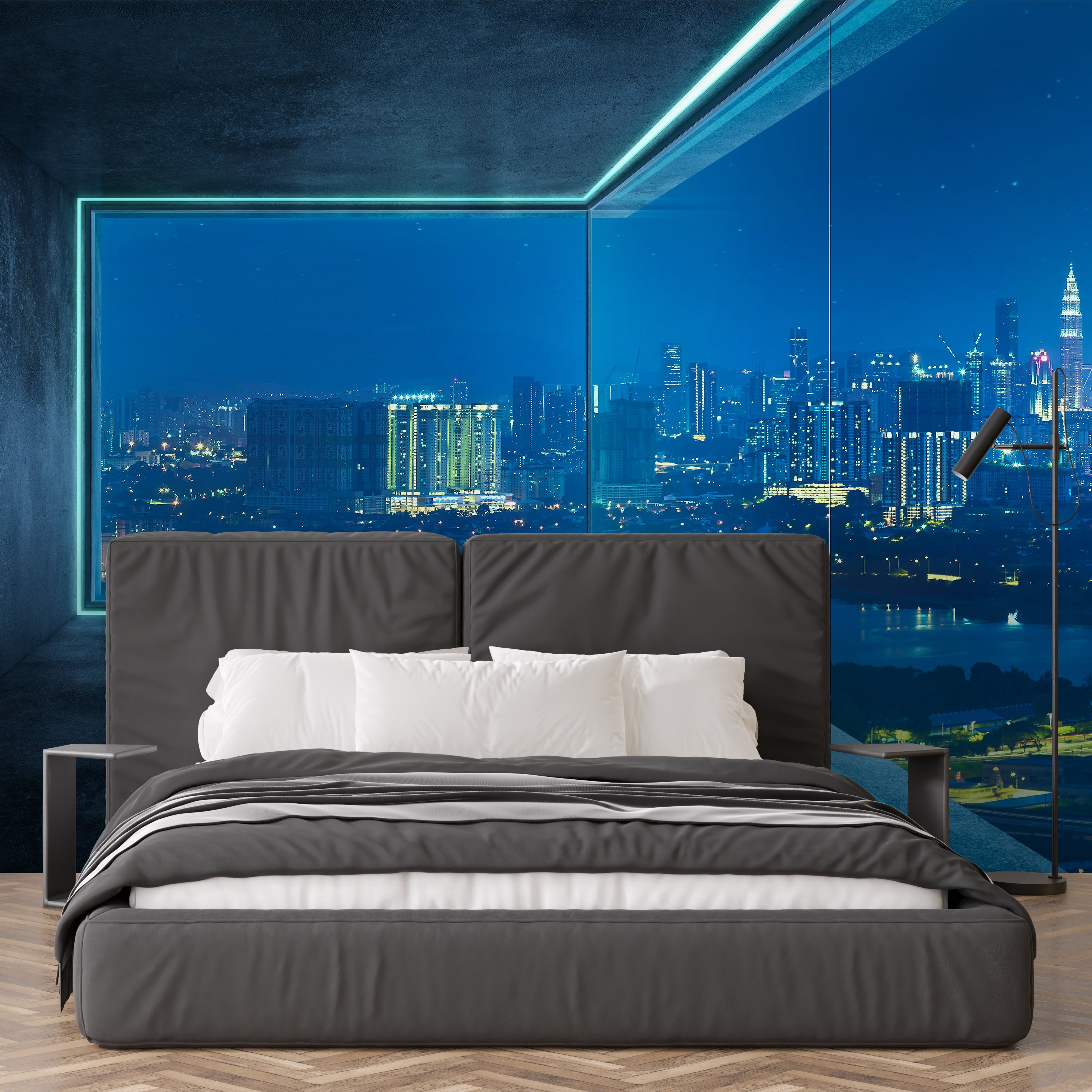 Experience the sleek and contemporary ambiance of a high-rise loft with stunning panoramic city views.