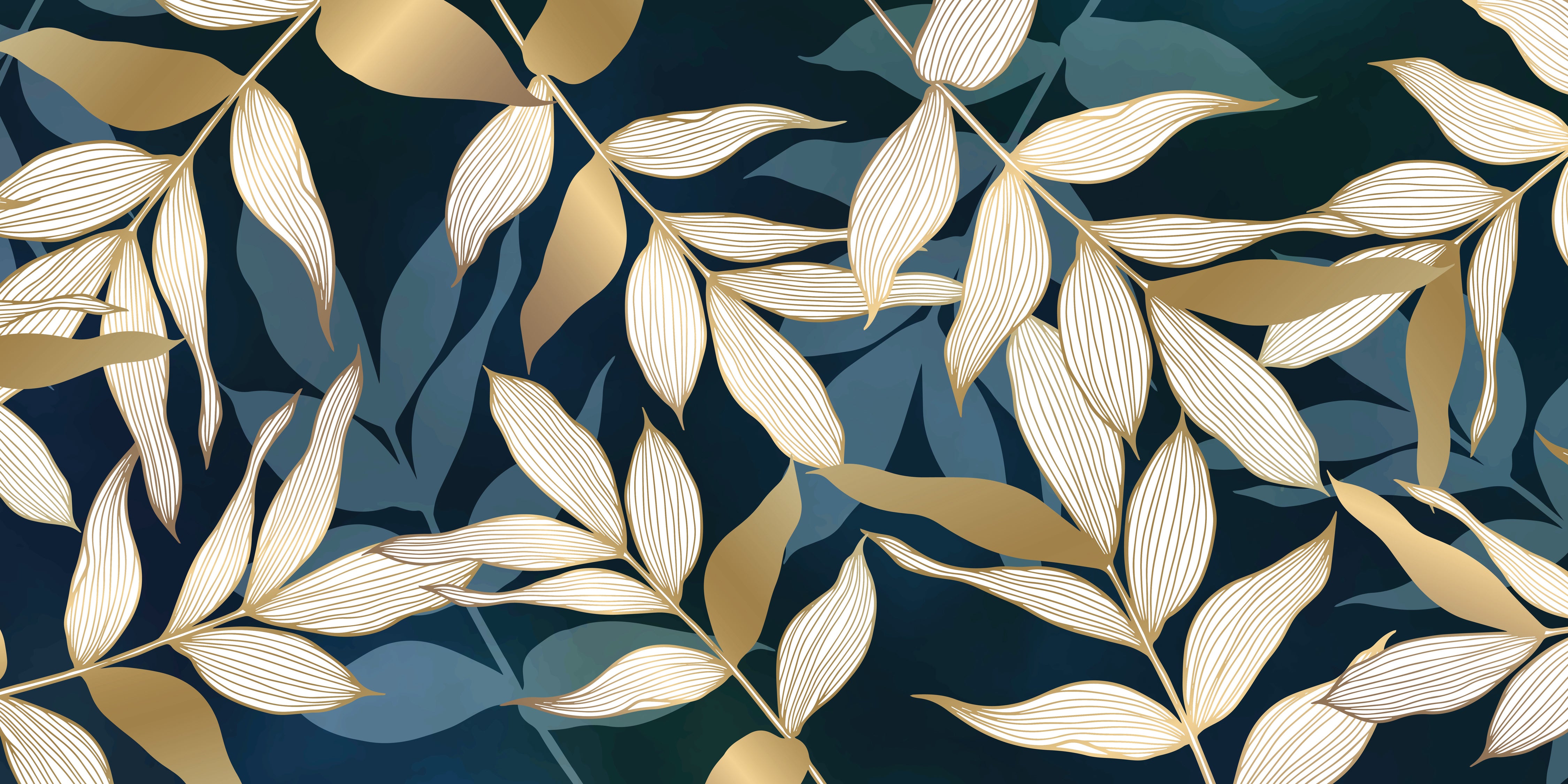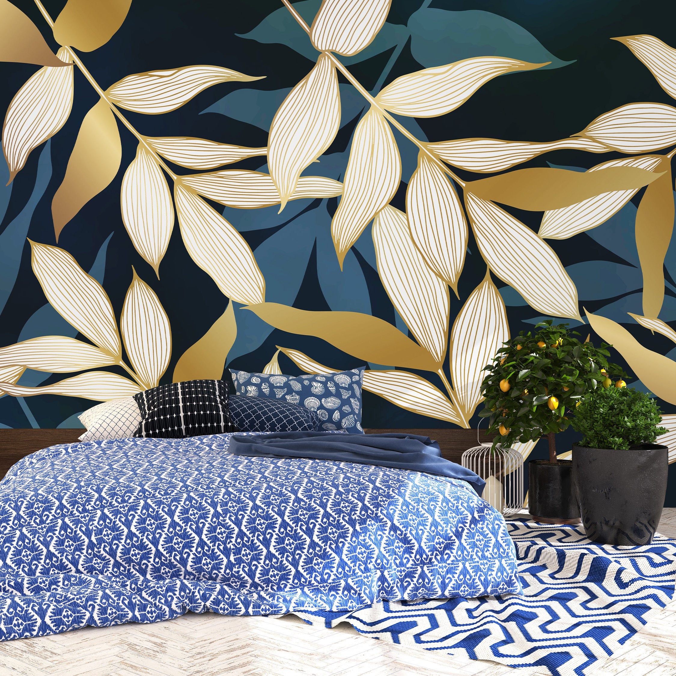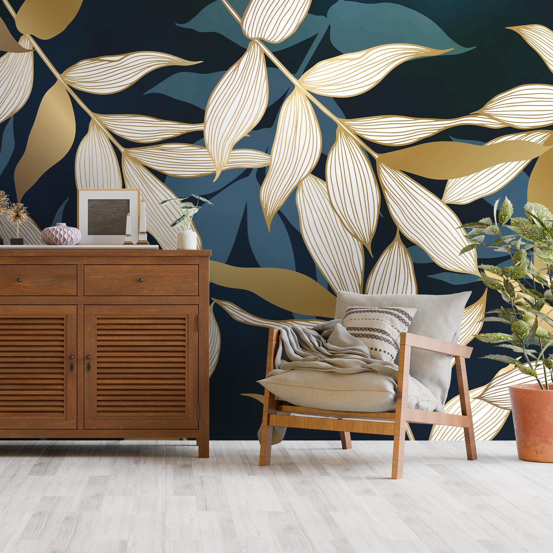 Add a touch of luxury. This piece features shimmering golden leaves on a rich background, bringing elegant botanical glamour and a soft gleam to your space.