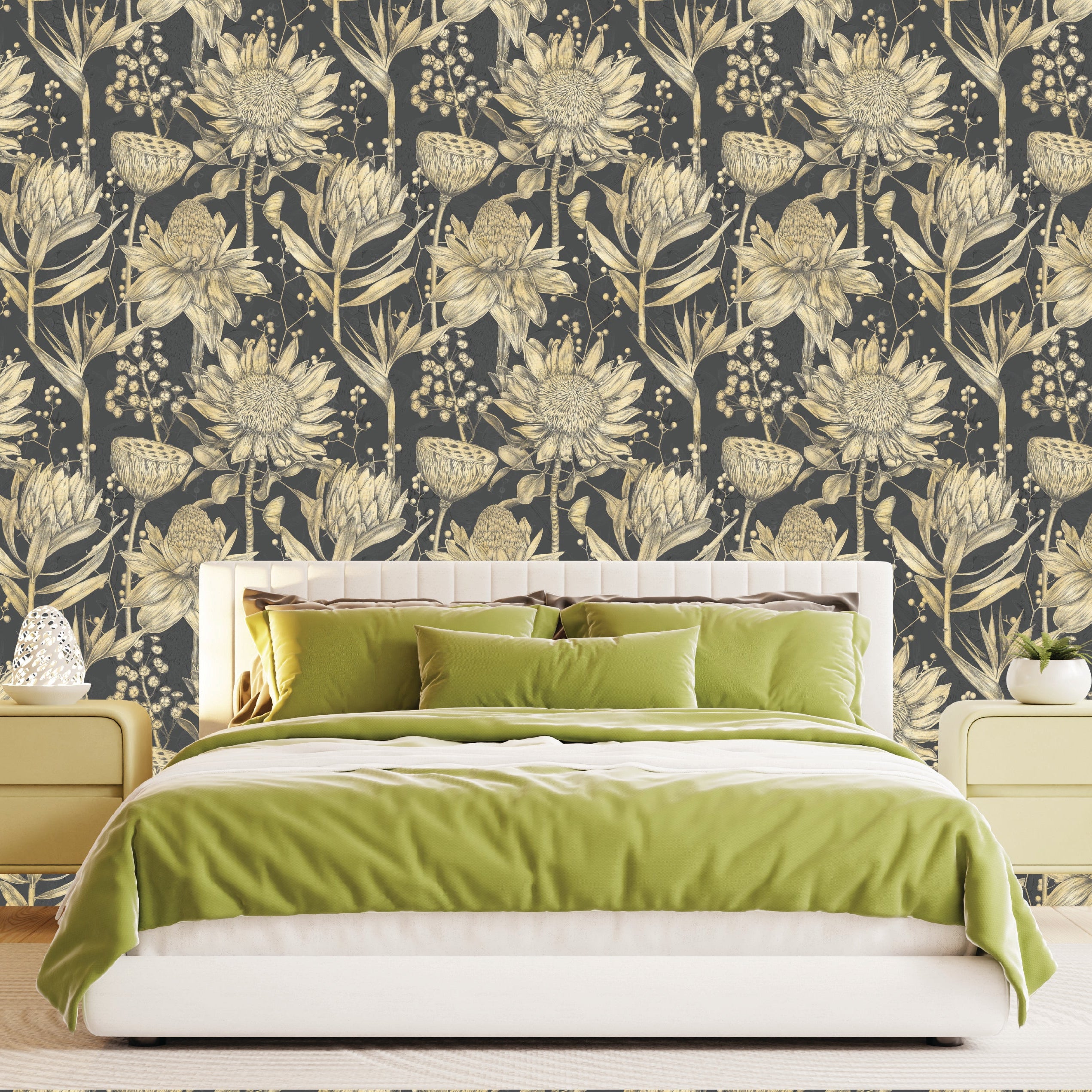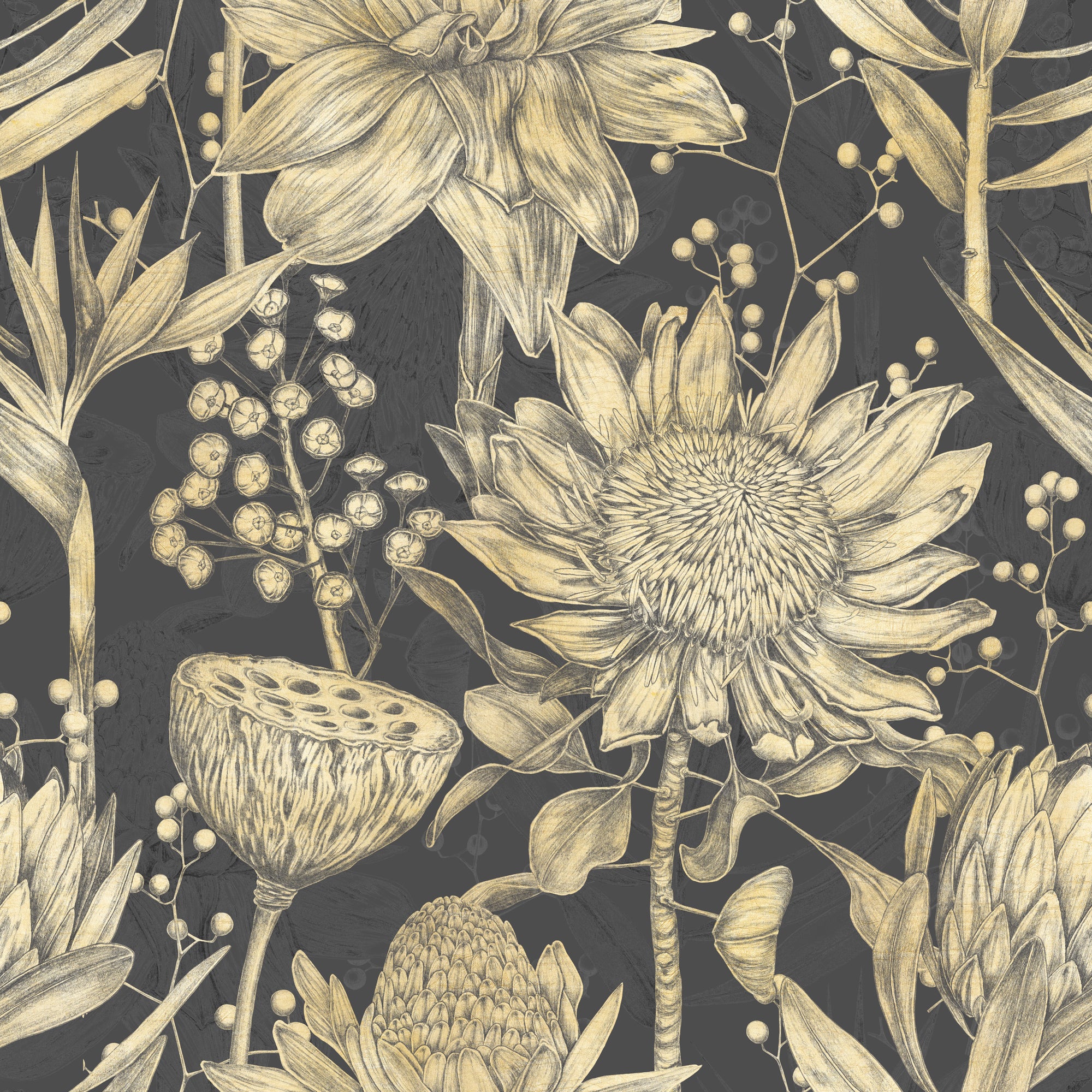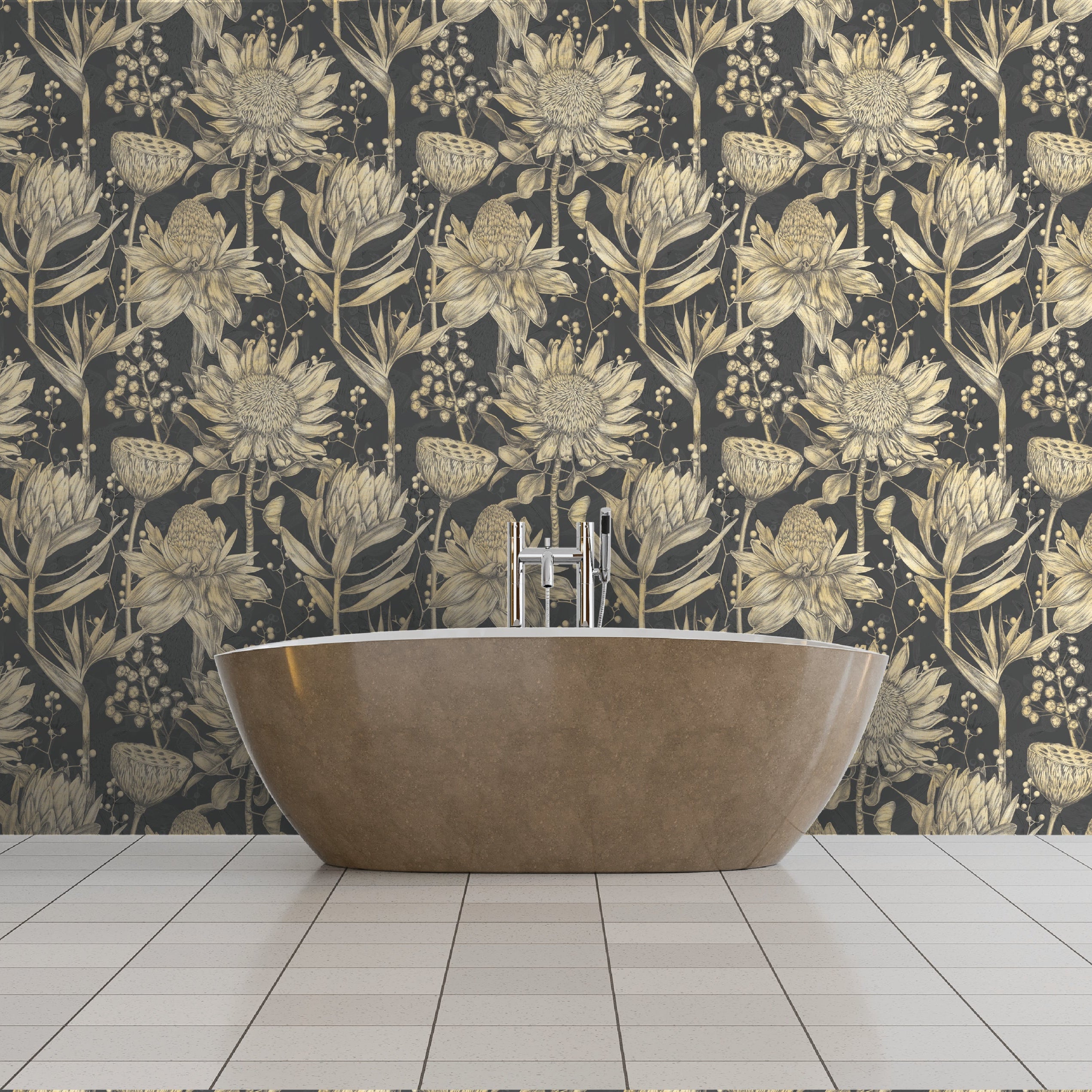 Discover the opulent beauty of sunflowers rendered in rich gold and sepia tones against a deep, sophisticated ground. This pattern exudes timeless elegance and warmth, perfect for a luxurious interior.