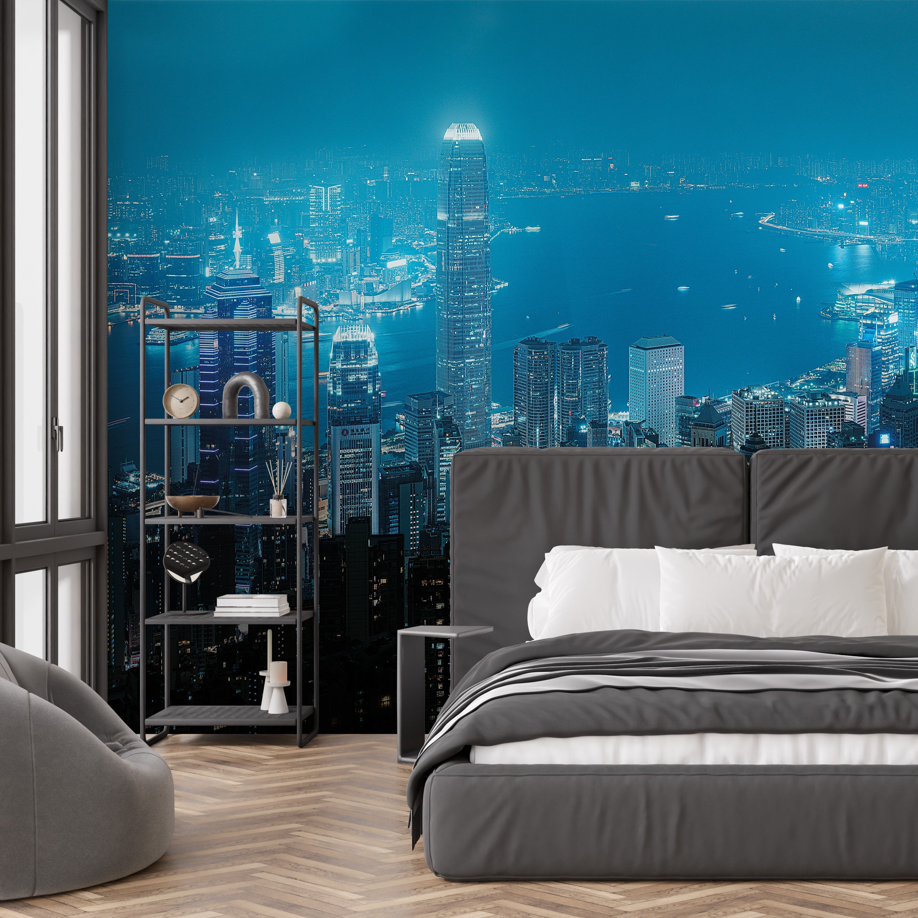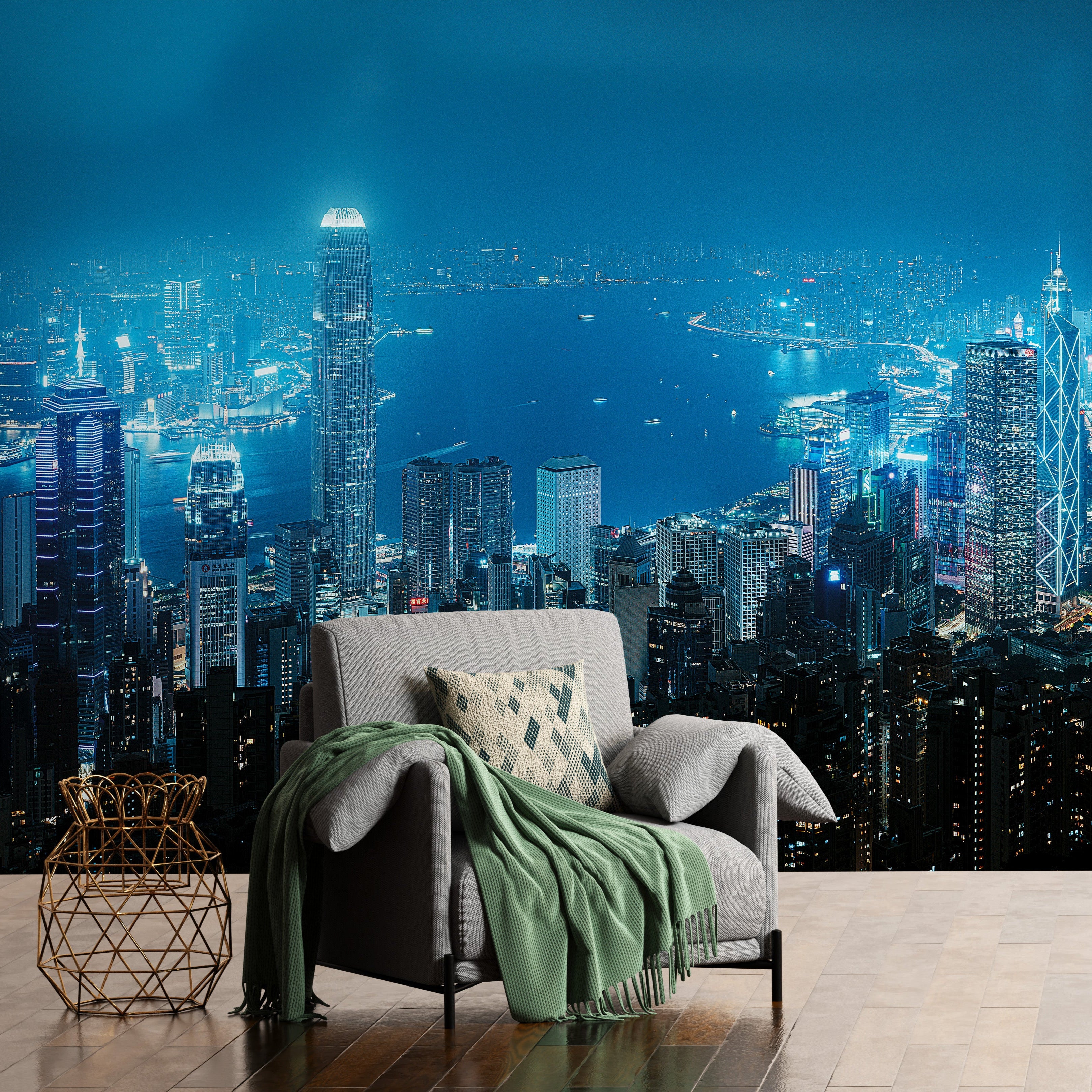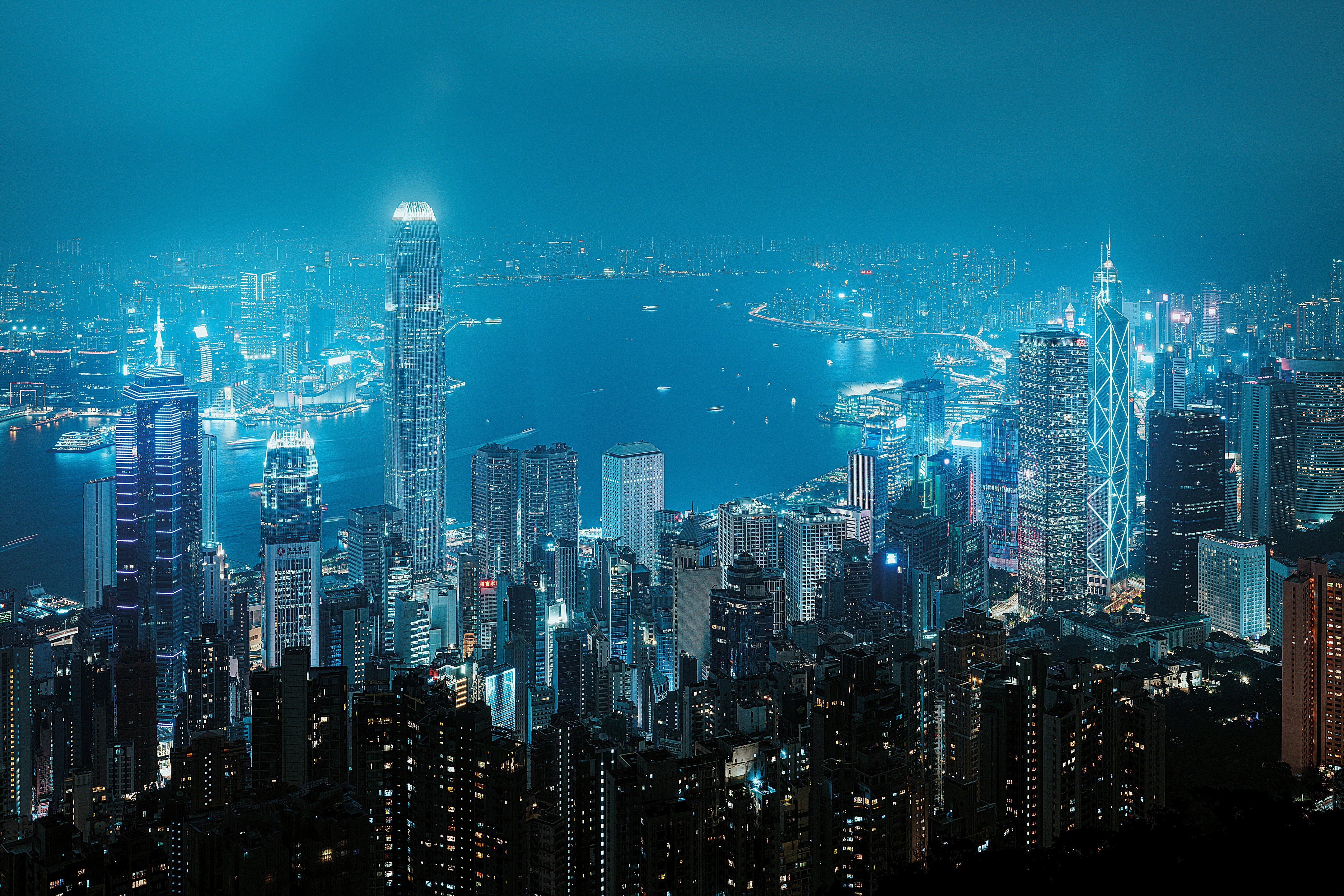 A dazzling nighttime cityscape bathed in cool blue and white lights, reflecting on the harbor, creating a vibrant interplay of urban density, water reflections, and nocturnal luminescence