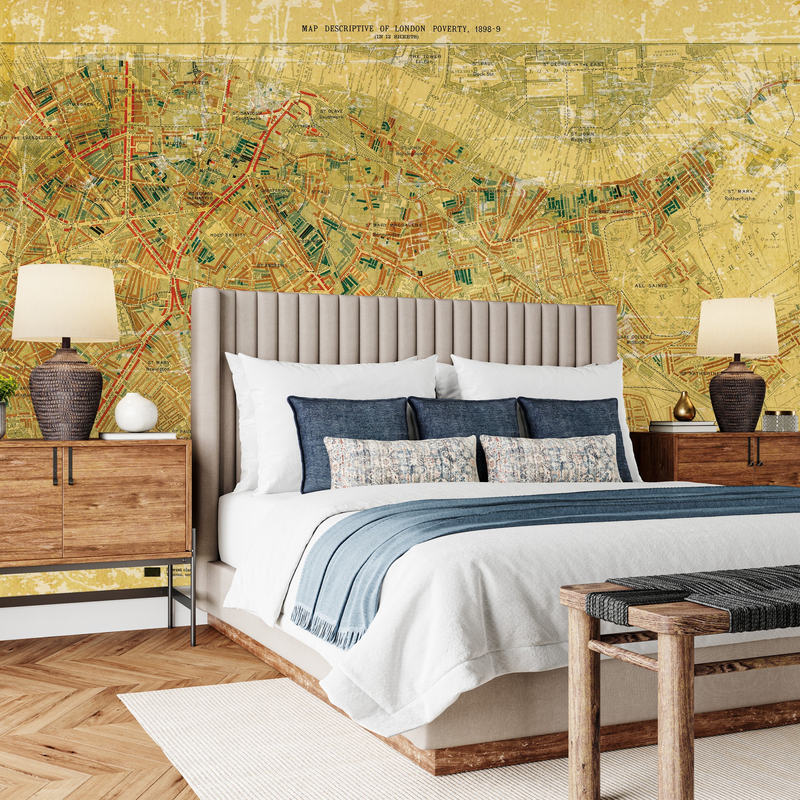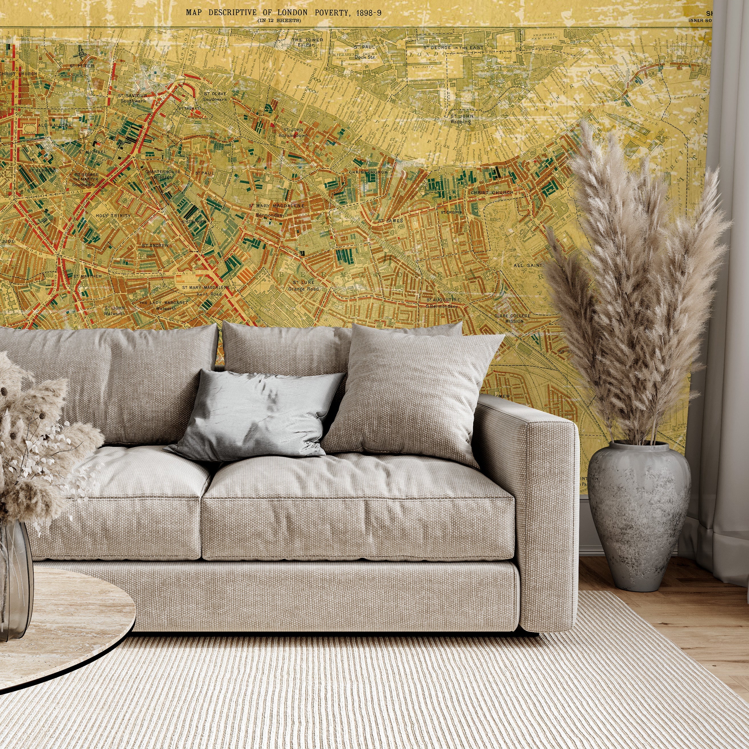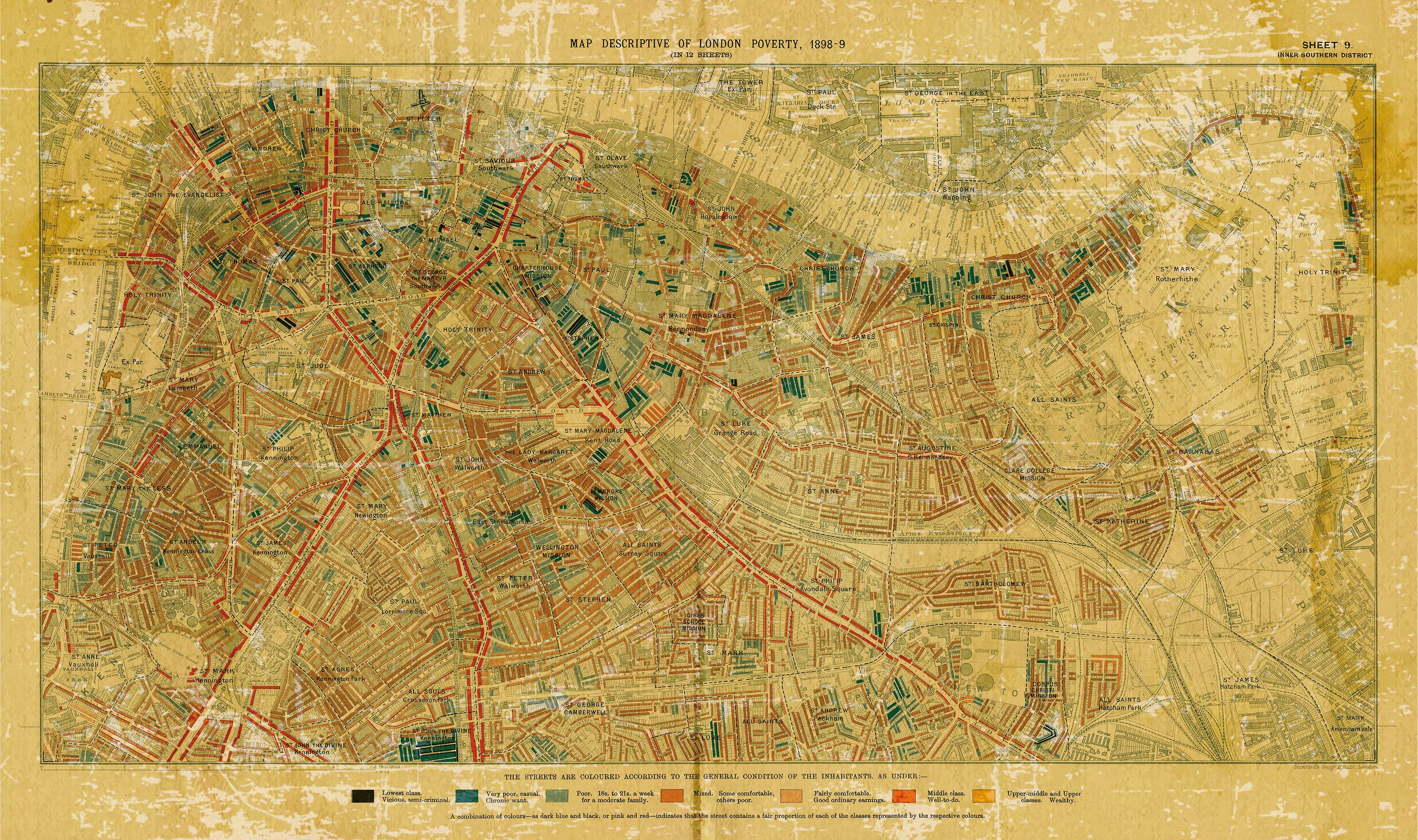 A detailed, aged map of London depicting poverty levels street by street with color codes, revealing a stark interplay of social disparity, urban geography, and historical insight