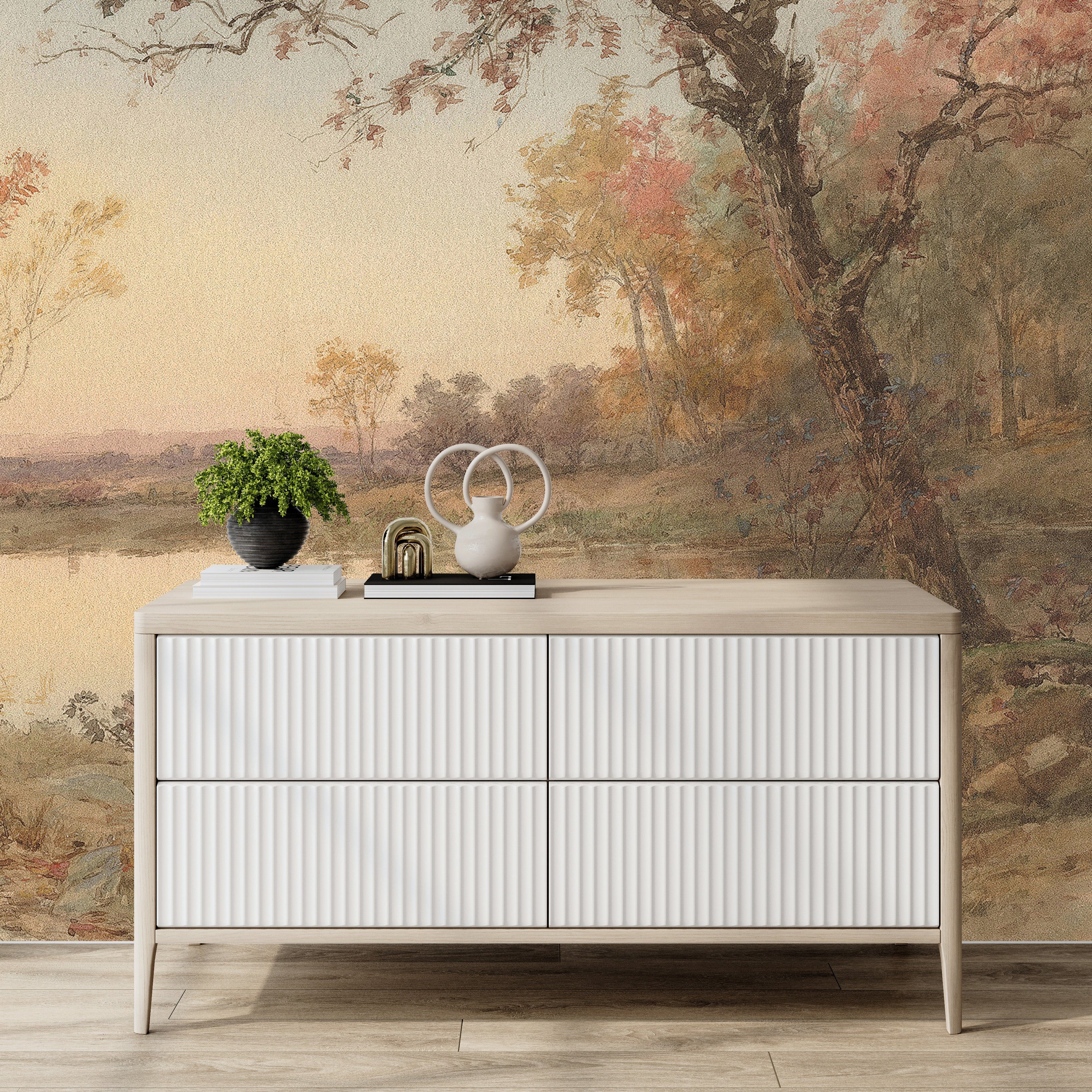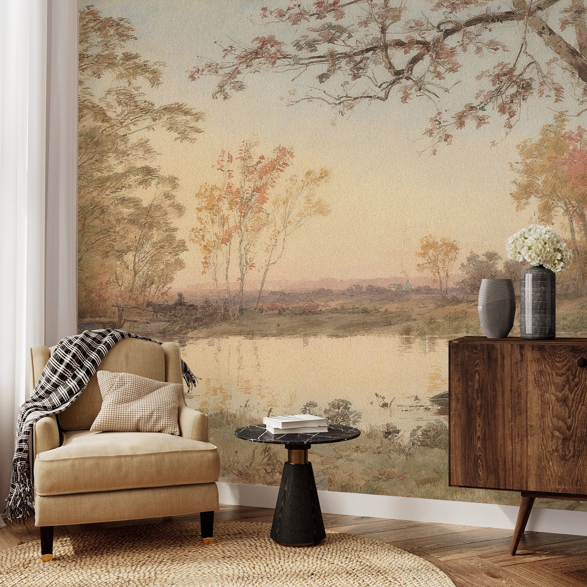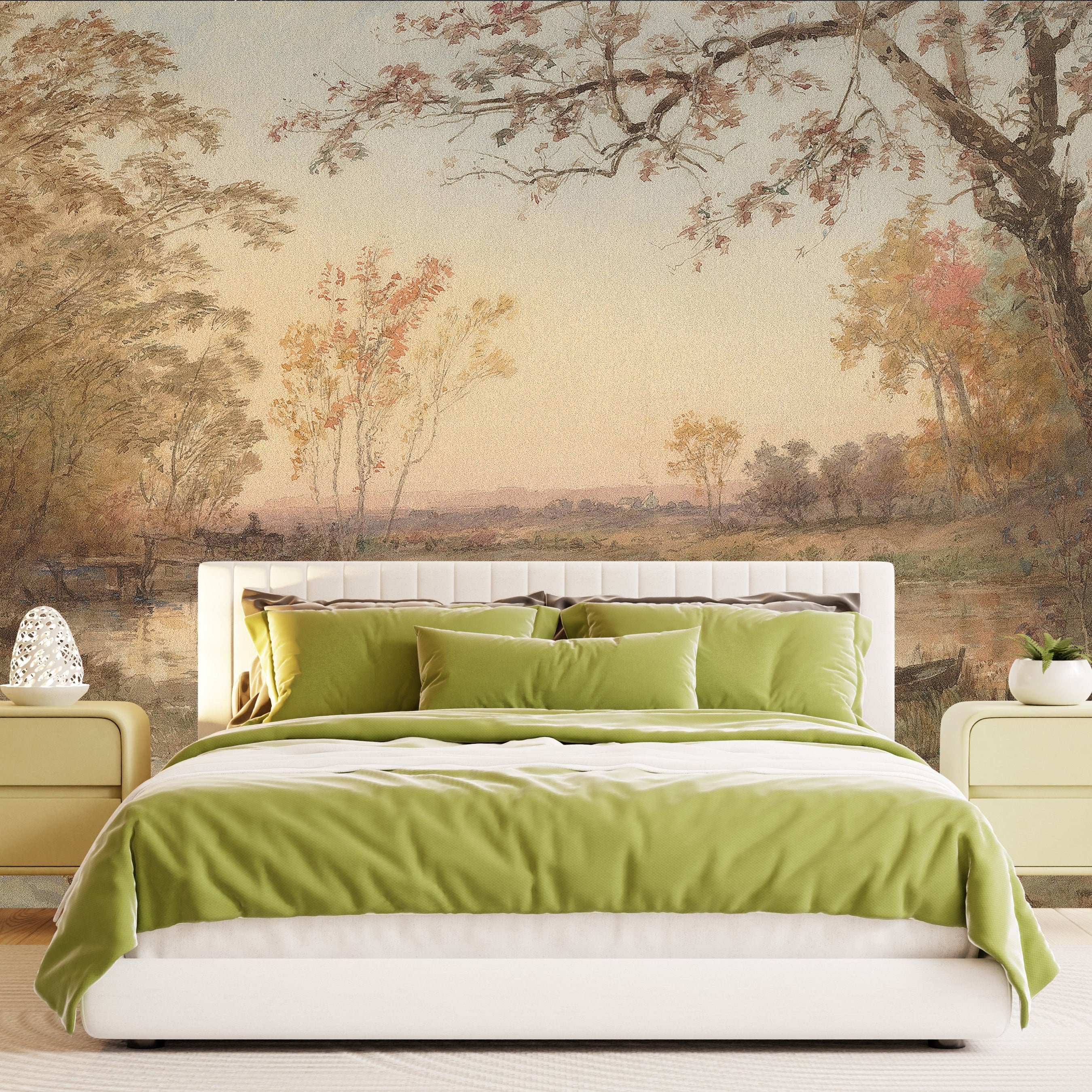 A quiet riverside scene with a lone boat resting near the shore, framed by autumn trees and a soft, pastel-toned sunset sky