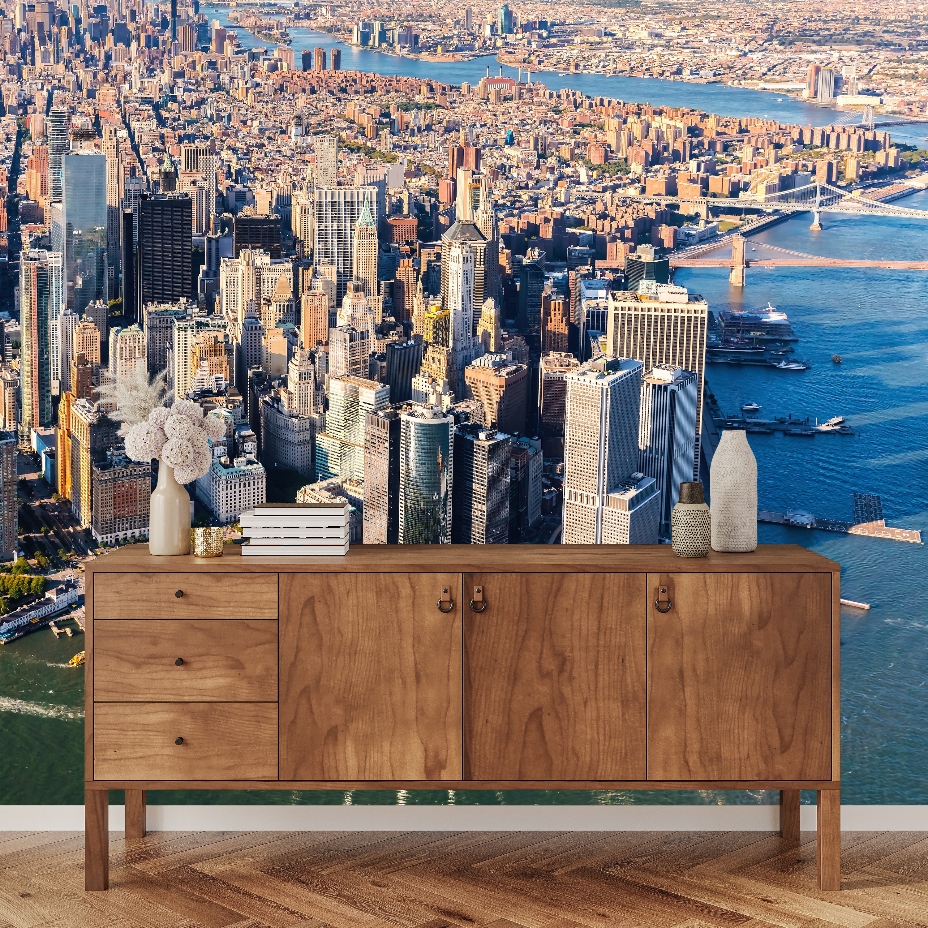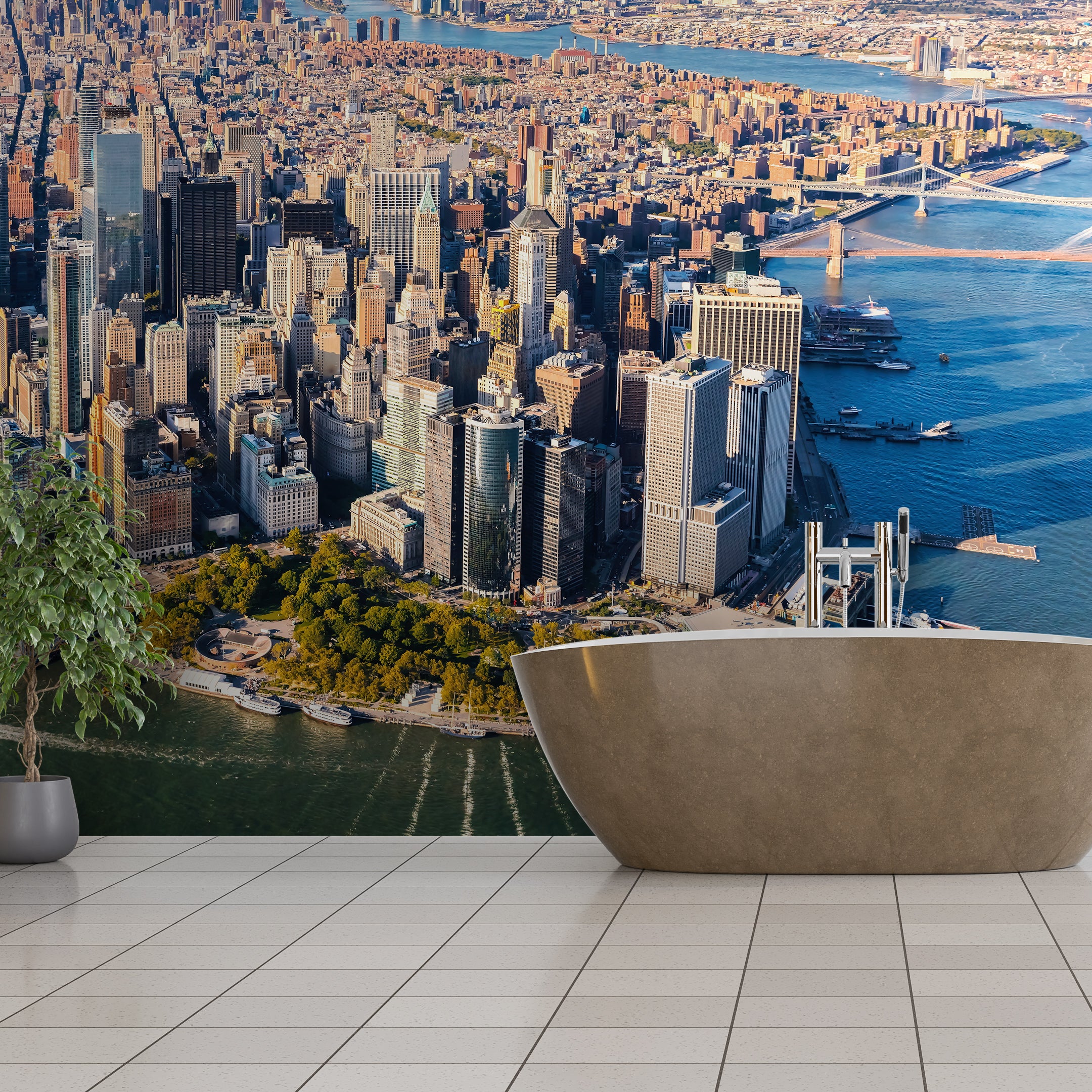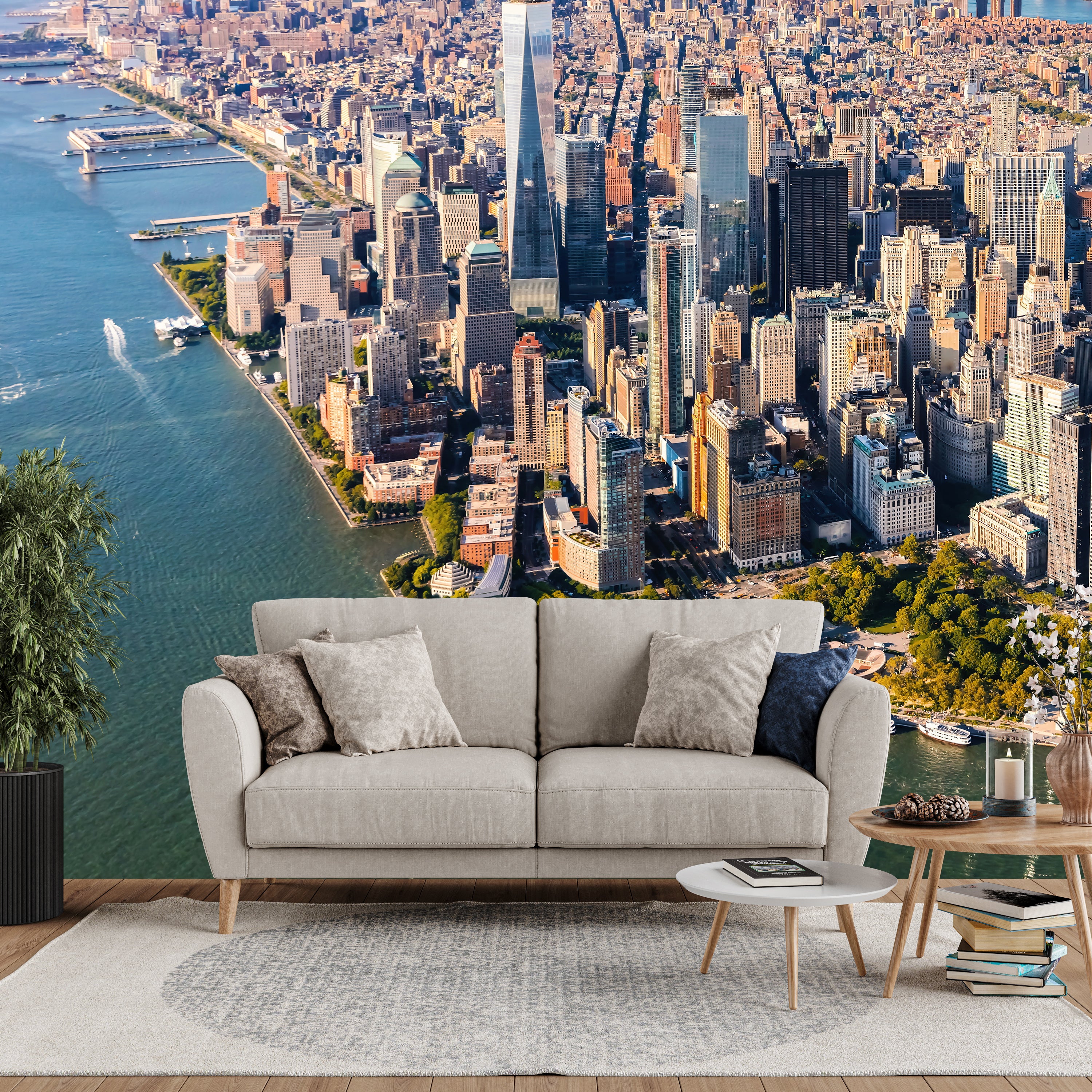 A stunning aerial view capturing the iconic skyscrapers of Manhattan, showcasing the density and grandeur of New York City.