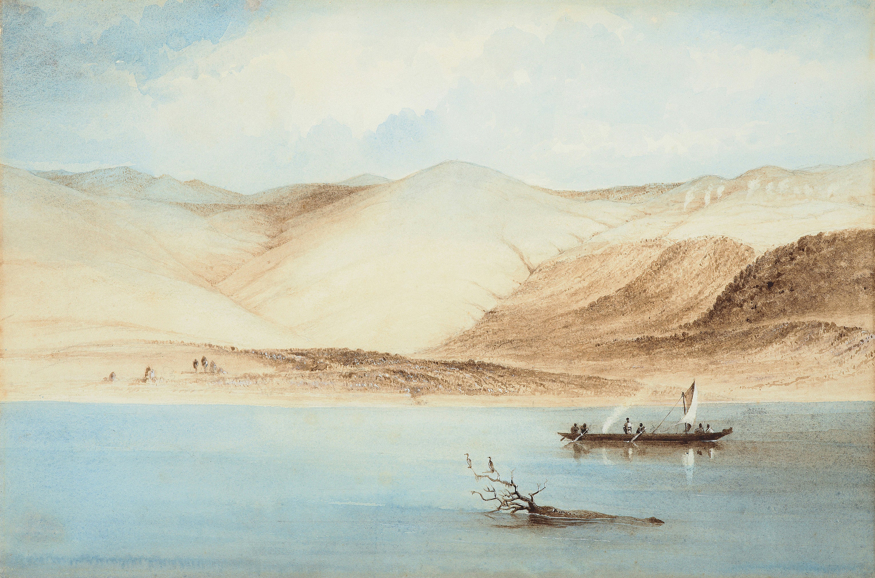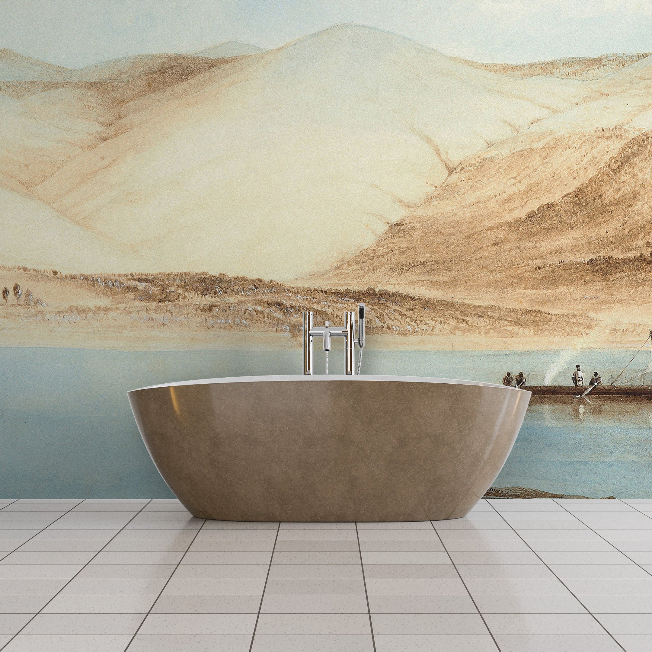 A serene boat glides across calm blue waters against a backdrop of sandy hills and distant, misty mountains under a pale, hazy sky