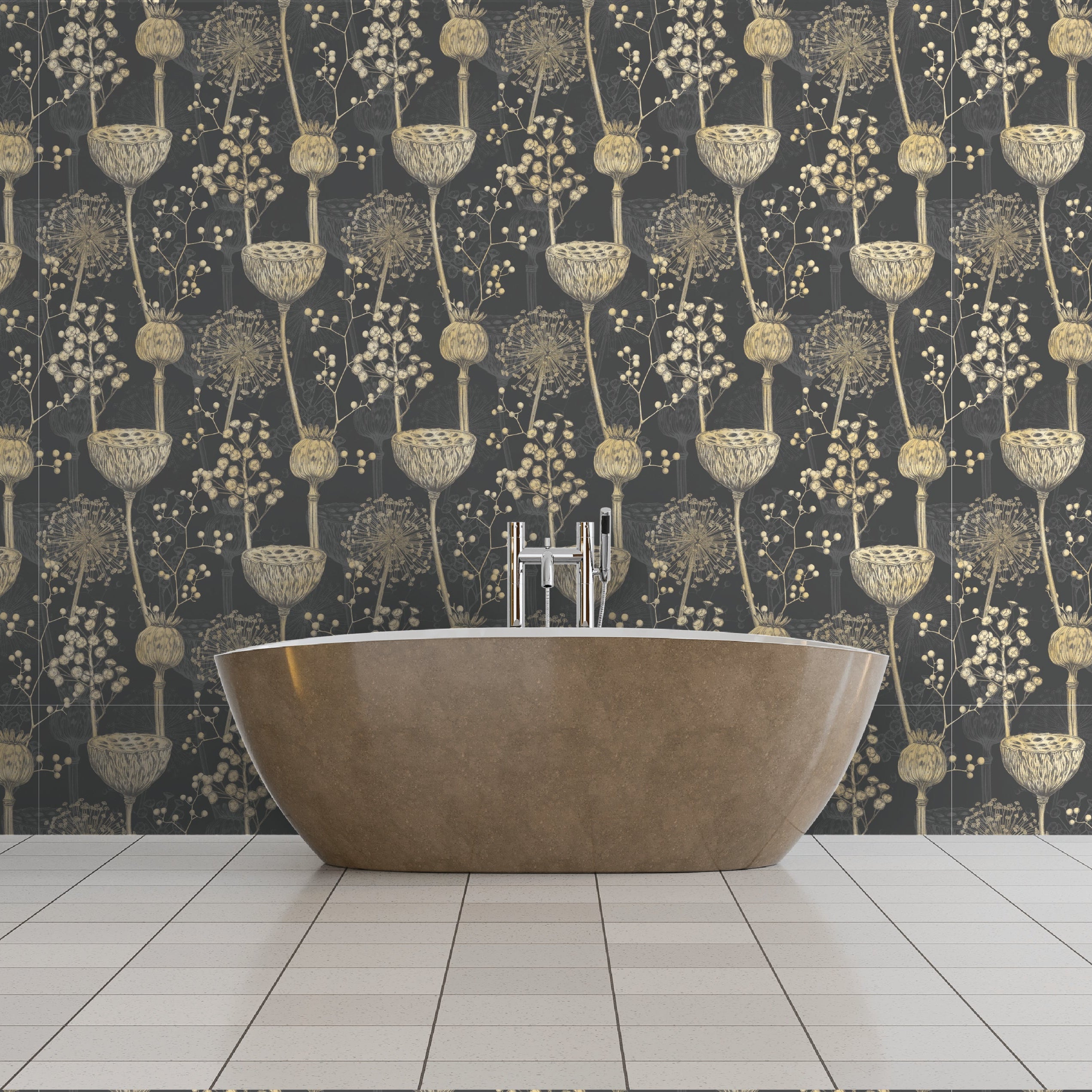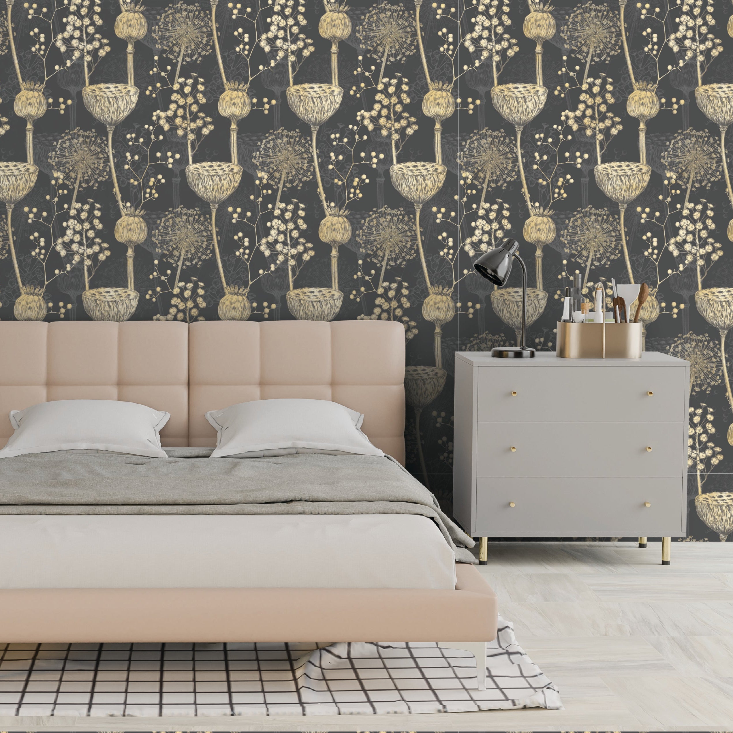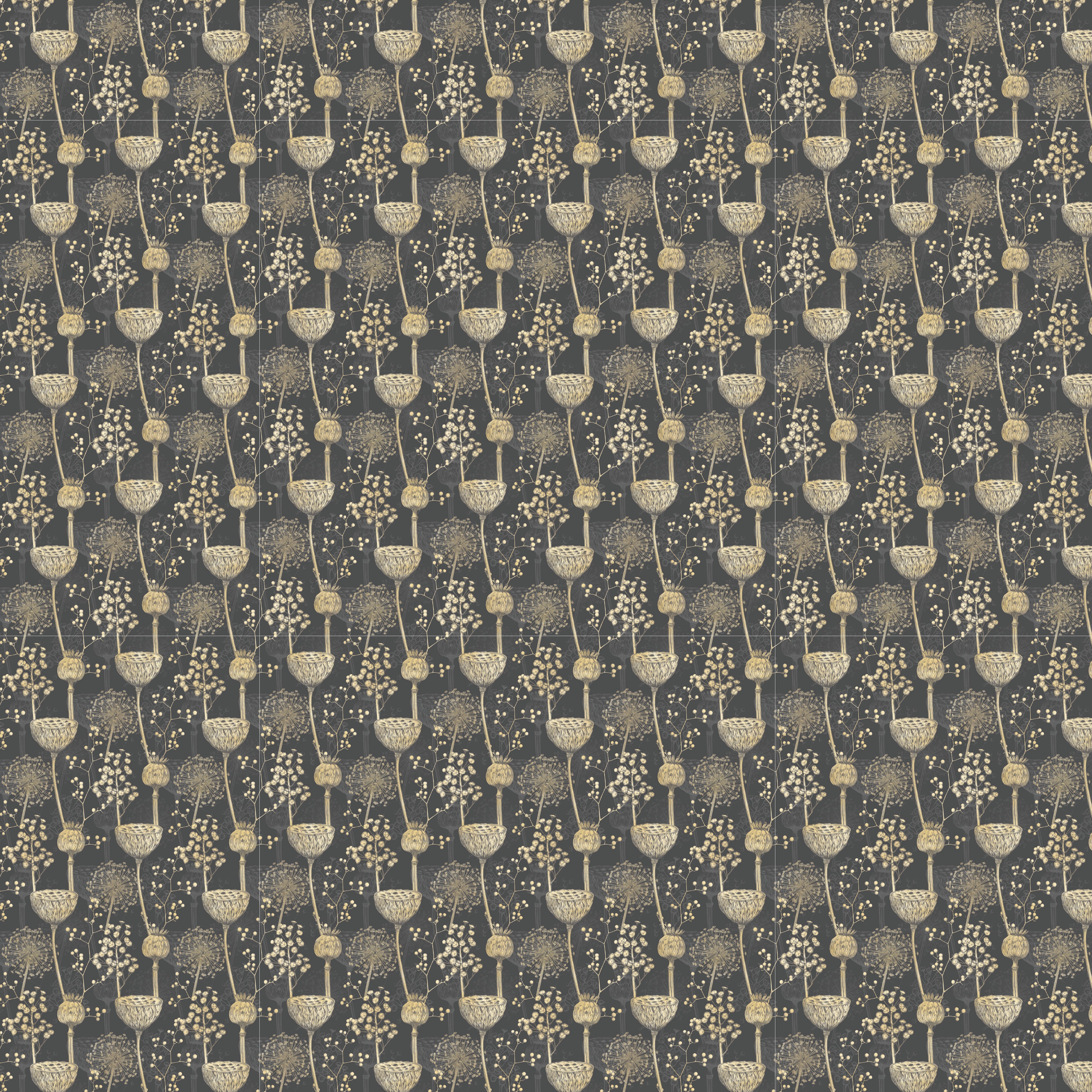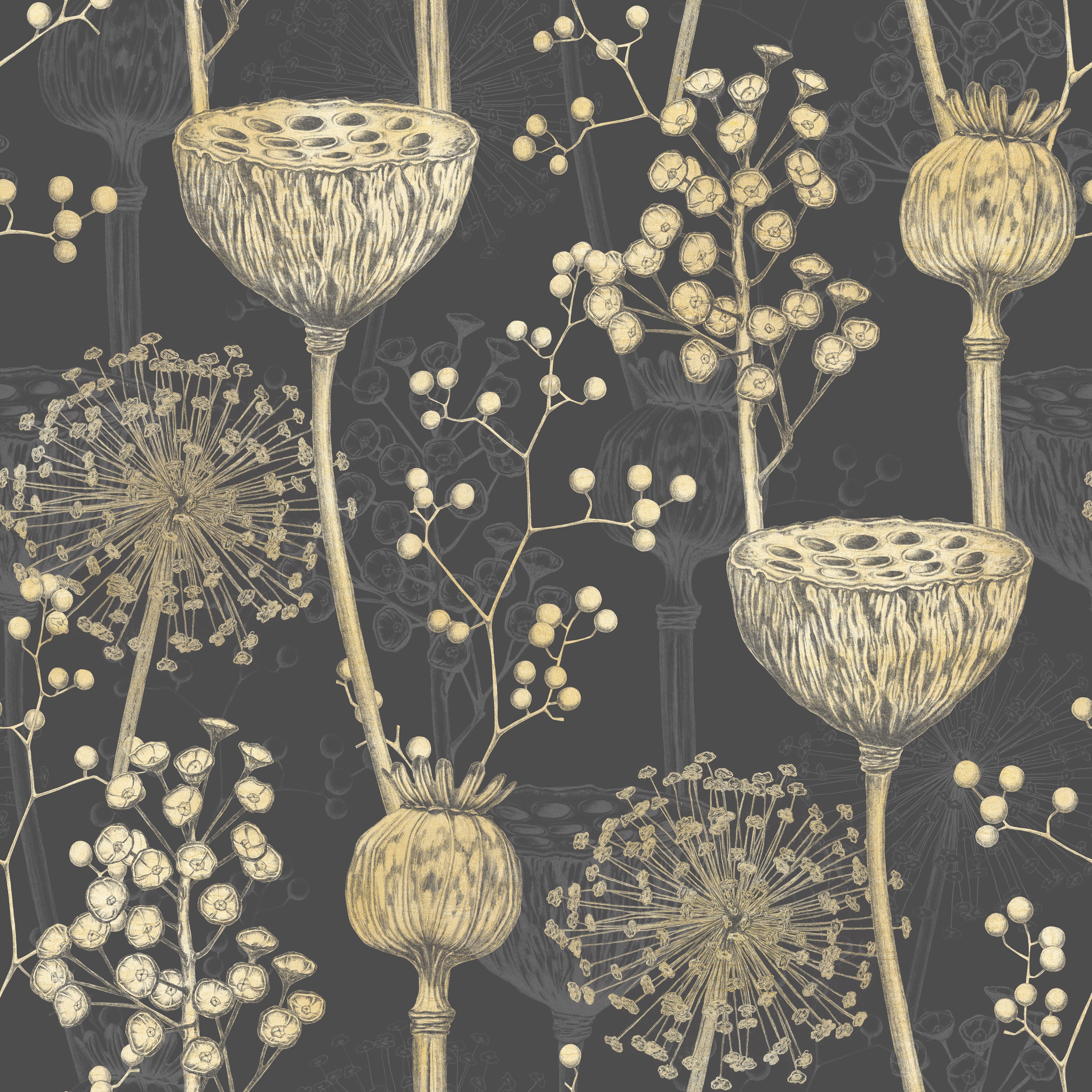An elegant and intricate pattern showcasing various botanical forms, including delicate seed pods, in rich sepia and warm golden tones. Set against a deep, muted background, this design evokes the timeless beauty of a tranquil meadow, offering a sophisticated and inviting ambiance with a vintage touch.