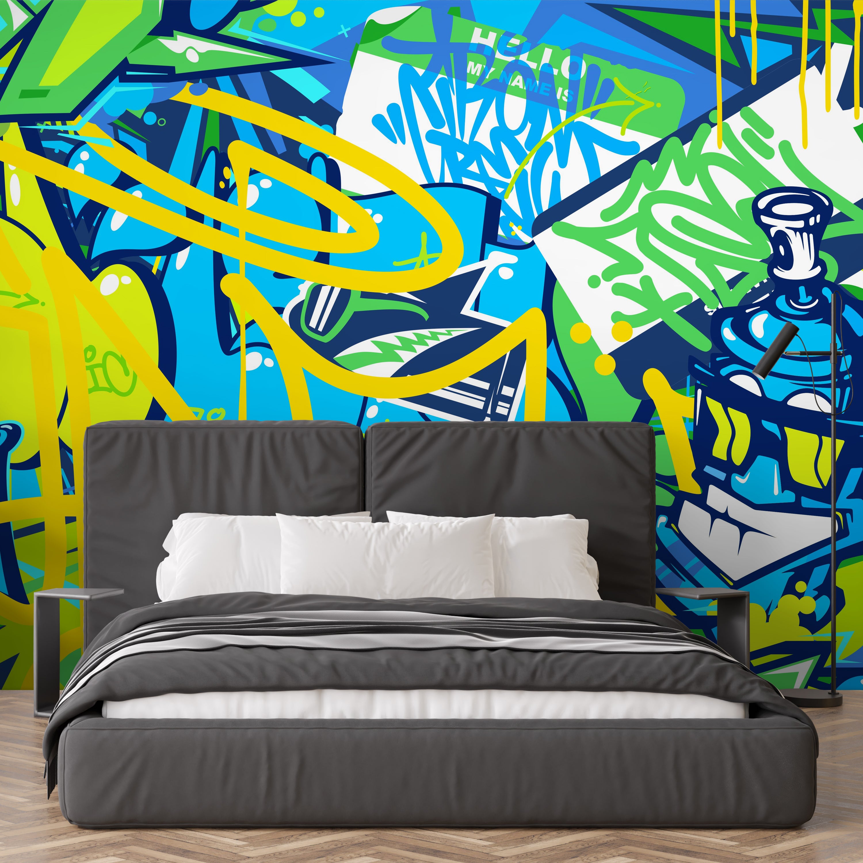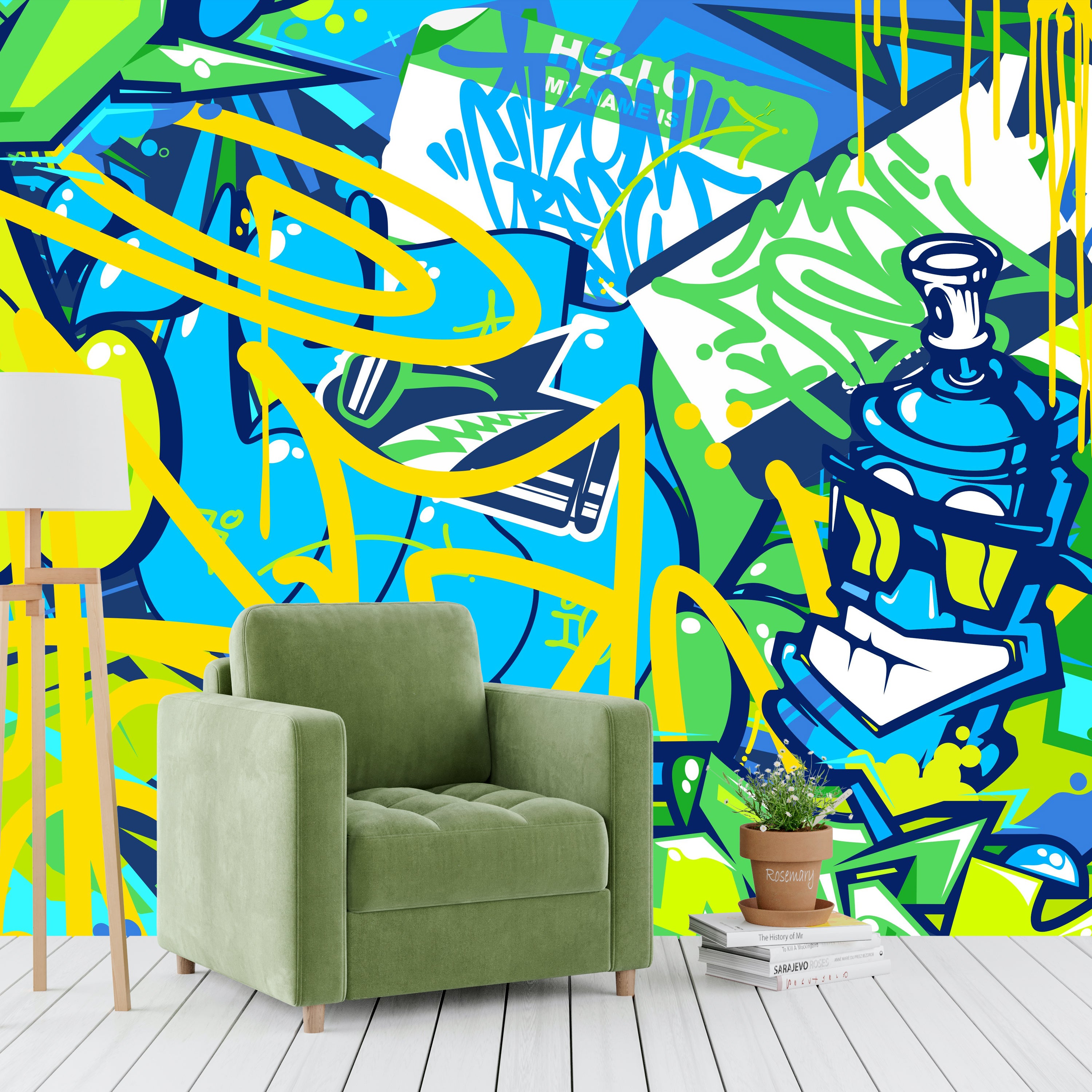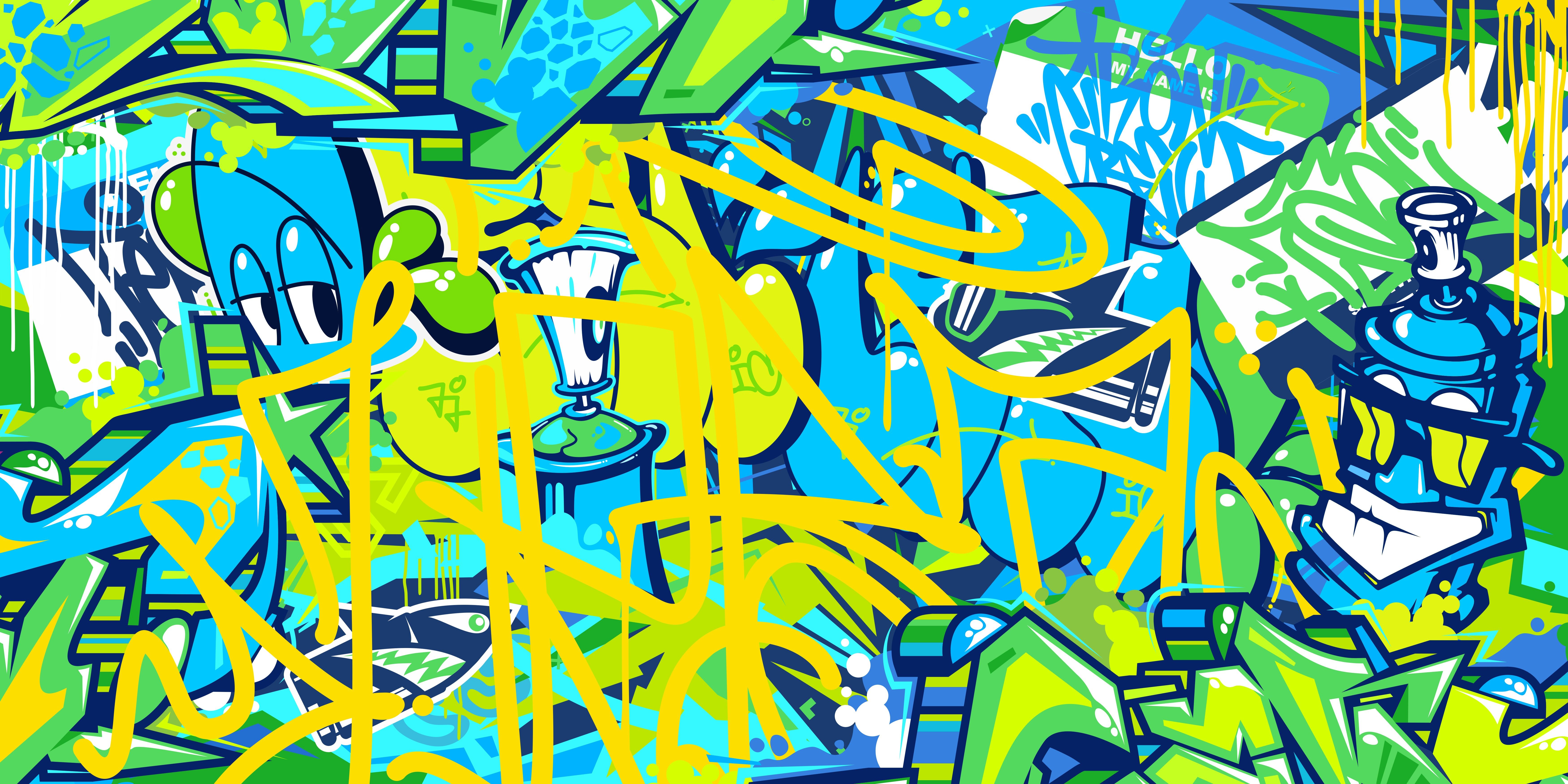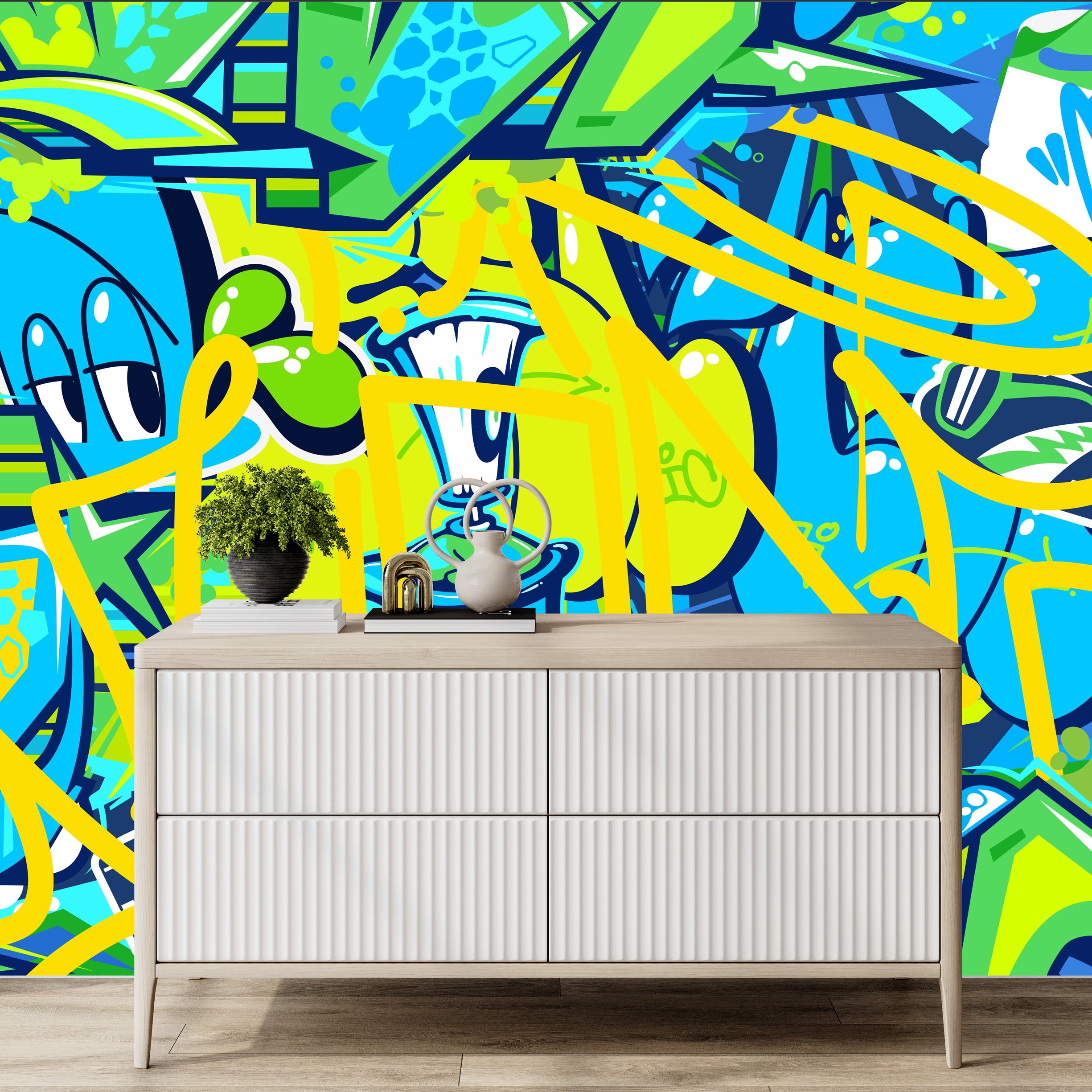 Ignite your space with a playful explosion of color and cartoonish chaos. This mural's vibrant graffiti and quirky characters bring a dynamic, urban energy.