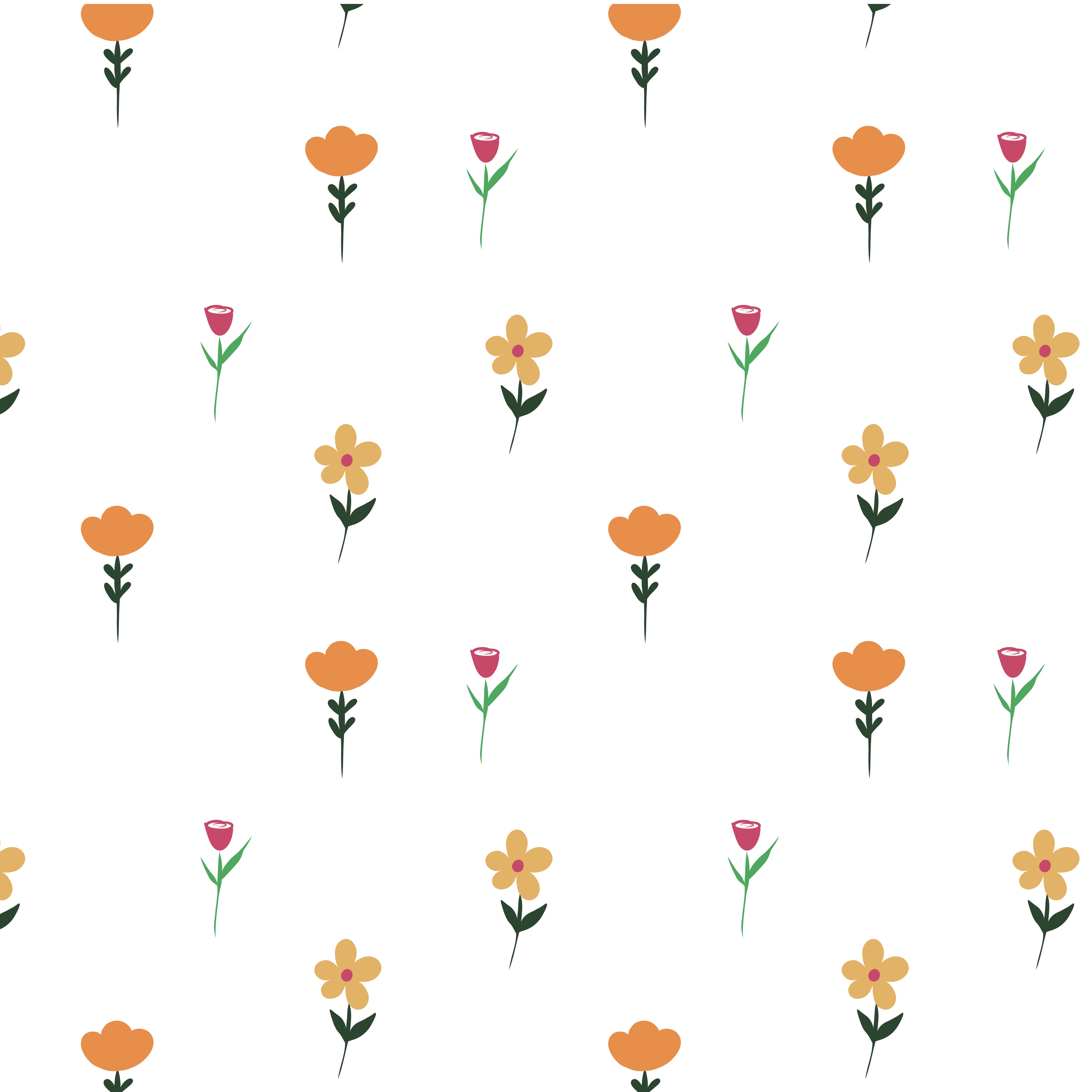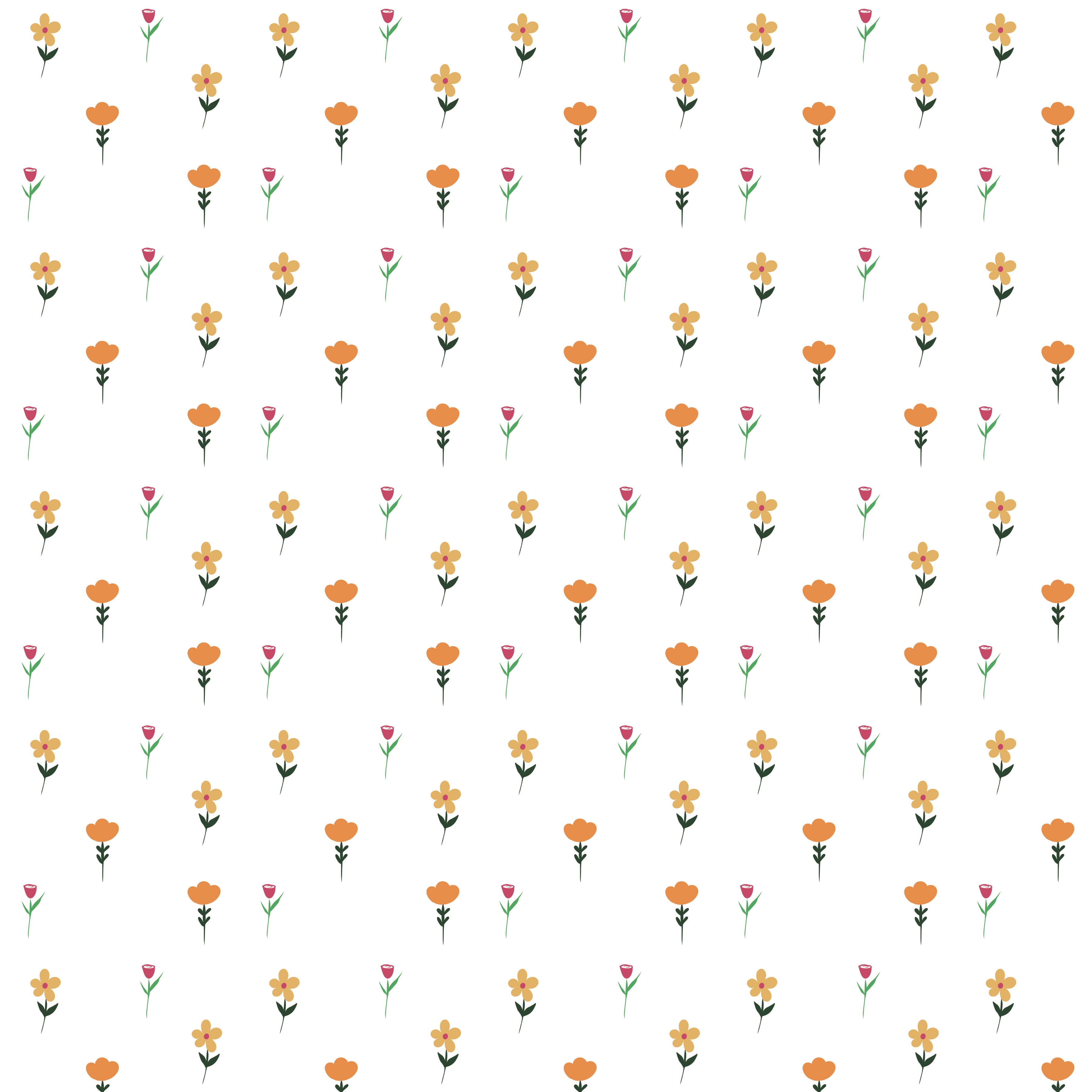 A cheerful wallpaper featuring a scattered pattern of small, vibrant orange flowers and delicate red buds on a white background. It brings a fresh, whimsical garden feel indoors
