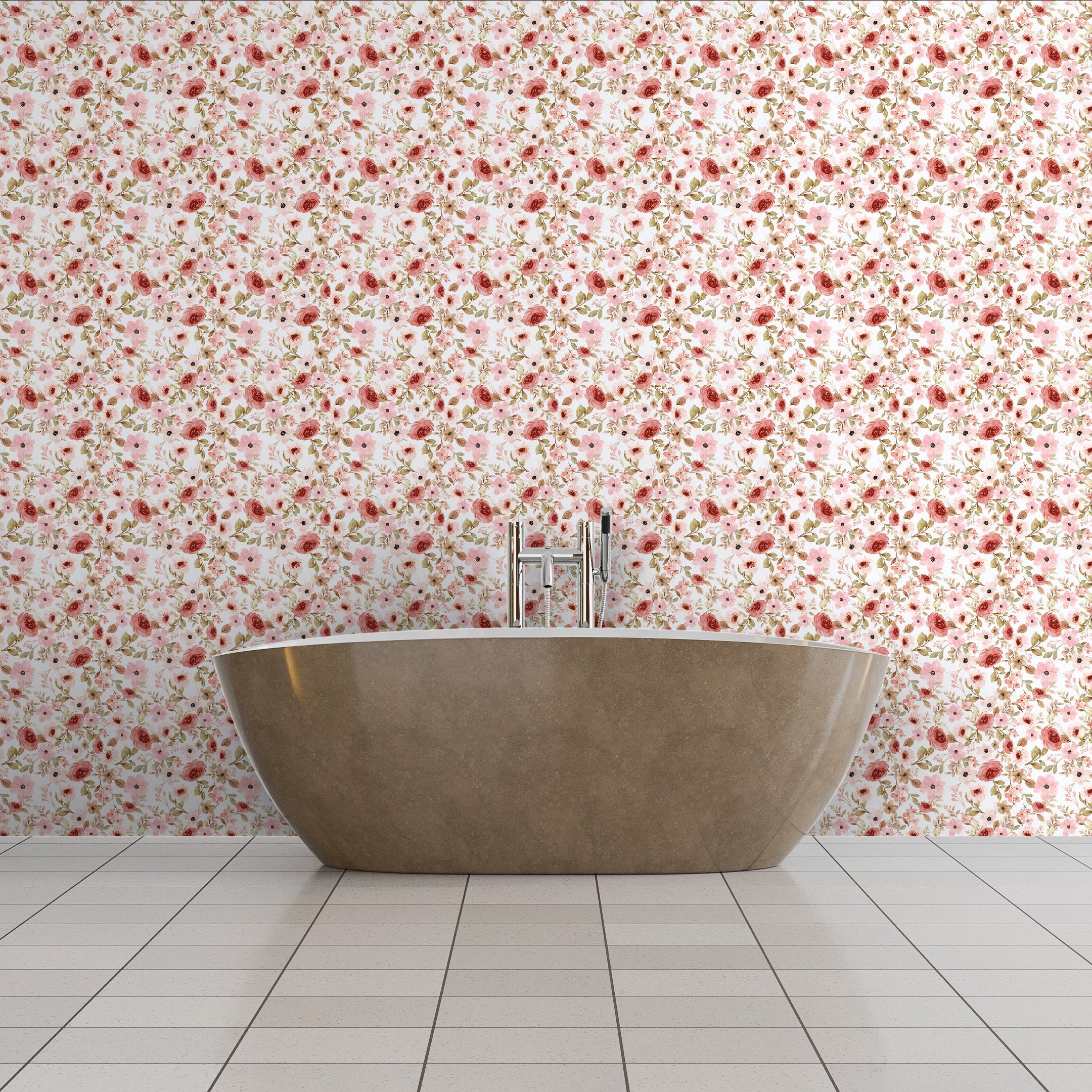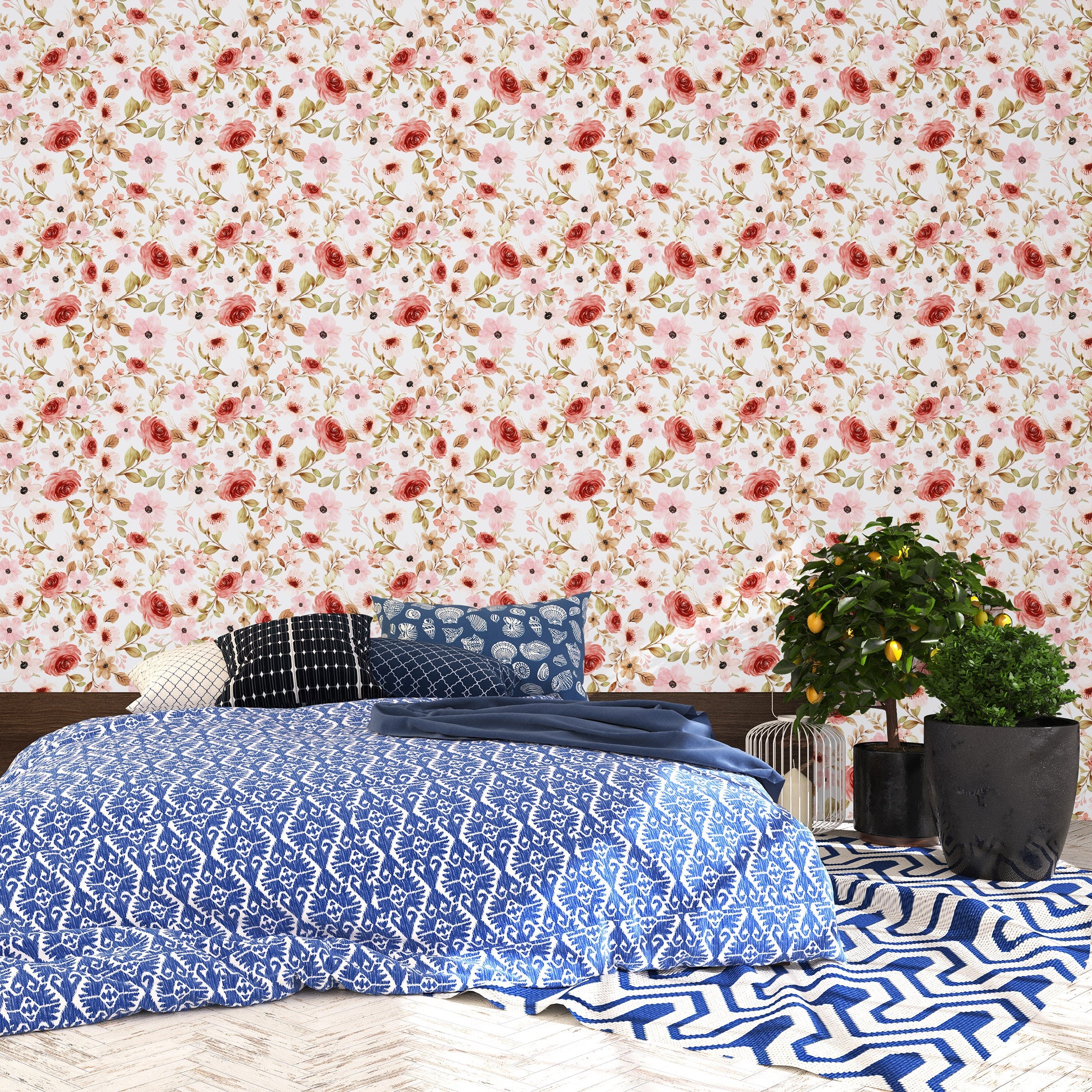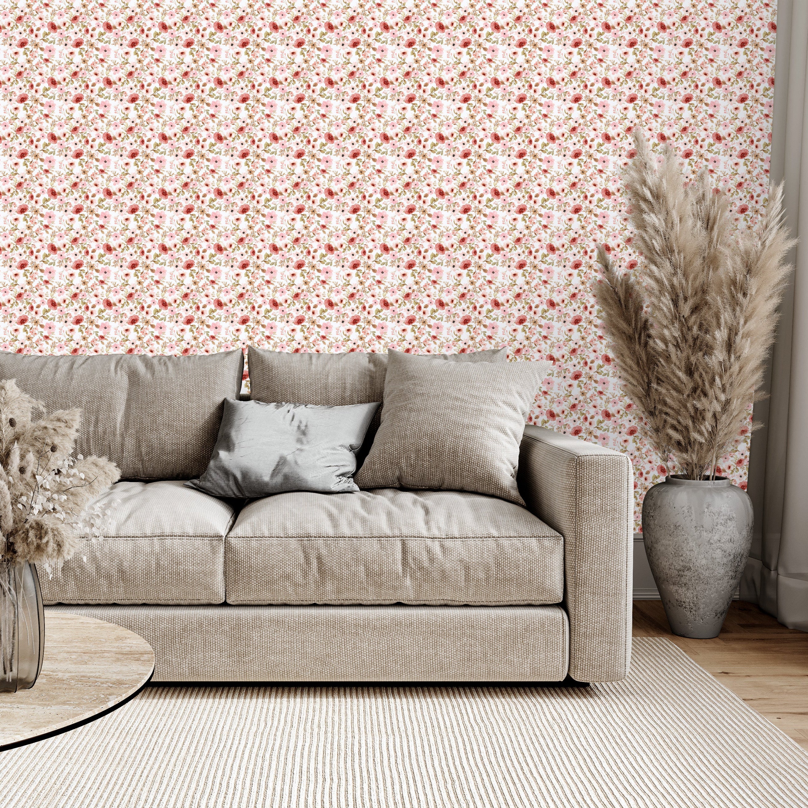 A charming wallpaper featuring a seamless pattern of small, delicate pink and red roses with green and brown leaves, scattered across a light background. It evokes a whimsical, romantic garden feel, perfect for adding subtle floral elegance to any space.