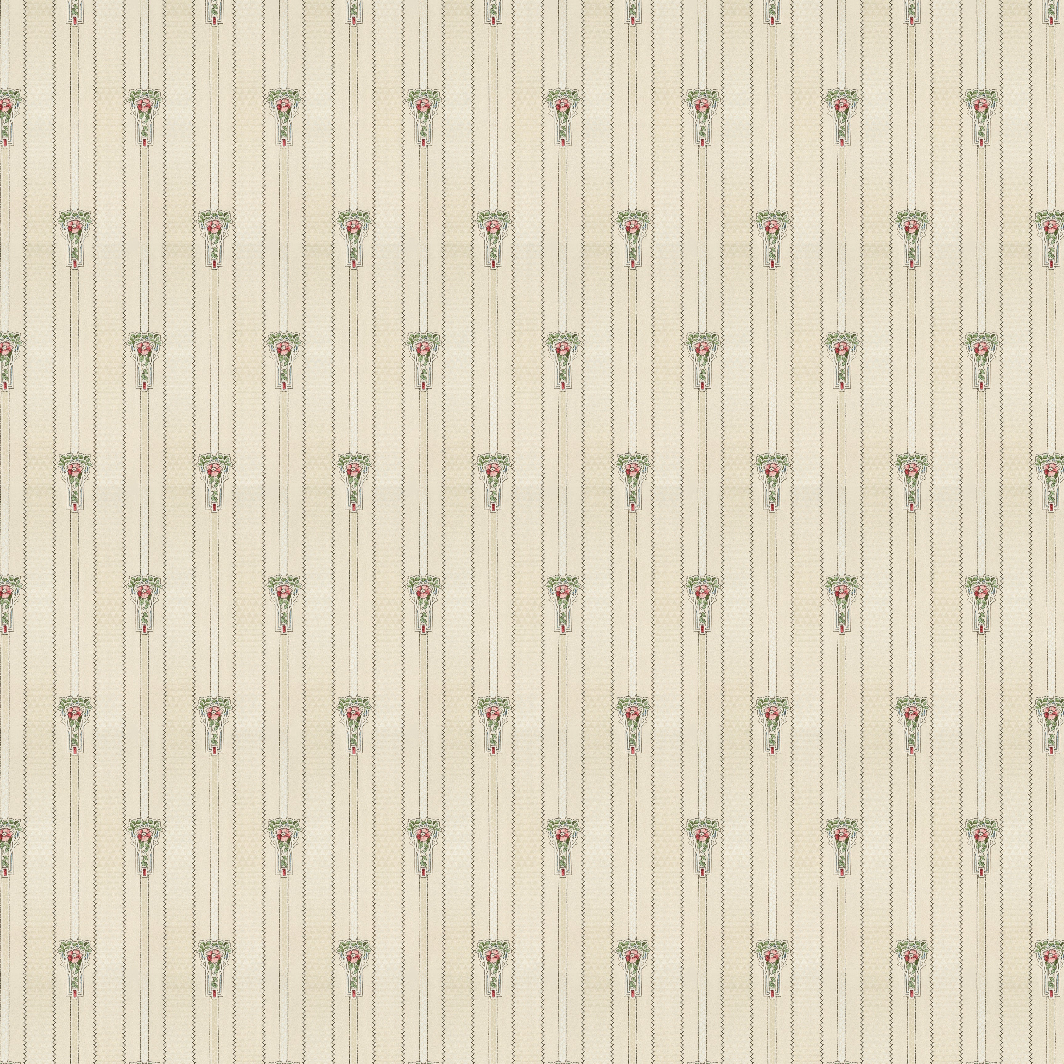 A delicate vintage wallpaper with vertical stripes and small floral arrangements in urns, evoking the charm of classic Victorian interiors