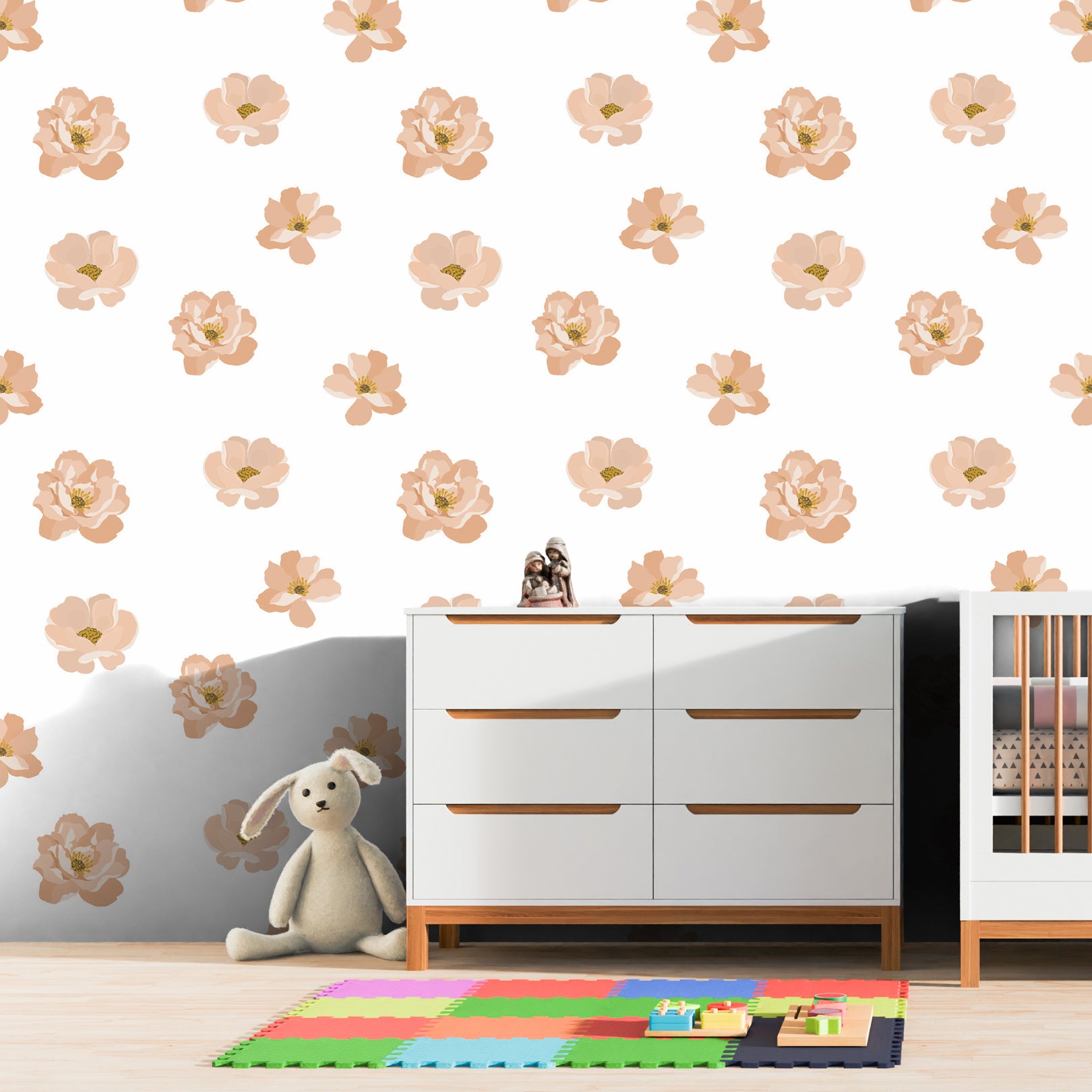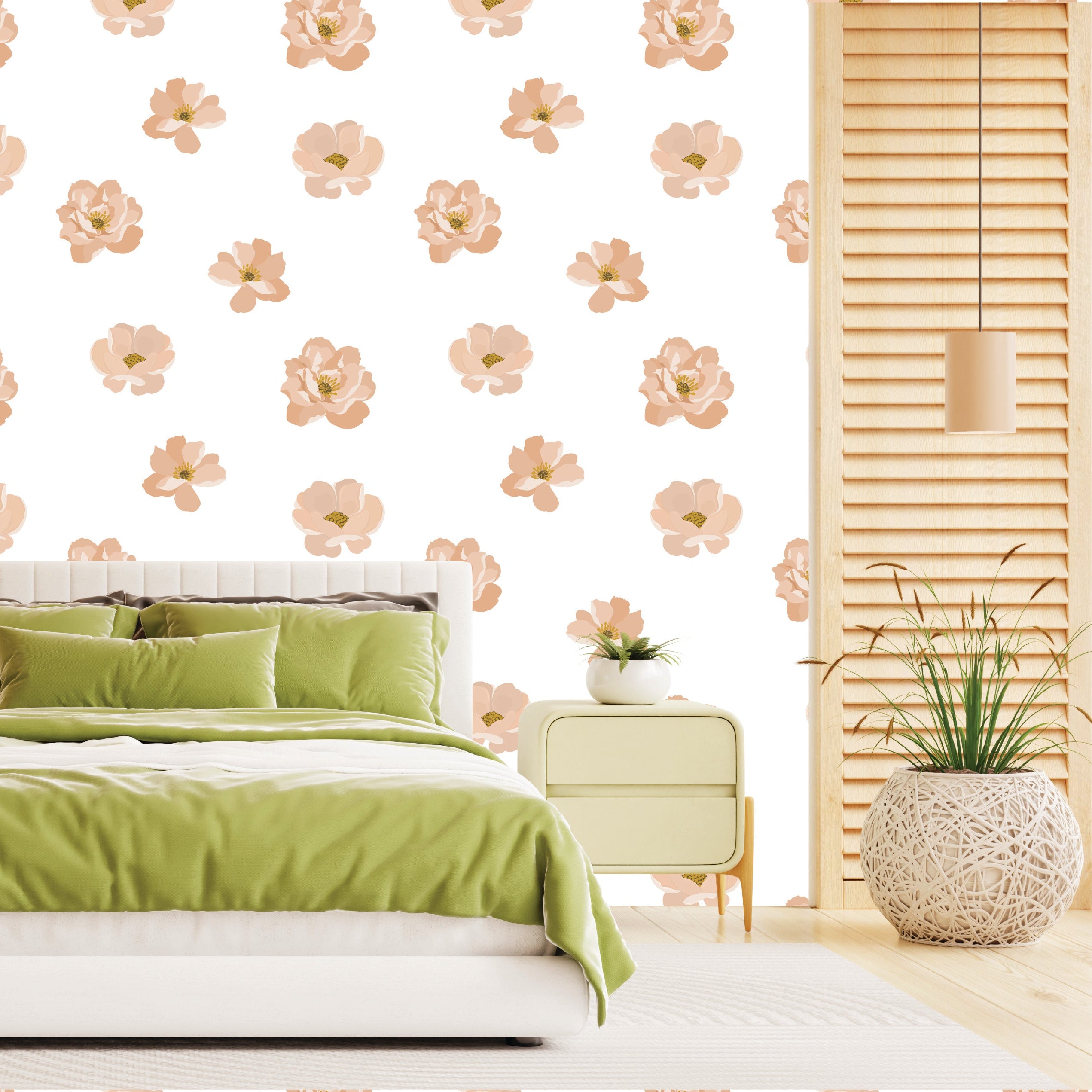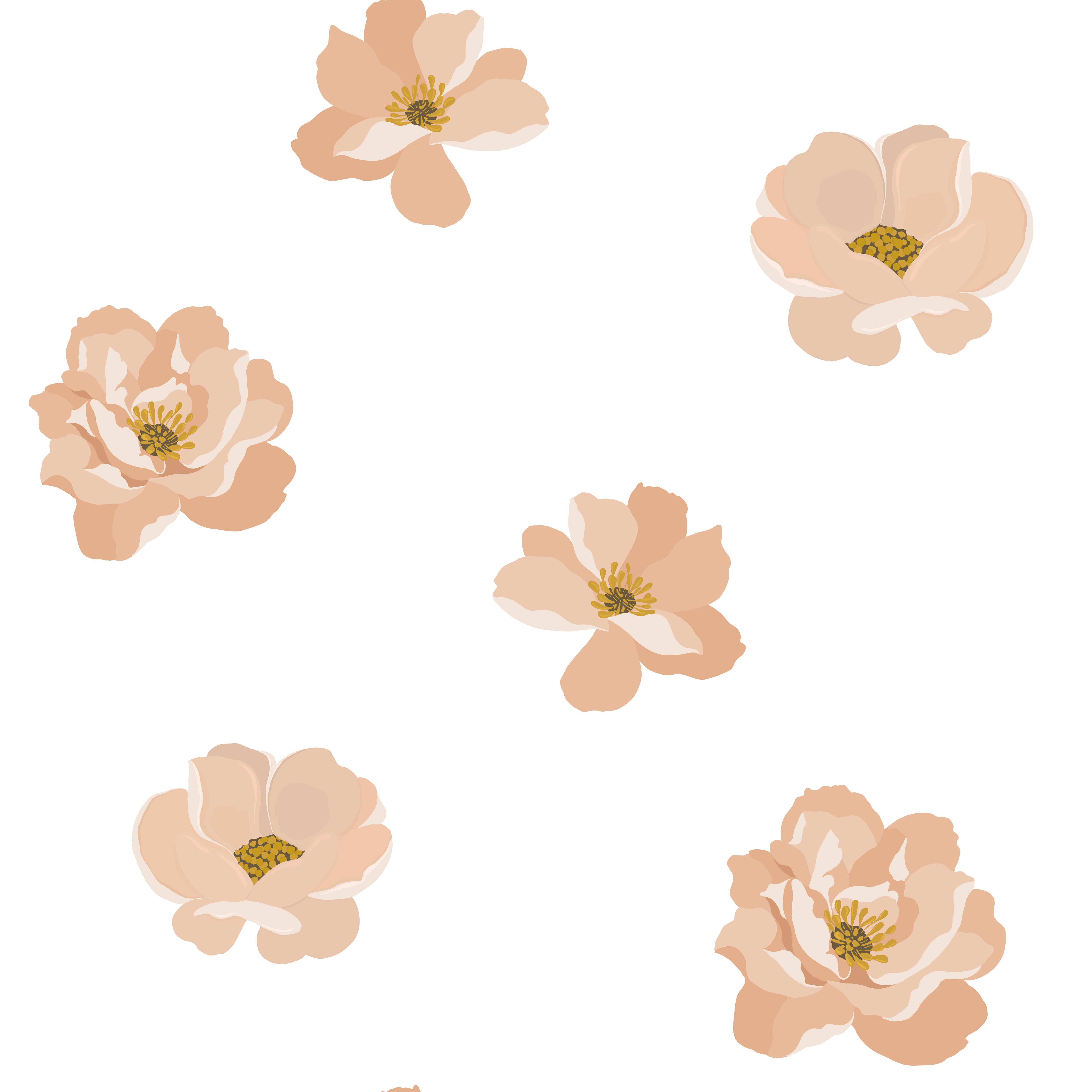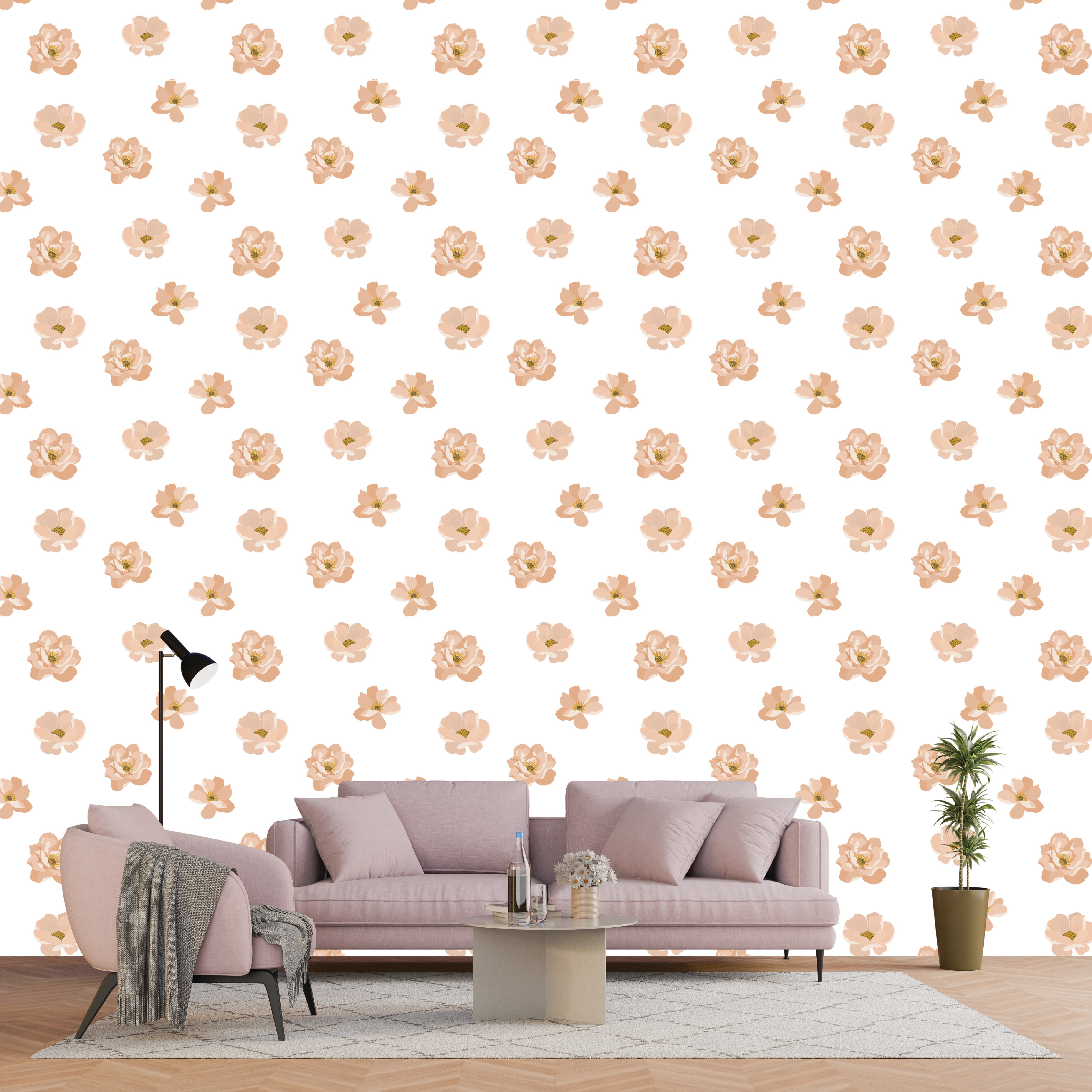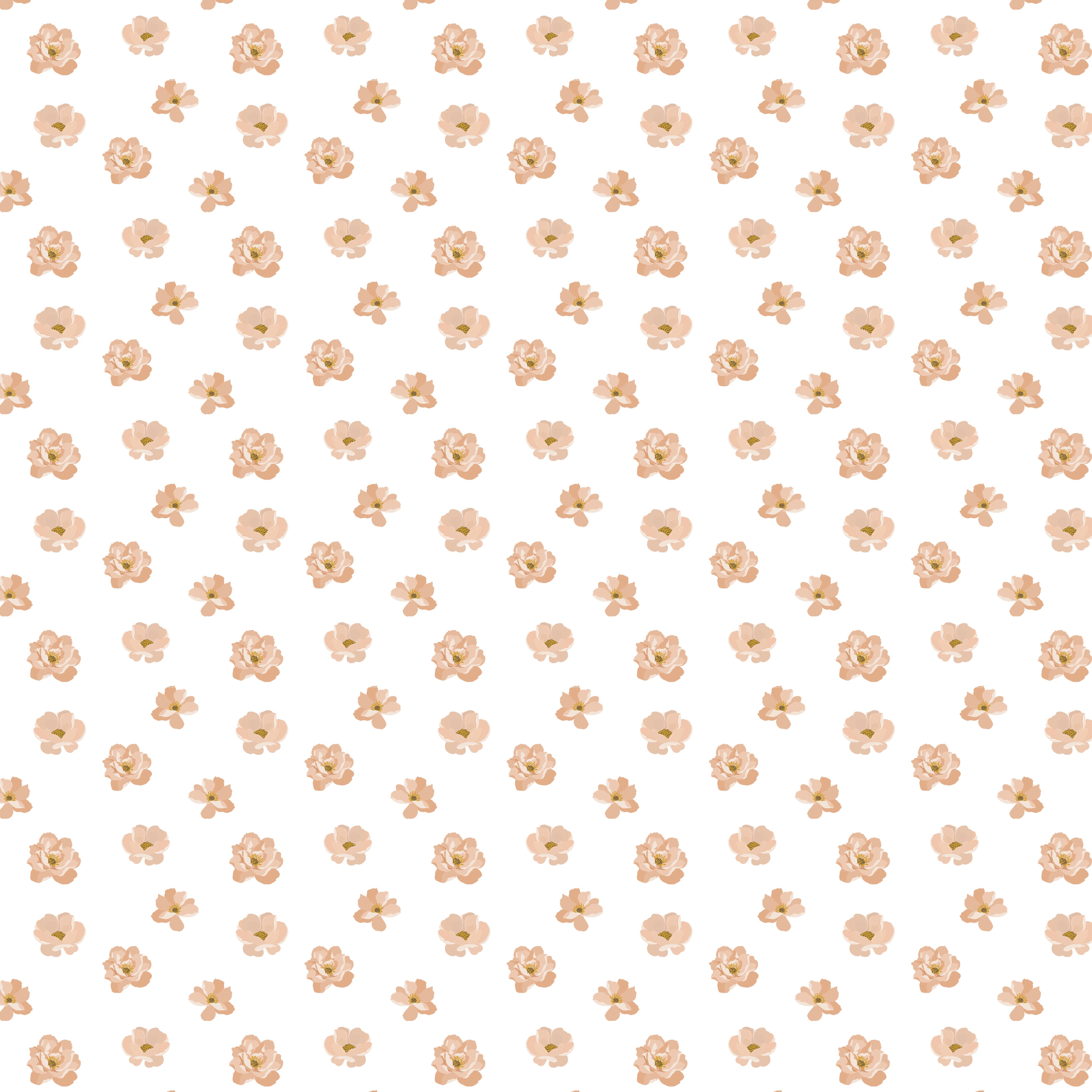 A soft, romantic design featuring petite, peach-toned blooms scattered across a clean white backdrop. Perfect for creating a serene and inviting atmosphere.