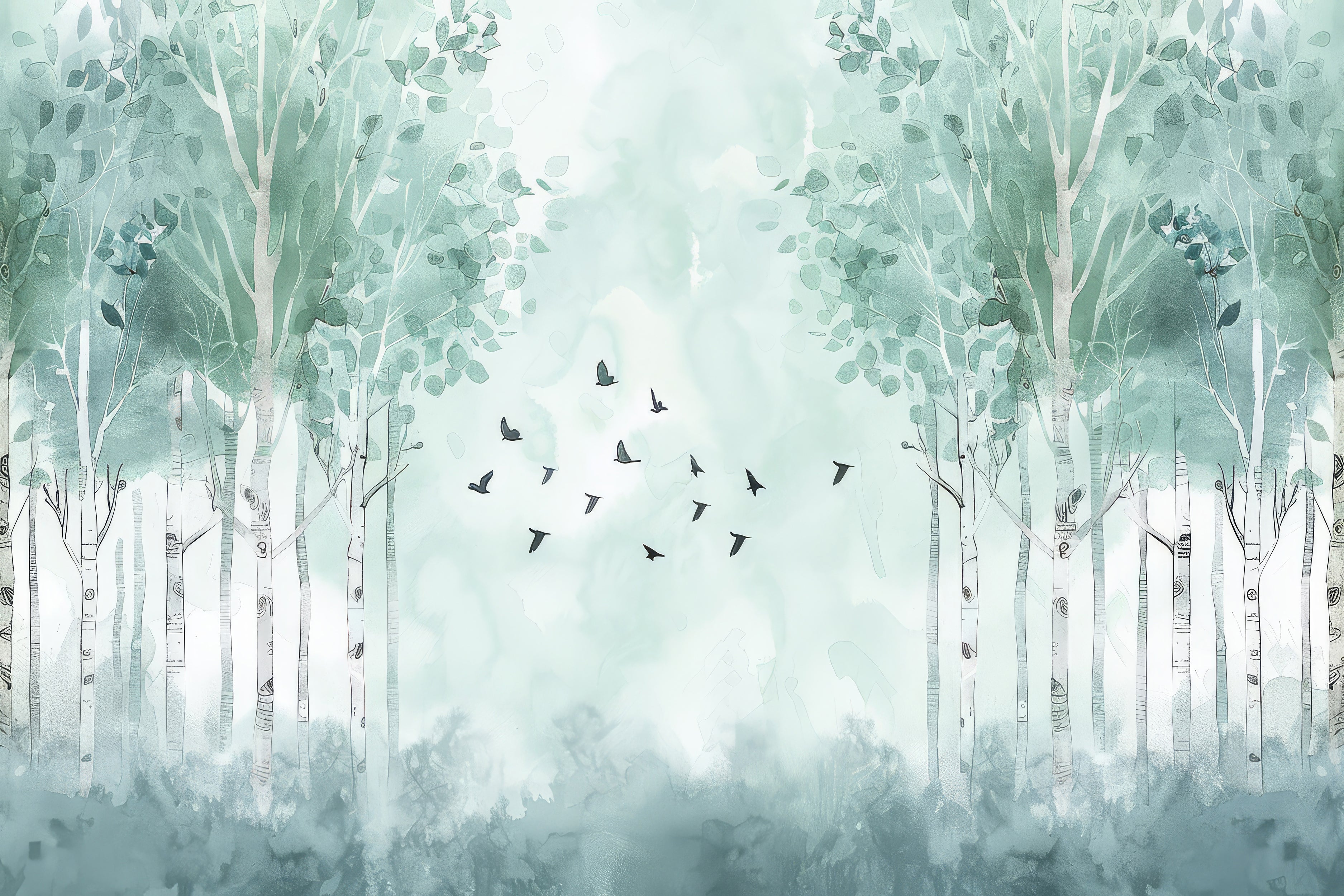 An abstract depiction of a forest with a radiant sun shining behind, and a flock of birds gracefully taking flight.